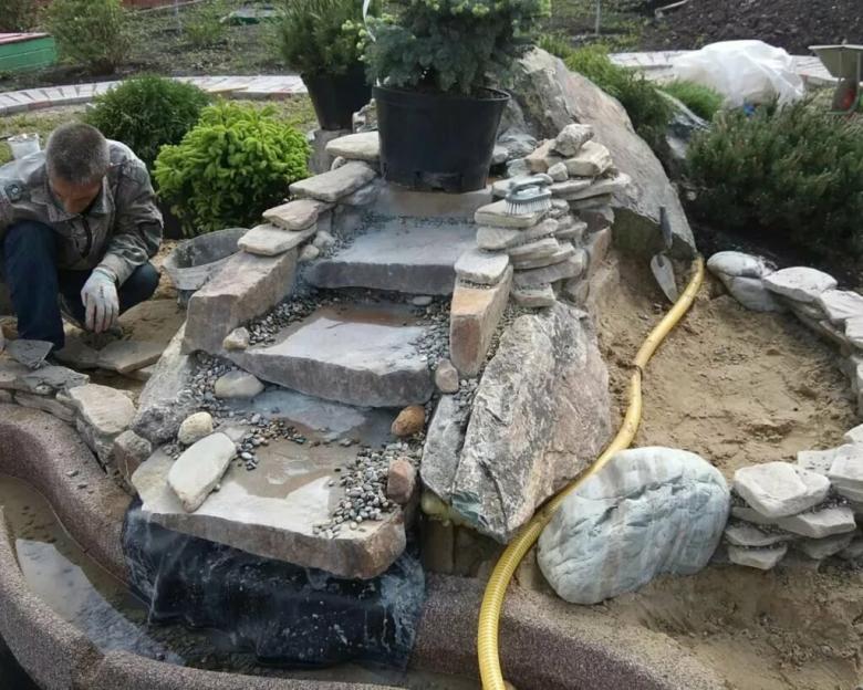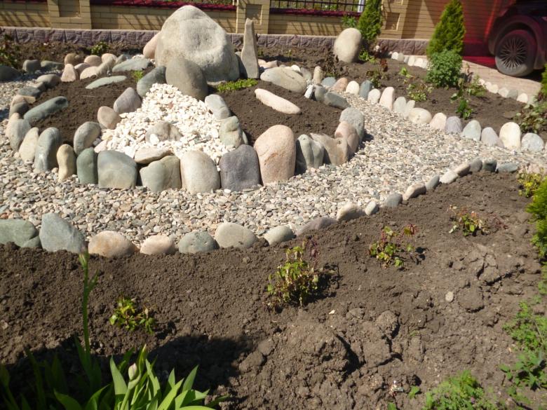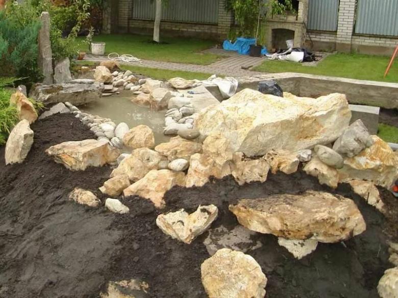 Après avoir remblayé l'excavation avec 30-40 cm de terre, les éléments en pierre peuvent être distribués. Il faut d'abord placer les gros blocs, puis les pierres de taille moyenne, et ensuite seulement verser les galets, en laissant suffisamment d'espace pour les plantations dans la zone allouée.
