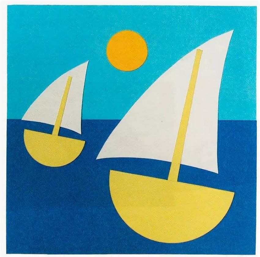 - La base est collée. Du sable est ajouté, une petite mer de bleu sur le côté gauche, le soleil au milieu, et les nuages sont uniformément répartis ;