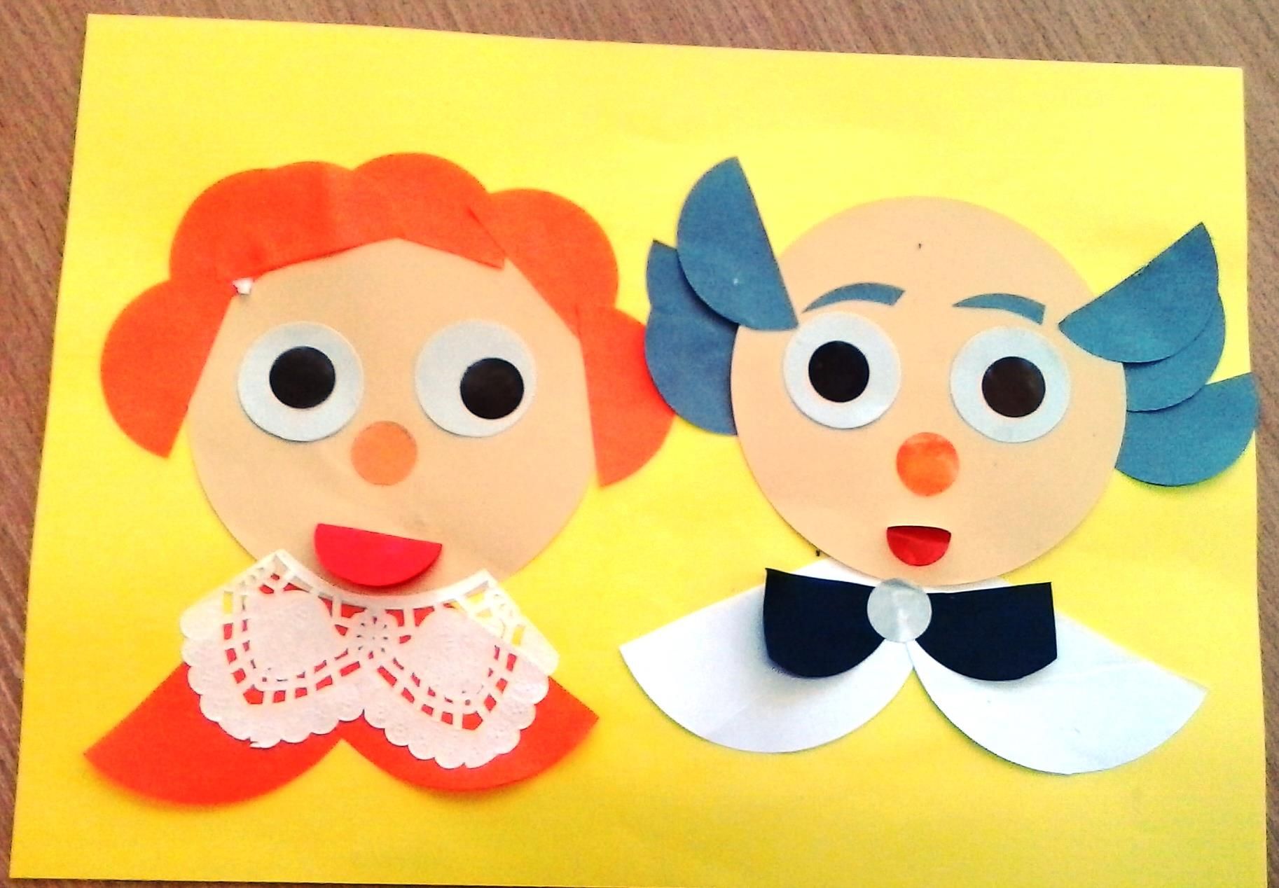 L'application du visage émotionnel d'une personne sera intéressante pour les enfants de 4-5 ans. Pour ce travail, vous devrez préparer à l'avance des modèles d'yeux, de bouche, exprimant différentes émotions - colère, joie, tristesse. Vous aurez également besoin d'un visage humain en papier pour l'application. Un nez peut y être pré-dessiné.