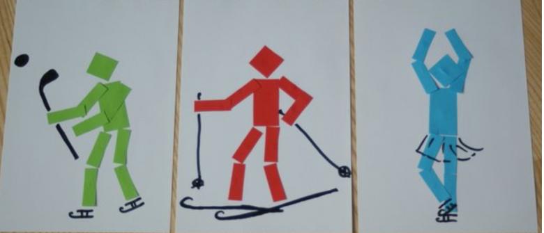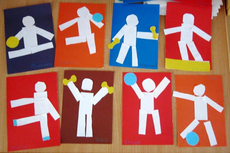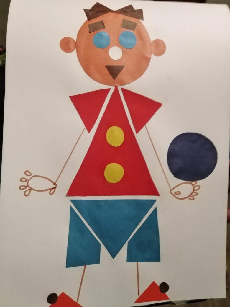La complexité du travail dépend du nombre de pièces et d'éléments utilisés. La variante la plus simple consiste à proposer à un enfant de disposer les figurines de manière à ce que le corps, la tête, les bras et les jambes soient bien visibles. Utilisez un rectangle (silhouette de garçon) ou un triangle (silhouette de fille) comme corps. La tête est remplacée par un cercle. Les mains et les pieds sont réalisés à partir de rectangles fins.