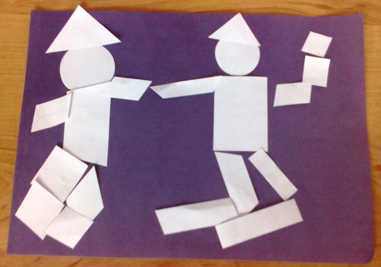 - L'enfant prend les gabarits préparés et les dispose dans la bonne pose sur le carton. Si la figure est correcte, il/elle colle les rectangles avec de la colle.