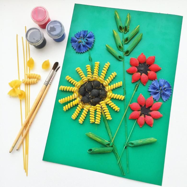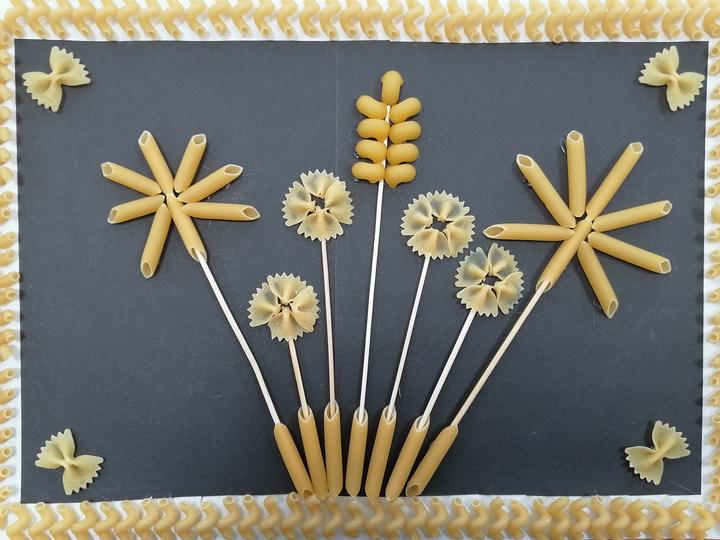 - Utilisez les pâtes plus petites pour créer les fleurs, puis collez-les.