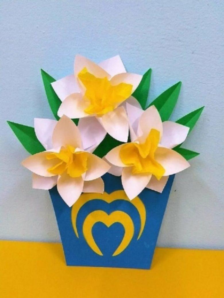 L'application la plus populaire pour le 8 mars est un vase avec des fleurs. L'une des façons les plus simples est de le créer à partir de papier de couleur sous la forme d'une œuvre standard ou volumétrique. Très belle composition de look pour cette fête faite de boules de papier en forme de bouquet de mimosa ou de muguet.