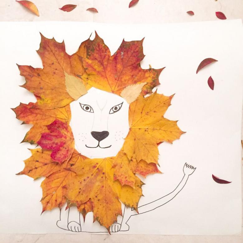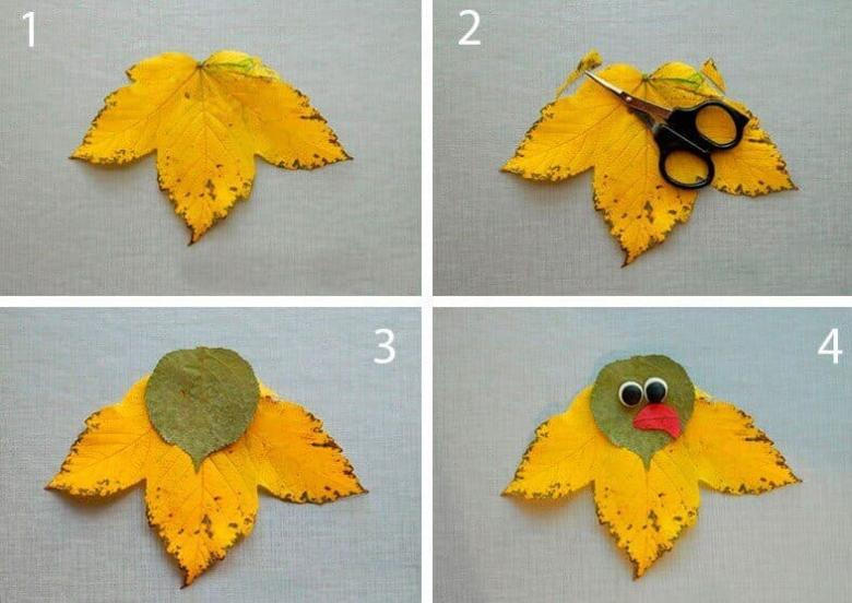 - Une feuille d'érable rouge renversée ressemble au museau d'un renard rusé. Il ne reste plus qu'à la décorer avec un cercle de nez et d'yeux et des oreilles triangulaires ;