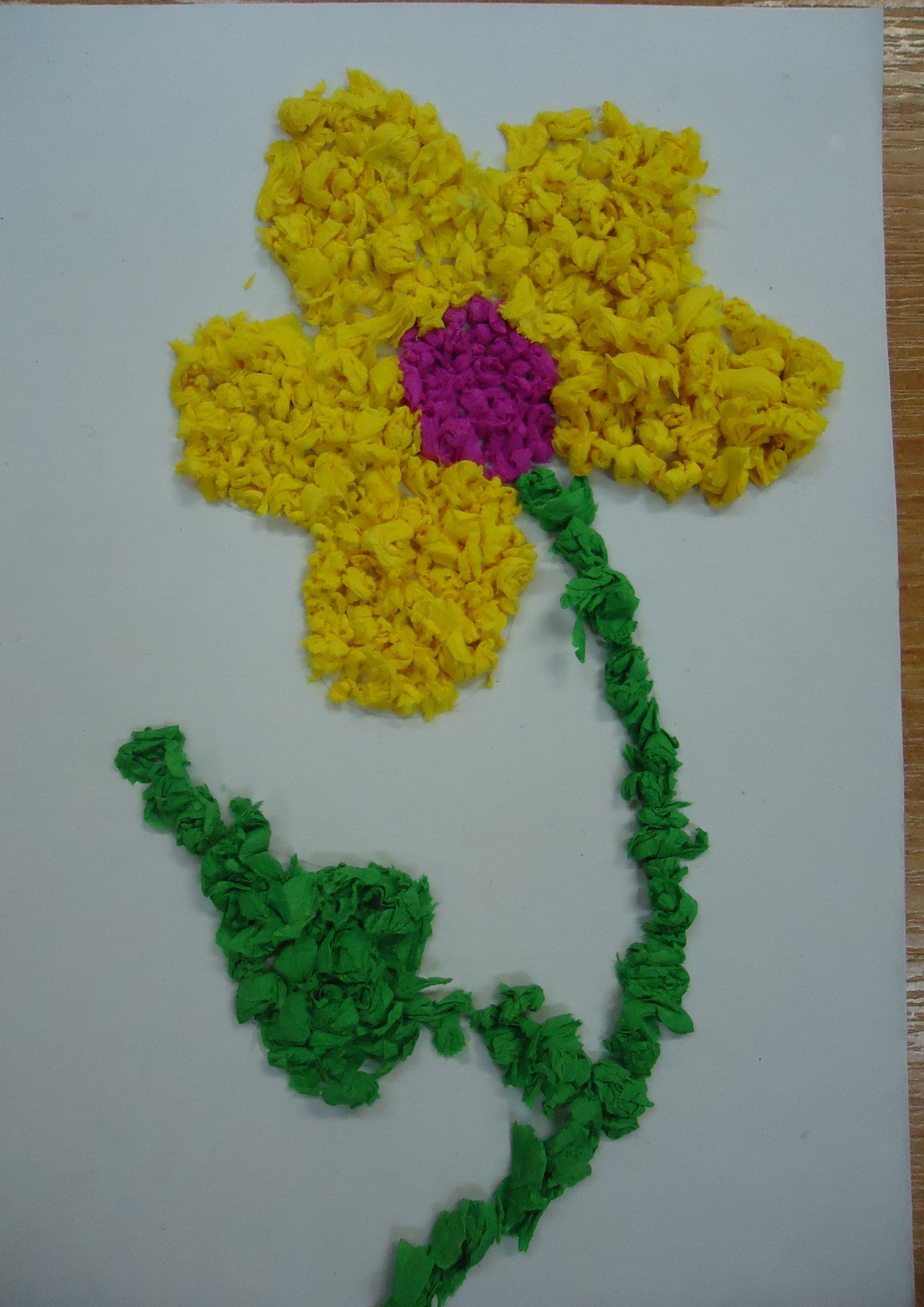 - Montage. Collé sur une tige de carton. Sur le côté de lui - de la verdure. Complète l'application fleur jaune vif.
