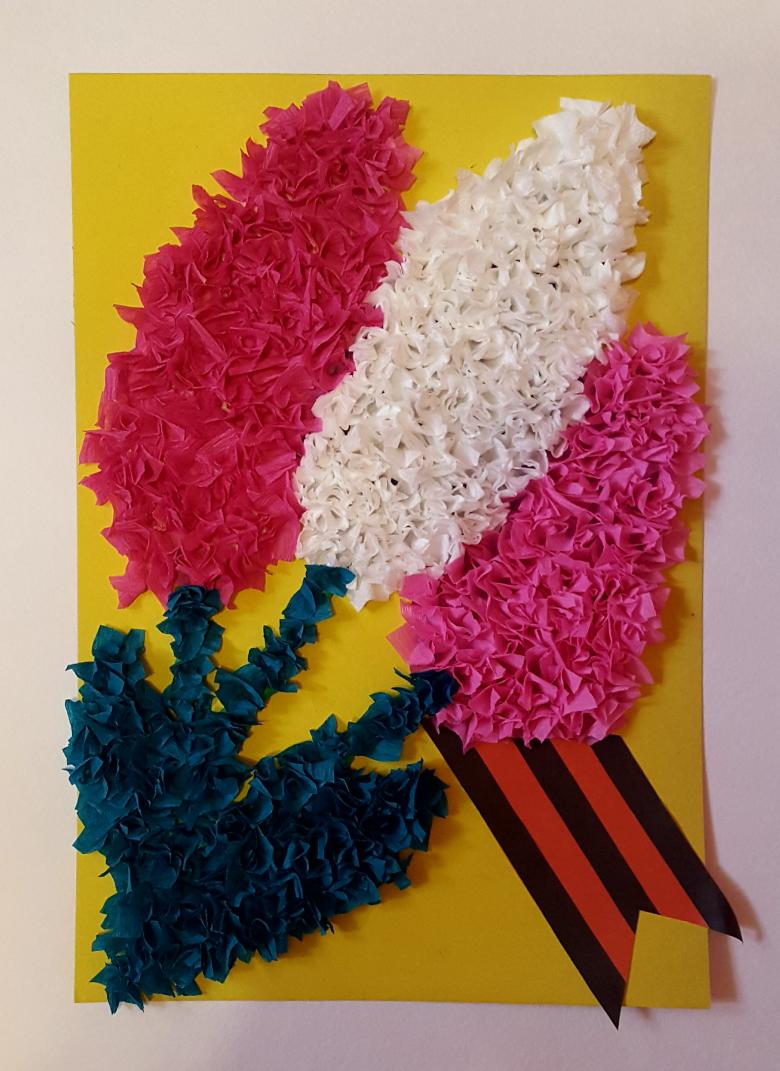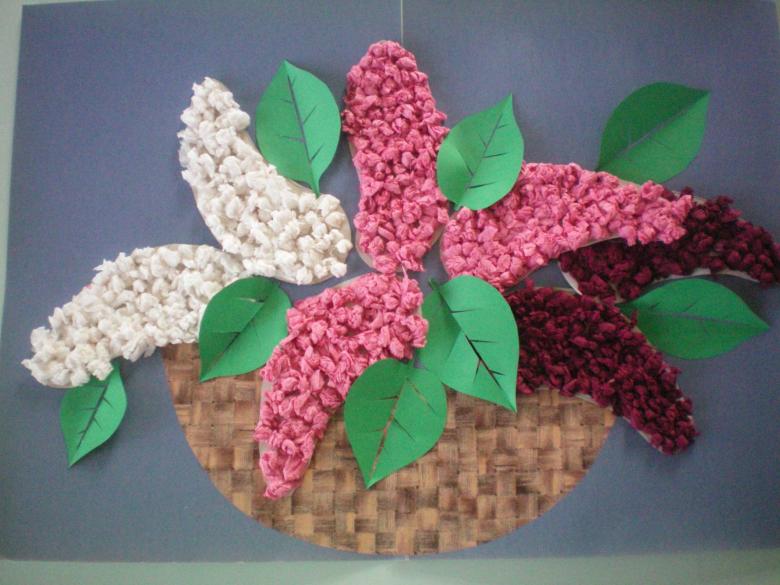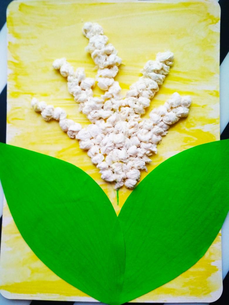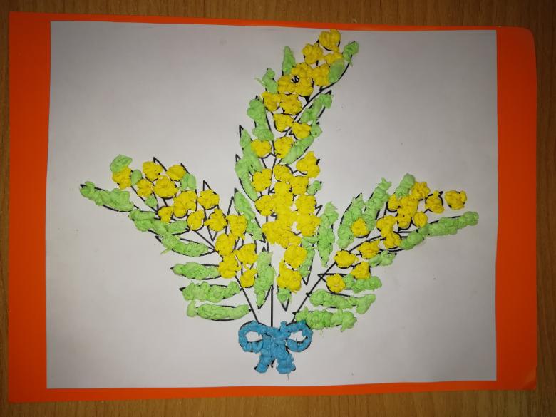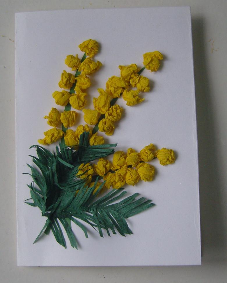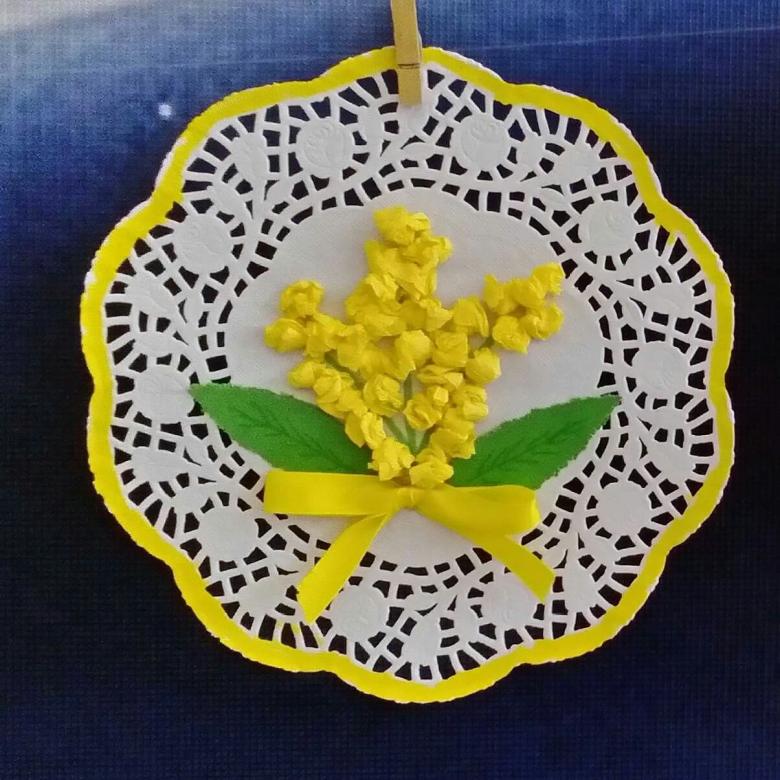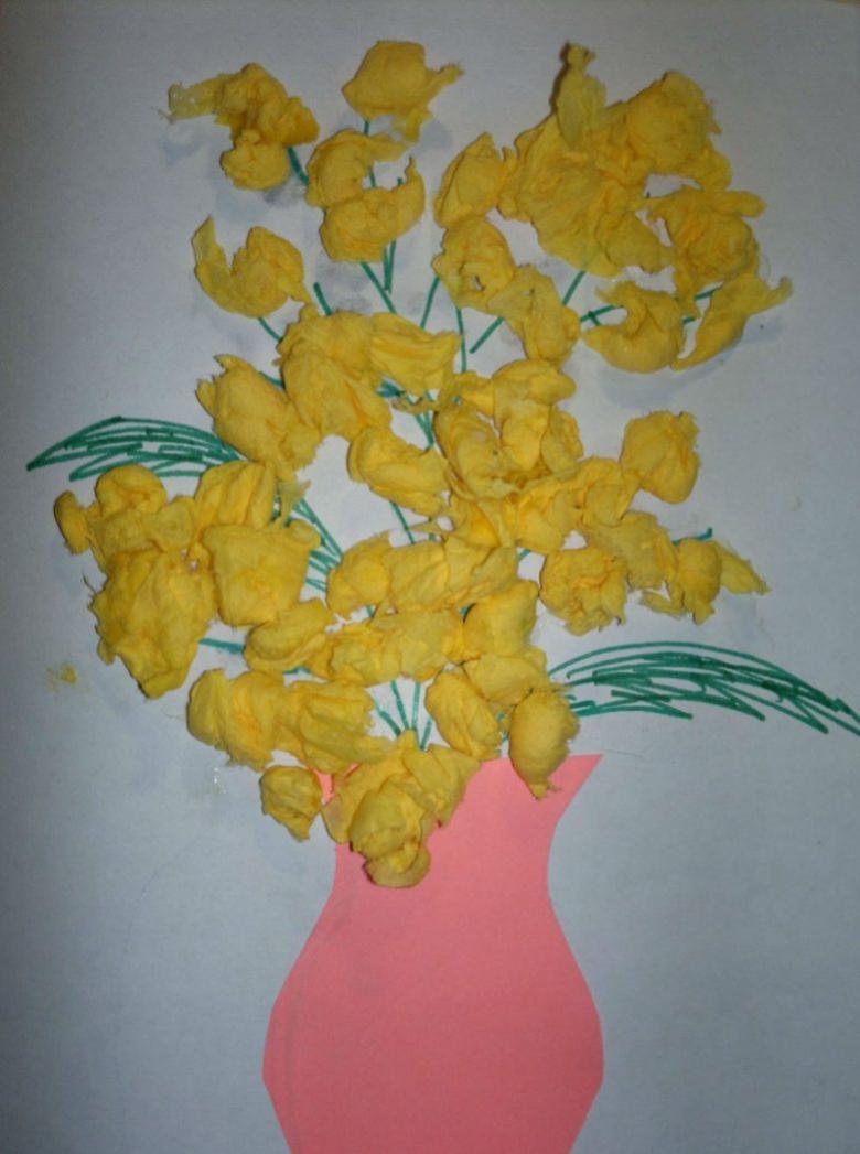 Pour les plus jeunes, une applique de serviette mimosa est une bonne idée. Ce thème sera le plus pertinent au printemps ou à la veille du 8 mars. Ce travail laisse place à la créativité. Selon l'âge des enfants, le vase et les feuilles de la plante peuvent être dessinés au crayon ou collés à partir de papier de couleur.