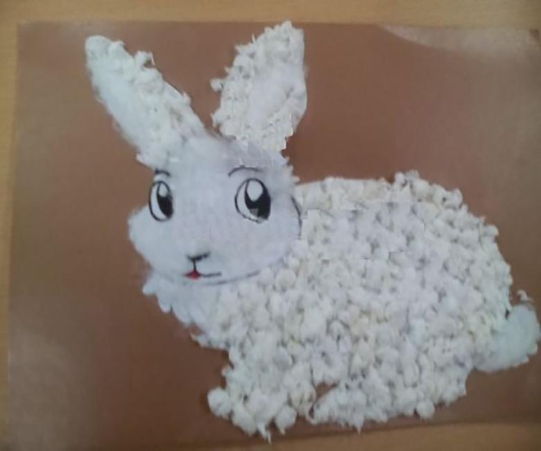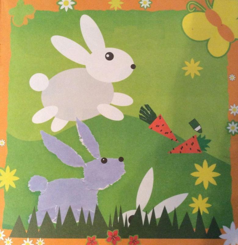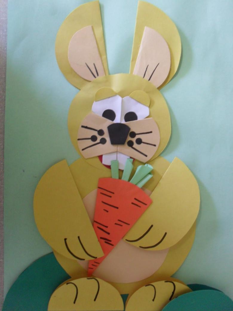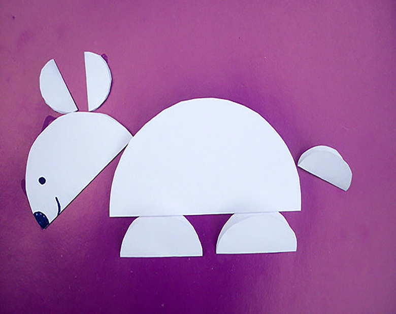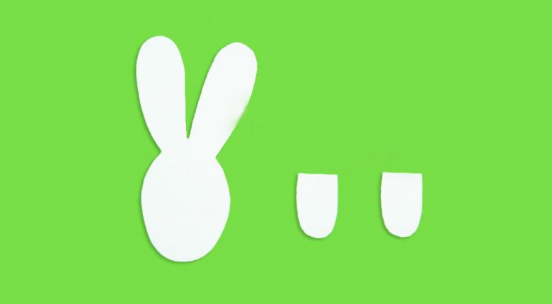 - Découpez des morceaux de papier de couleur : deux longues oreilles blanches, deux inserts roses (légèrement plus petits que l'oreille), des dents blanches, un nez, des joues, des yeux en papier (la pupille doit être dessinée avec un feutre noir), deux pattes.