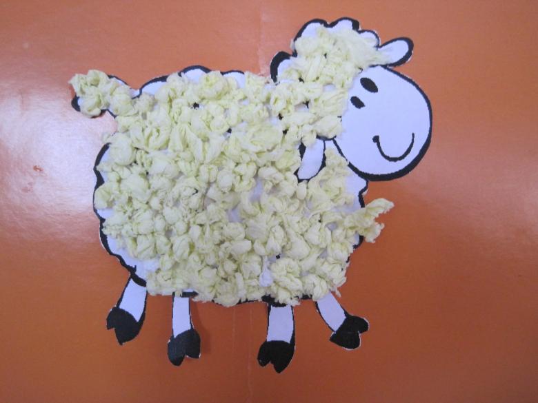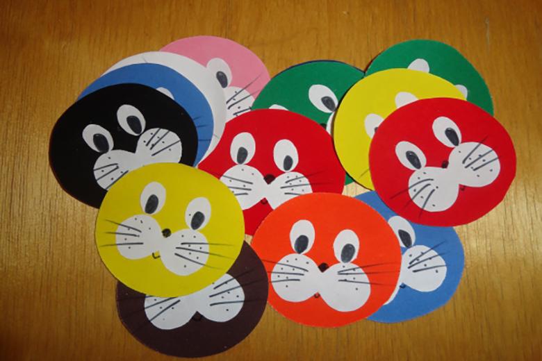 - Découpez dans du papier blanc un cercle de la même couleur d'environ 6 cm de diamètre, de petites oreilles arrondies, une queue, deux yeux.
