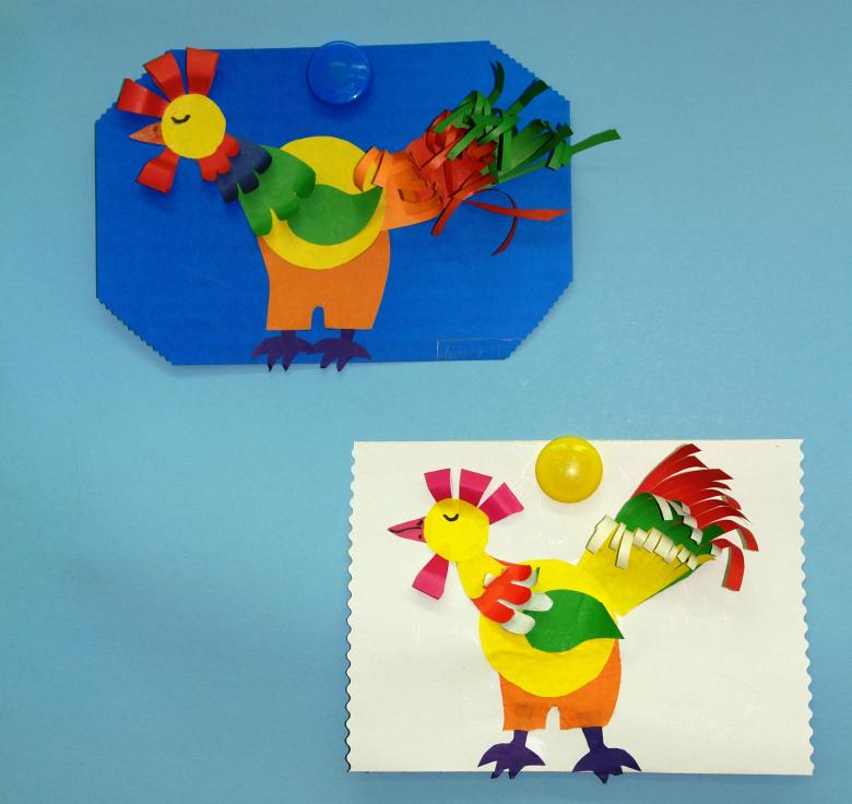 Les objets artisanaux fabriqués à partir de bandes de papier sont faciles à réaliser et colorés. Pour réaliser une telle applique, vous aurez besoin de : du carton double face de deux couleurs (il peut y en avoir plus si vous le souhaitez), du carton ou du papier foncé pour le nez, une teinte rouge pour le col, des ciseaux, un simple crayon, de la colle, un marqueur, un bouton ou une perle à but décoratif.