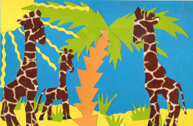 - Colle les parties obtenues sur la feuille jaune, en suivant la séquence : collines, soleil, base du palmier, feuilles au sommet. Ensuite, une girafe (ce sera mieux s'il s'agit d'une famille de girafes où un animal est plus petit).