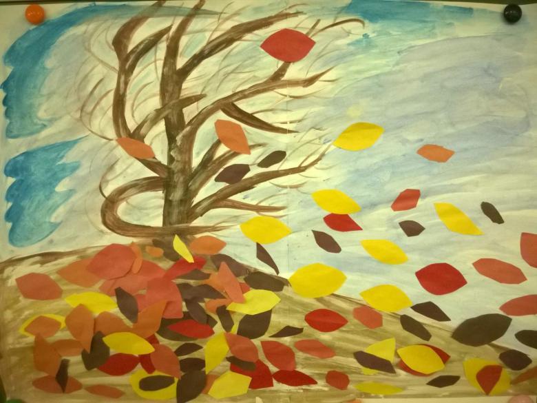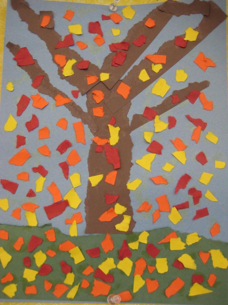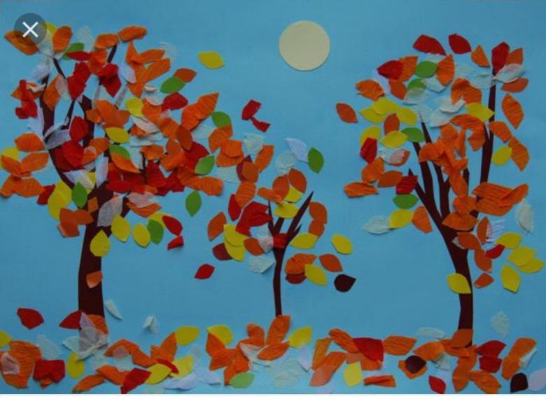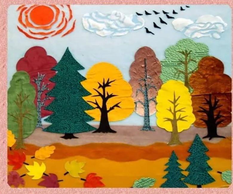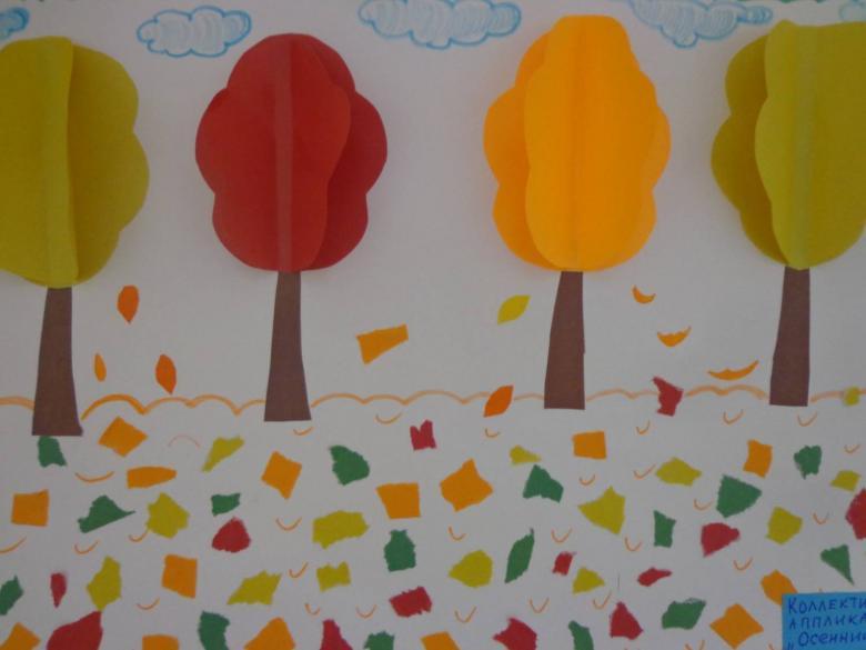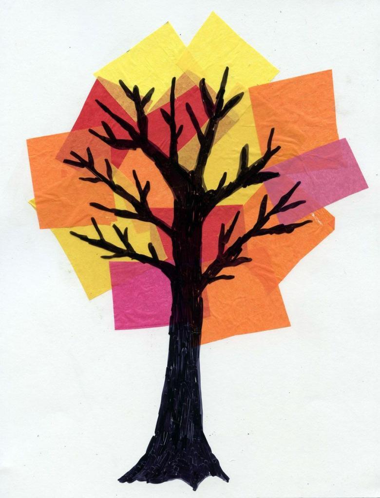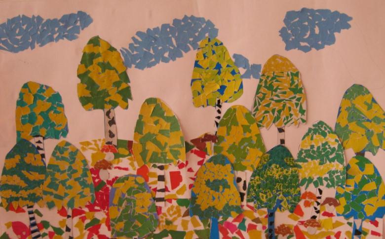 L'idée est que tous les objets représentés sont faits de papier de couleur finement déchiré. Même un enfant d'âge préscolaire peut réaliser ce bricolage :
