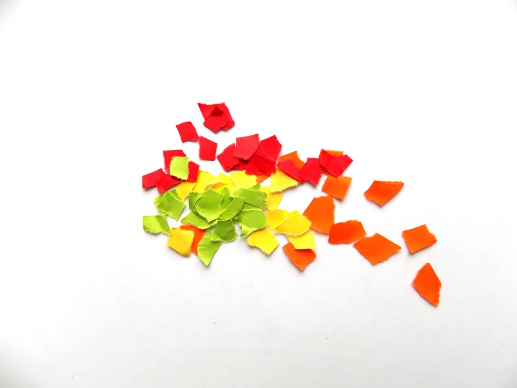 - Pour ce faire, prenez le papier rouge et orange et déchirez-le en petits morceaux de taille égale. Ne déchirez pas trop de feuilles en même temps afin de ne pas laisser de morceaux supplémentaires.
