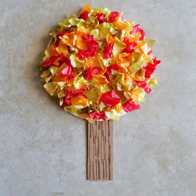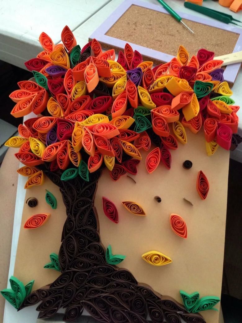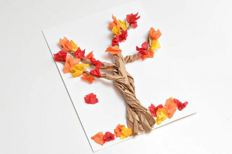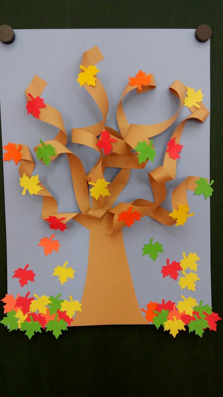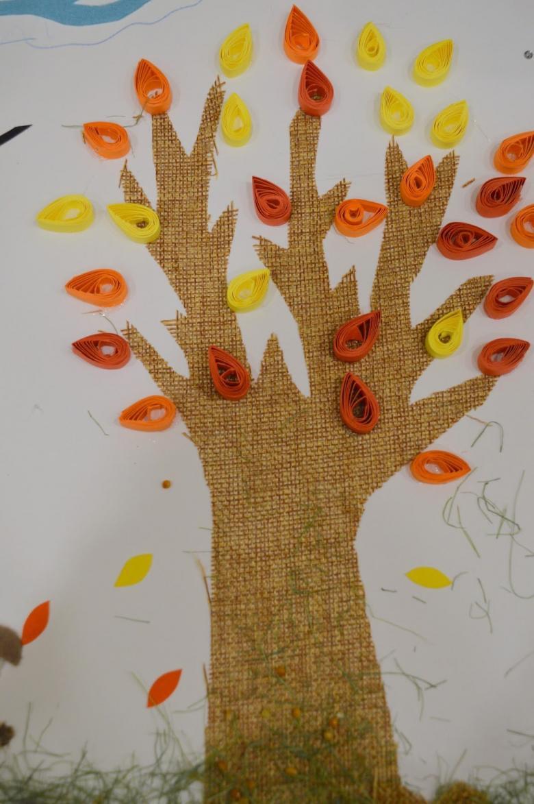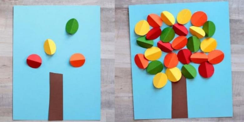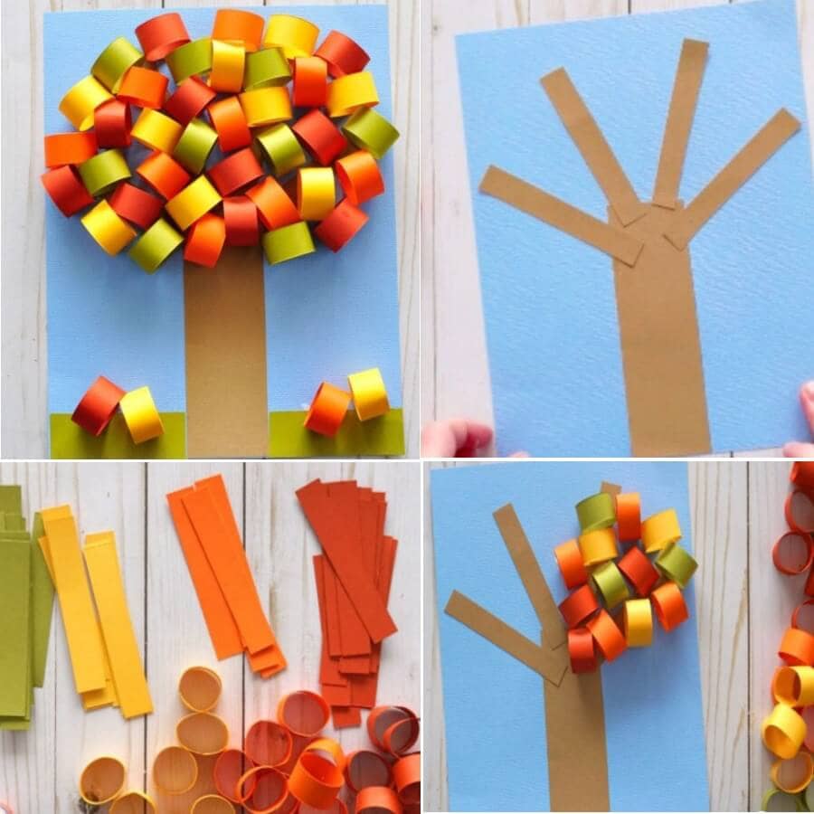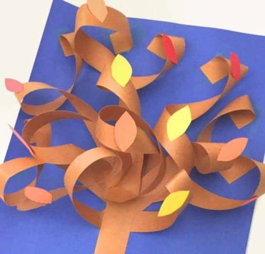 Découpez des feuilles de papier de couleur en fines bandes de petite longueur. Collez-les ensemble en anneaux. Collez le tronc découpé fini sur la base. Formez le feuillage sur le tronc à partir des anneaux.