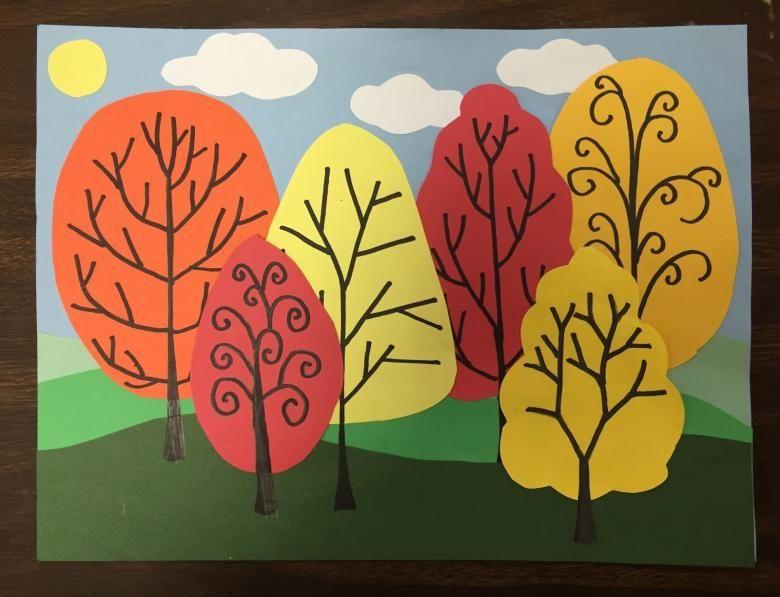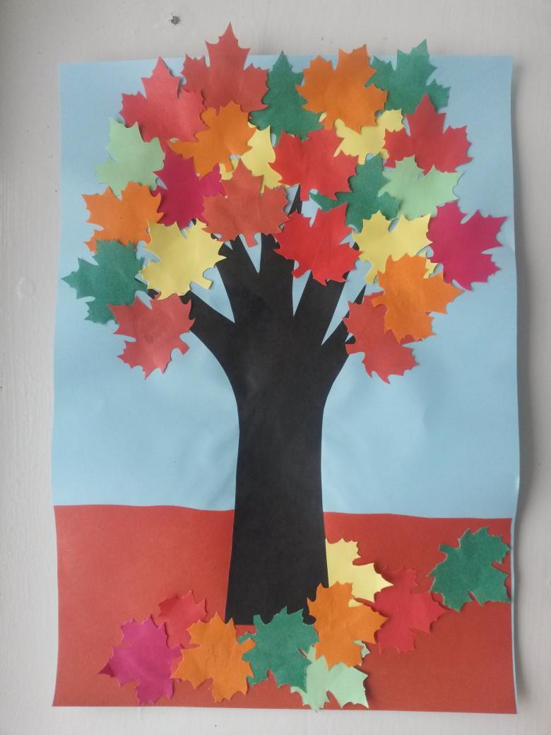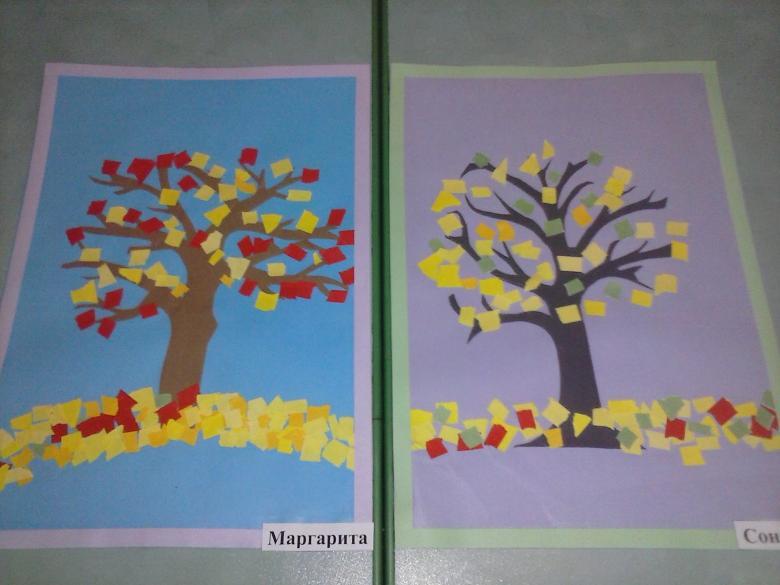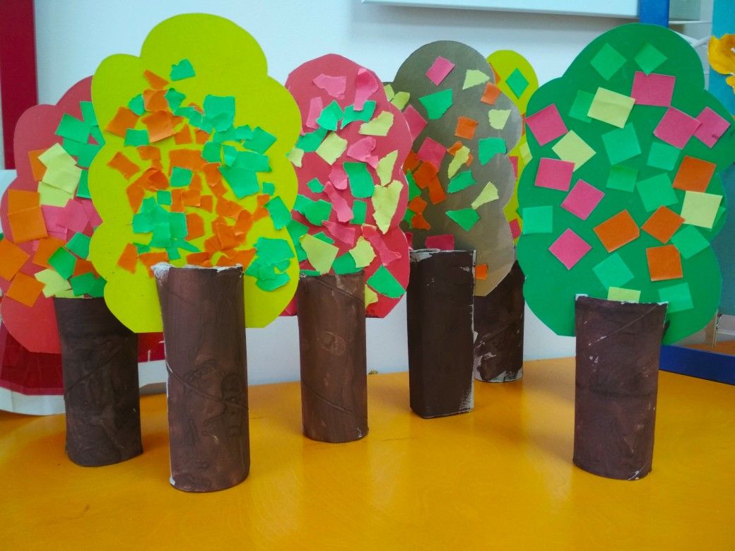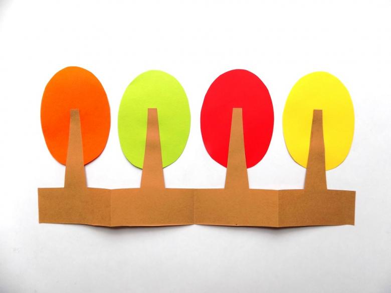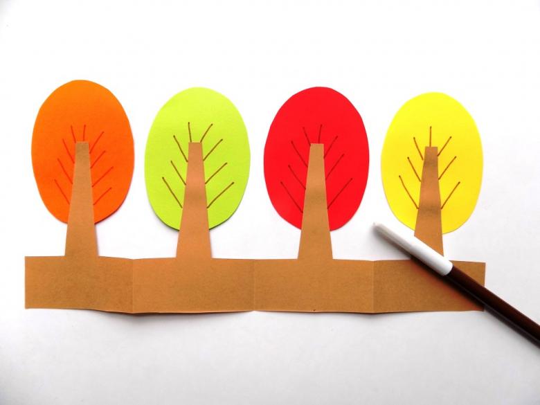 - Dans des feuilles de papier de couleur, préparez des troncs d'arbre et collez-les juste en dessous de la couronne.