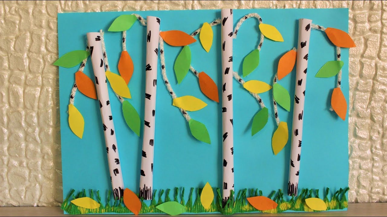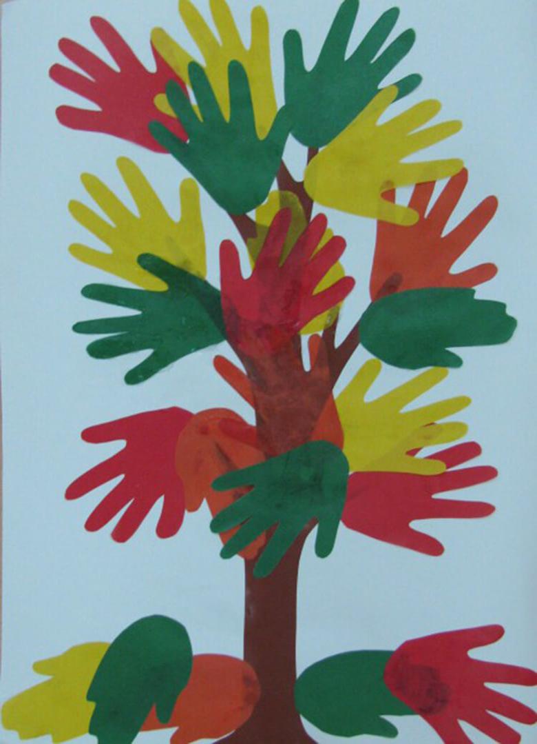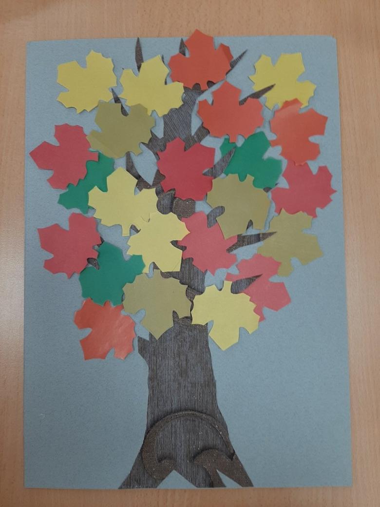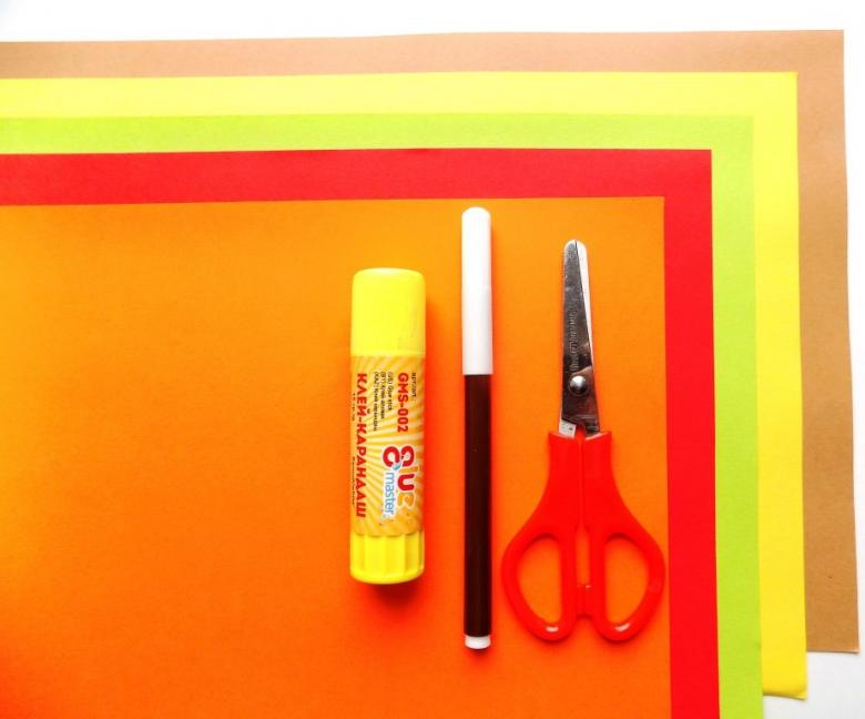 - Dans des feuilles de papier de couleur, préparez des troncs d'arbre et collez-les juste en dessous de la couronne.