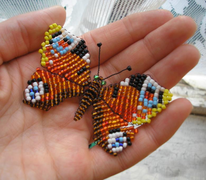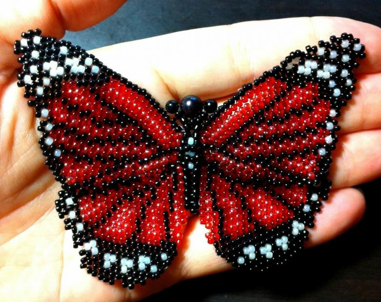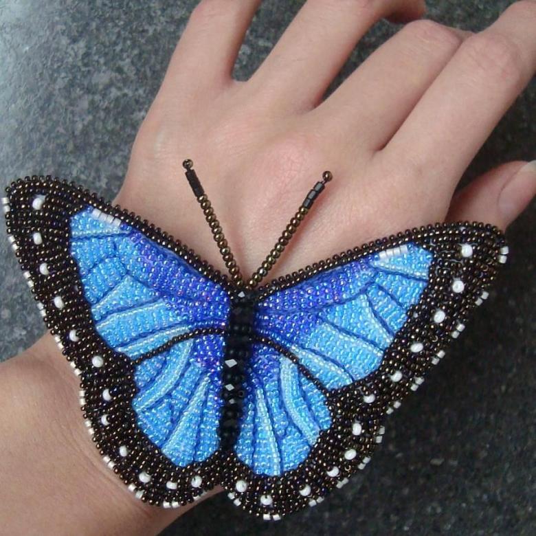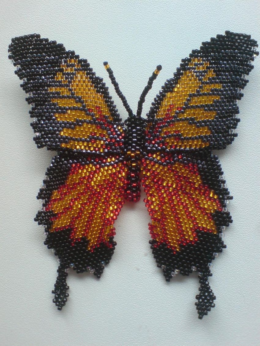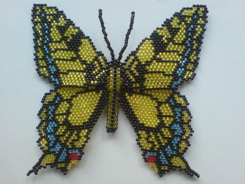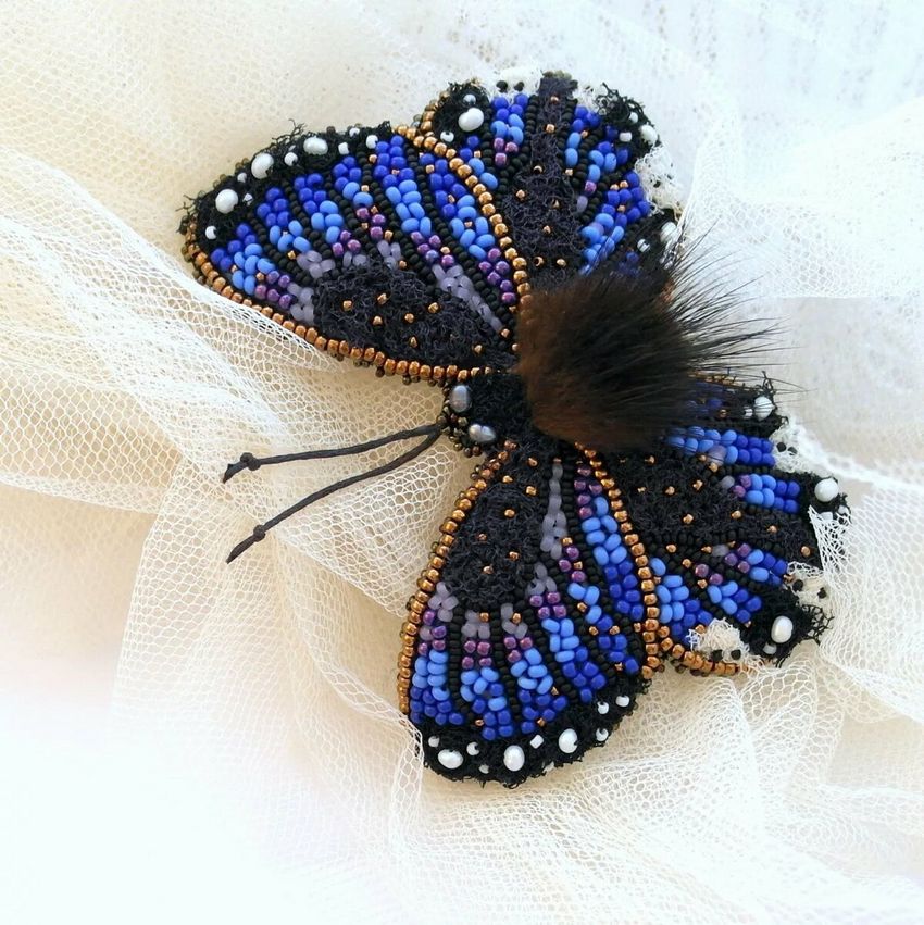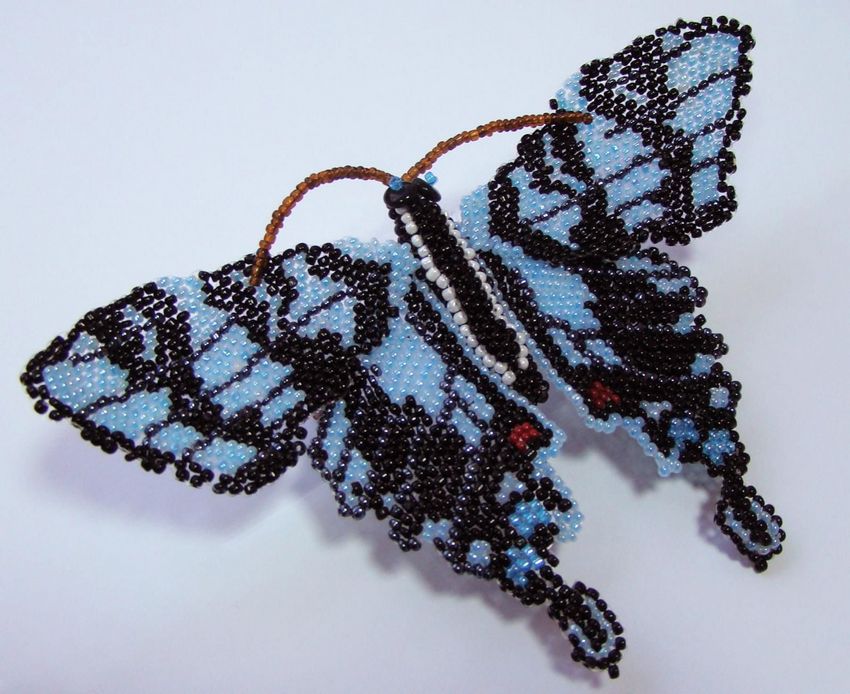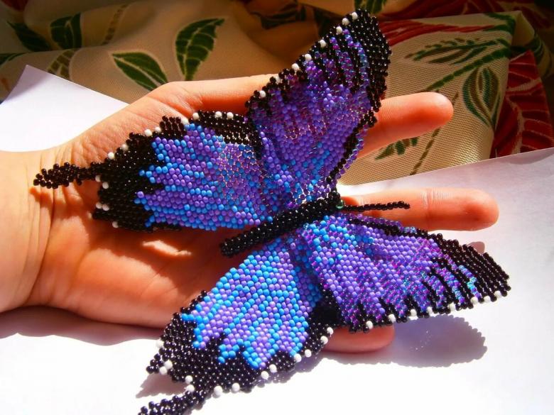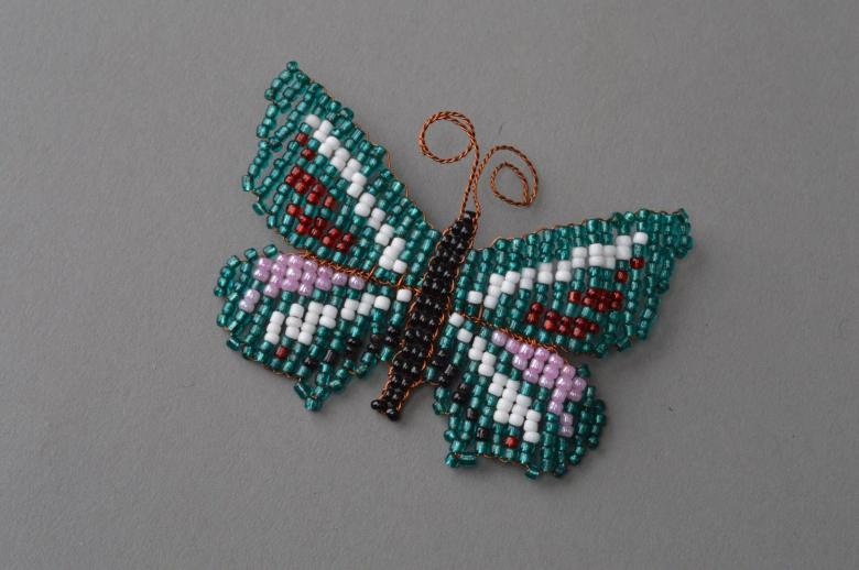 Pour réaliser une broche tridimensionnelle à la mode à partir d'un papillon perlé, on peut y fixer un fermoir. Un insecte perlé peut être attaché à une simple épingle à cheveux. Vous pouvez également fabriquer un élastique et le décorer avec un papillon coloré et volumineux.