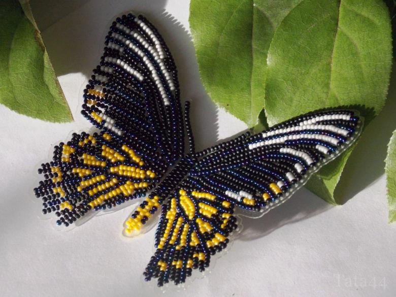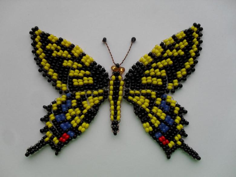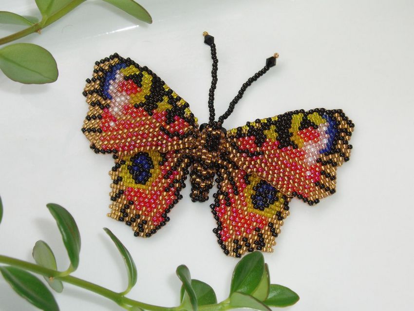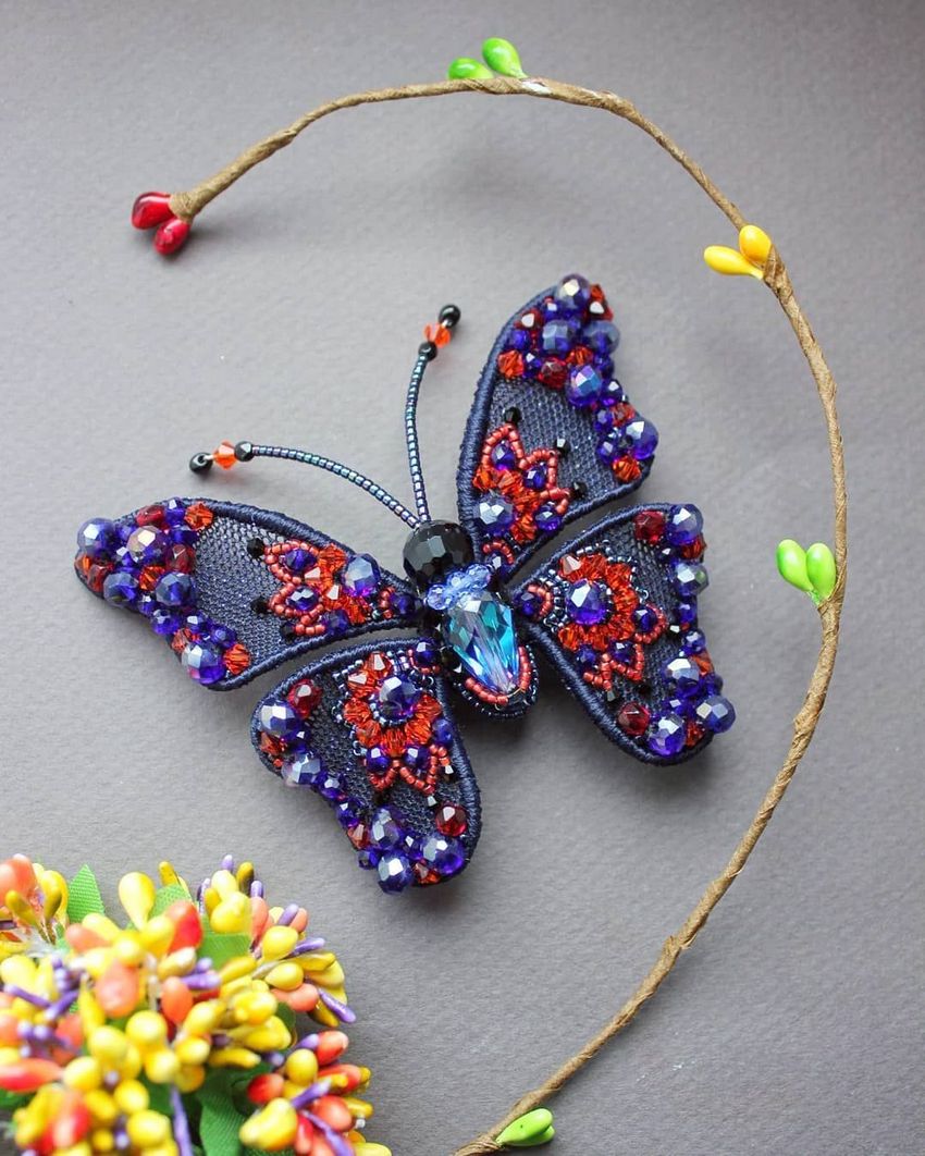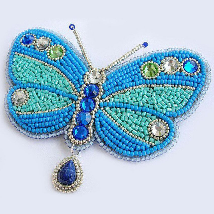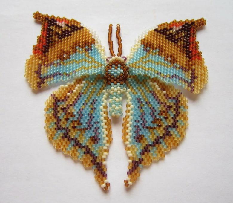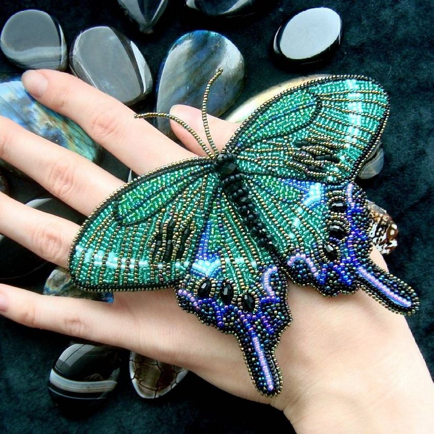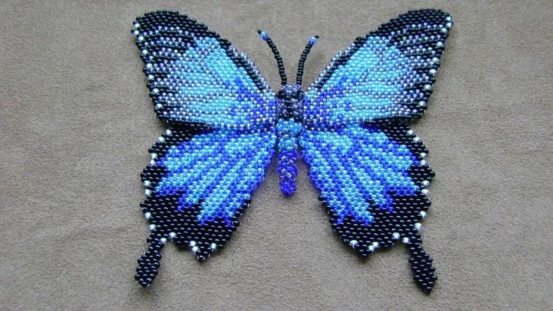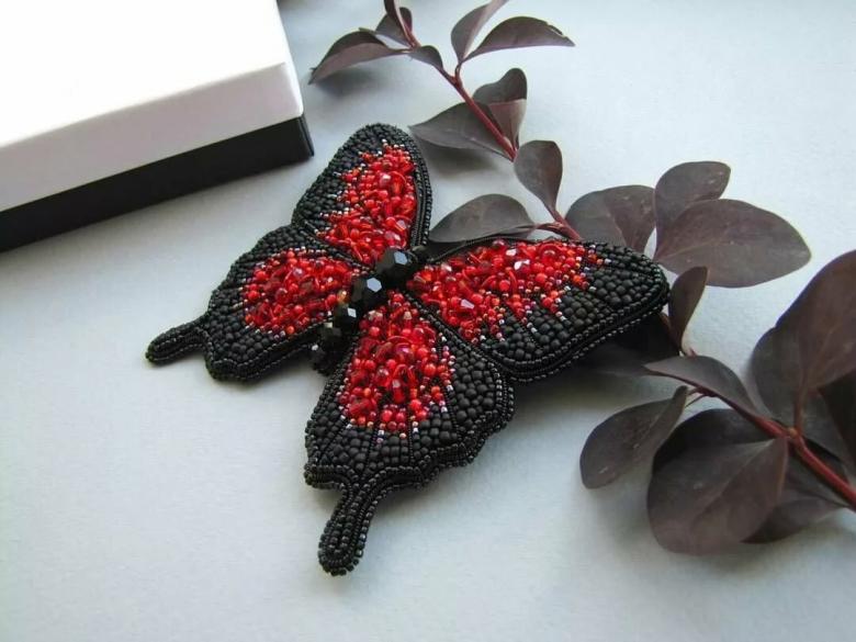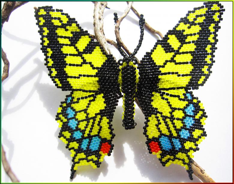 Pour réaliser une broche tridimensionnelle à la mode à partir d'un papillon perlé, on peut y fixer un fermoir. Un insecte perlé peut être attaché à une simple épingle à cheveux. Vous pouvez également fabriquer un élastique et le décorer avec un papillon coloré et volumineux.