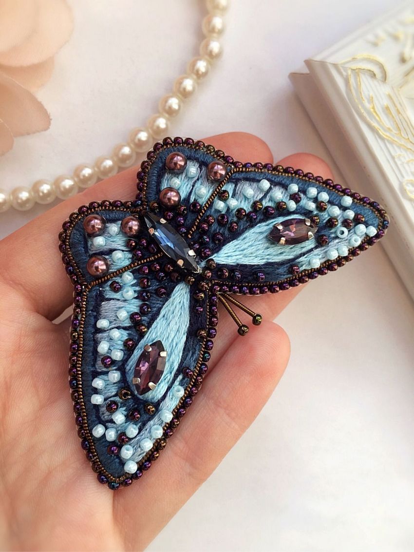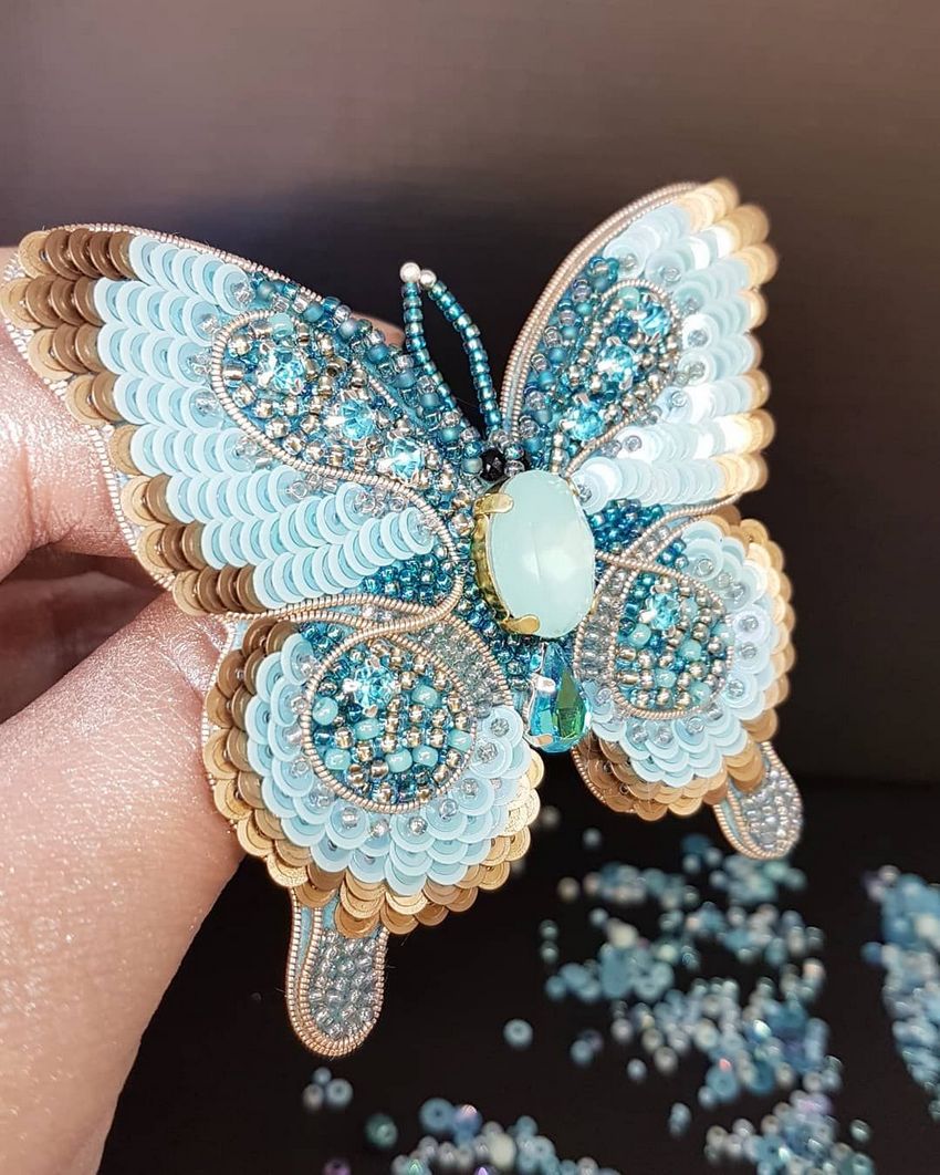 La broche papillon avec perles et paillettes est réalisée sur un matériau solide, comme la feutrine. Les paillettes françaises sont cousues sur le tissu, soit comme base pour de petites perles, soit comme éléments autonomes qui forment un motif de flocons en se chevauchant les uns les autres.
