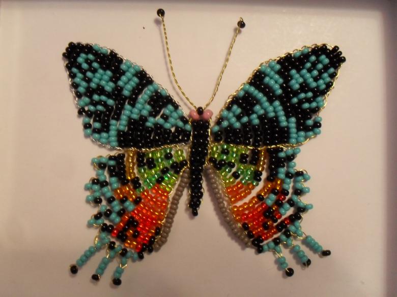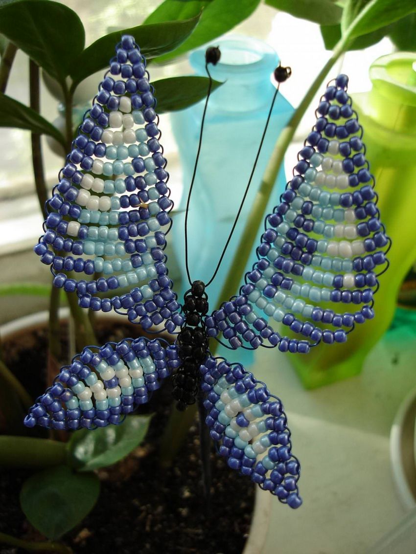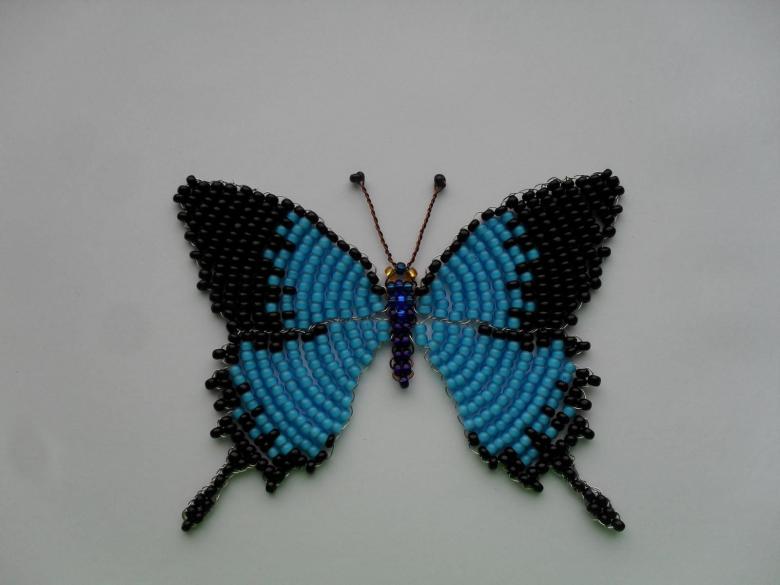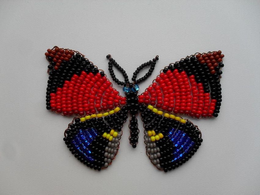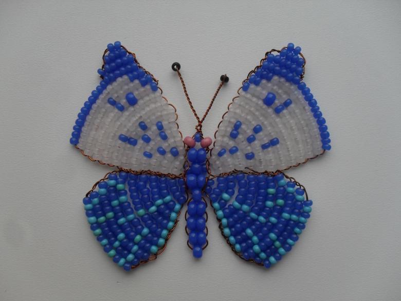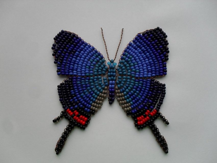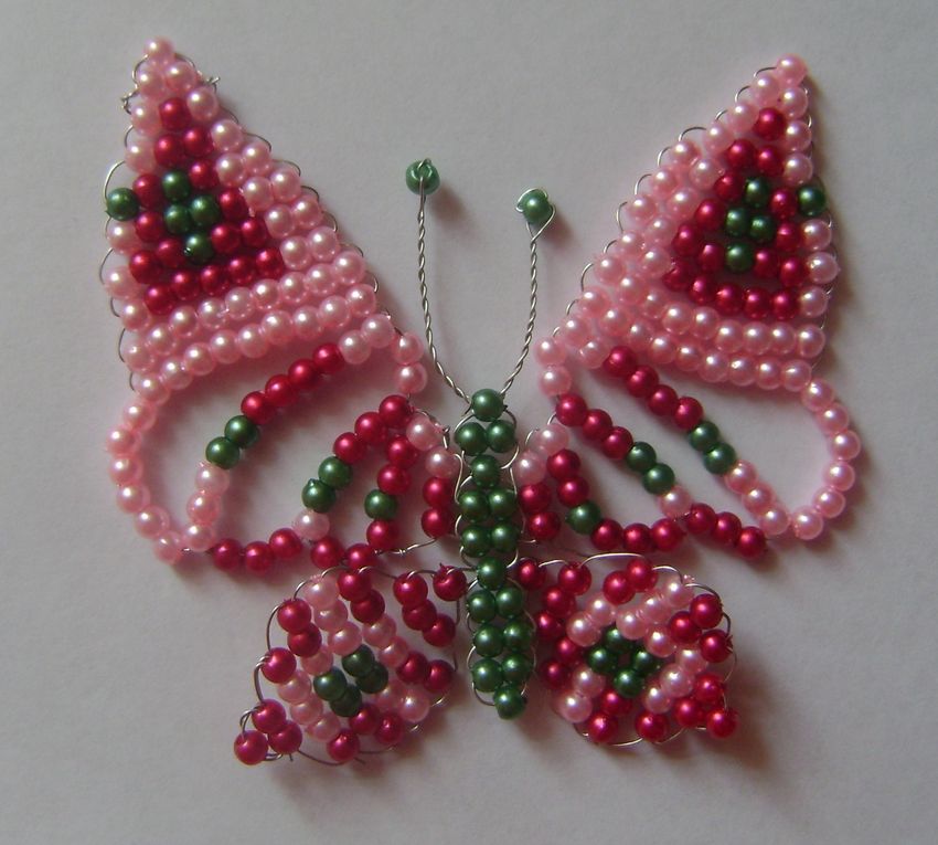 La pièce semble plate, mais si vous le souhaitez, le fil peut être légèrement plié pour donner une forme tridimensionnelle. Vous trouverez un schéma d'un papillon perlé et du fil de fer sur les pages pertinentes de l'internet