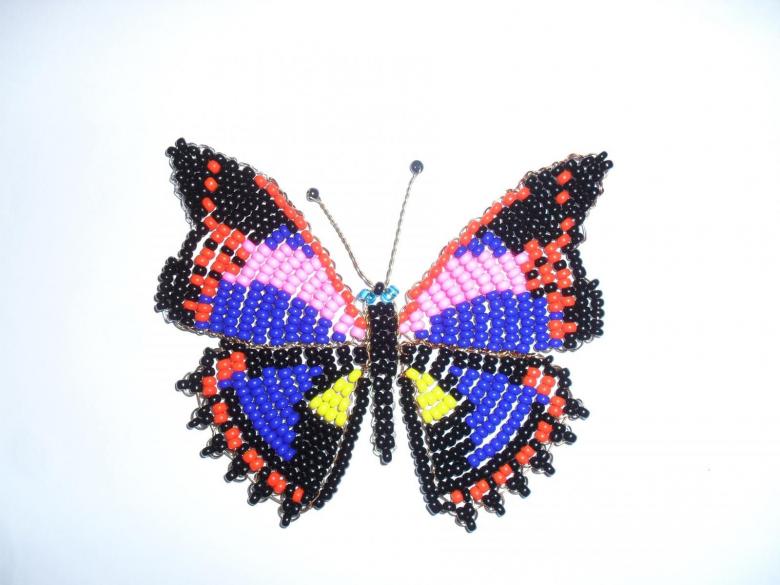 Le tissage commence à une extrémité du corps, dans une technique de tissage parallèle. On y attache des vrilles de fil de fer, qui est plié au milieu et sur lequel on enfile des perles plus foncées, puis des boucles et des formes circulaires typées ailes de plusieurs couleurs de perles, peut être bleu et rose avec des points lilas.
