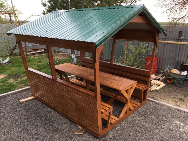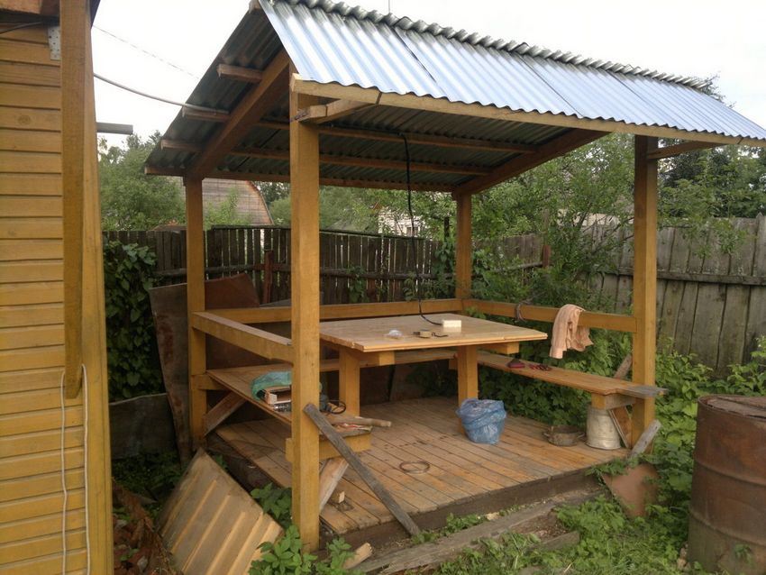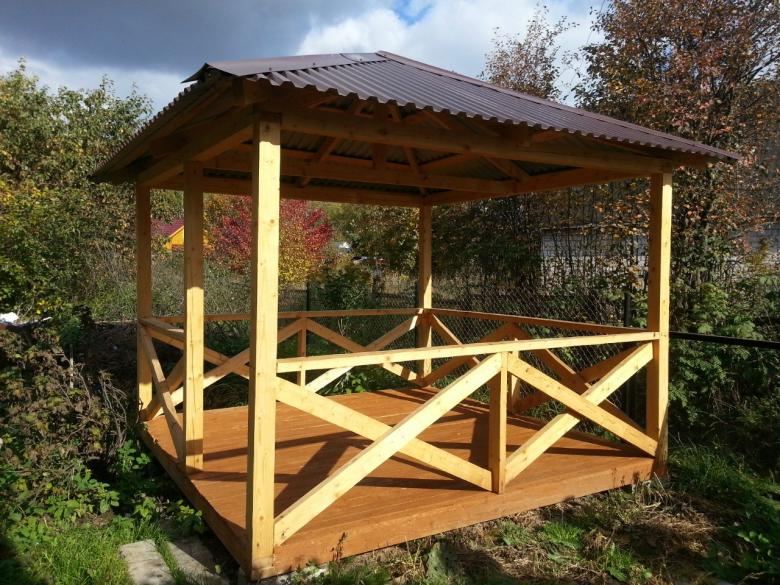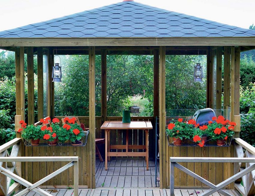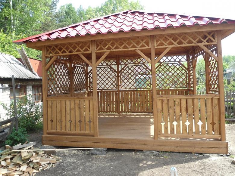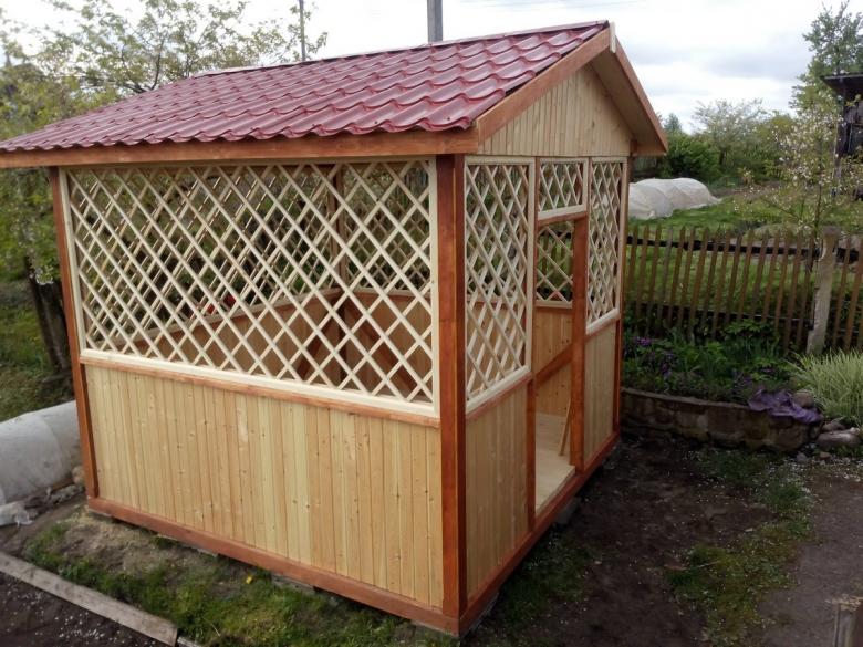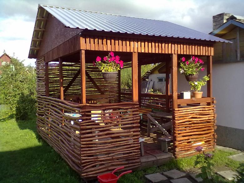 Il existe également une variante moyenne. La présence de poutres de soutien très rapprochées dans un gazebo ouvert permet en quelques heures (à l'aide de feuilles de polycarbonate) de monter des murs qui protégeront de la pluie et du vent lors des journées fraîches d'automne.