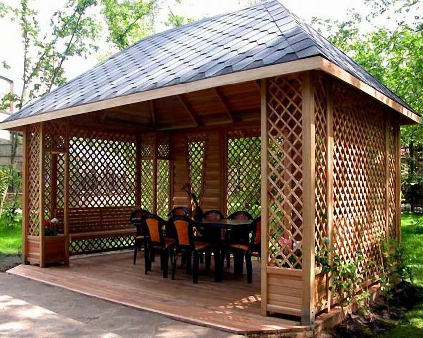 La variante la plus courante est un gazebo ouvert avec une clôture périphérique spectaculaire, ou sans clôture du tout. C'est-à-dire que le belvédère repose sur quatre piliers, recouverts d'un toit en matériau léger. Des plantes ampélogènes ou des vignes sont plantées autour de ces tonnelles. Au fil du temps, les feuilles et les grappes de raisin, ou les bourgeons des plantes grimpantes, deviennent les "murs" naturels du gazebo.