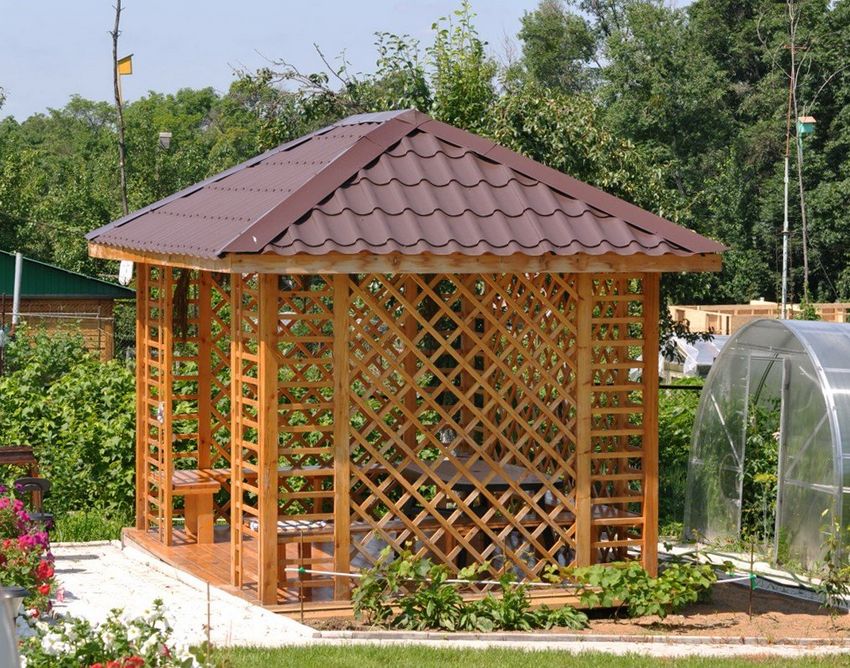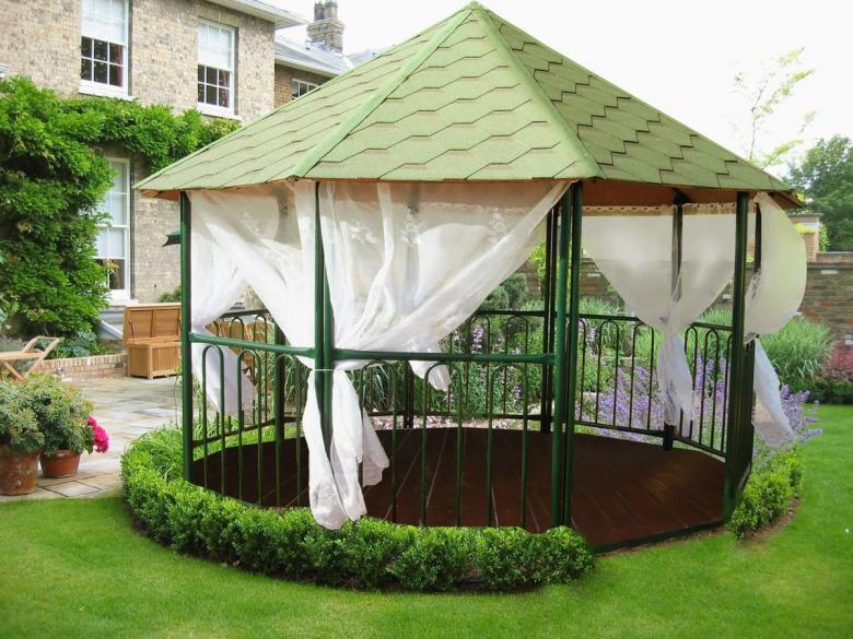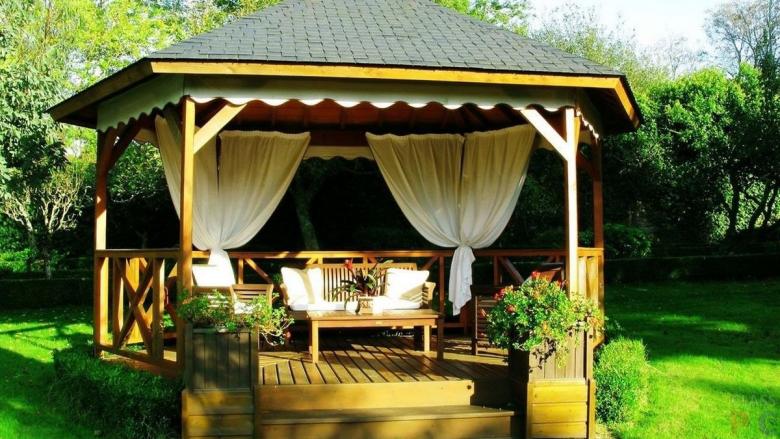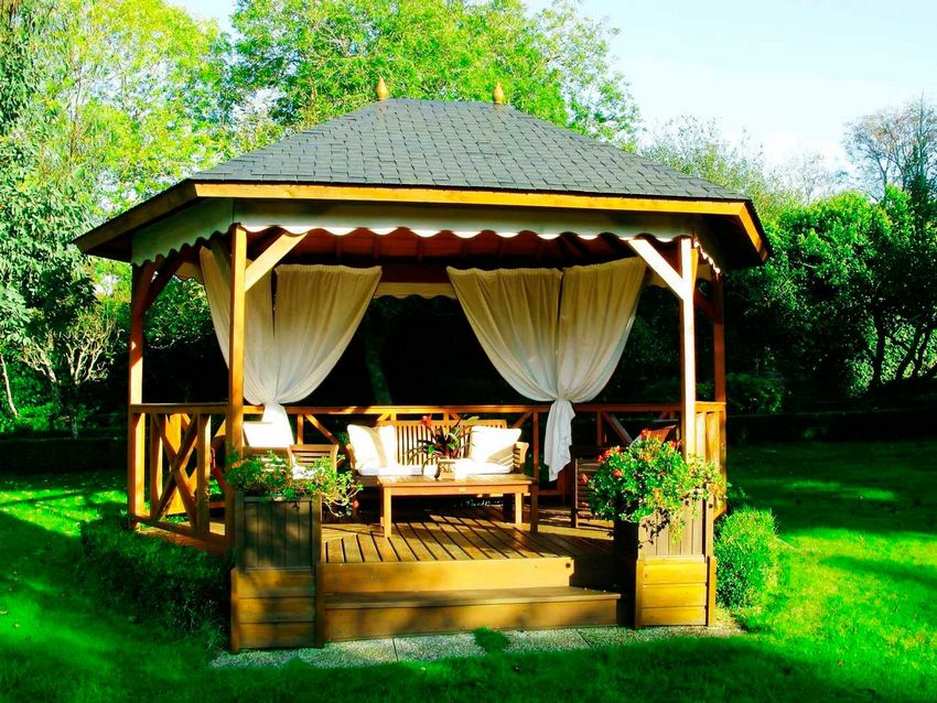 Les gazebos en bois ou en briques, recouverts de tuiles métalliques de qualité, ont un aspect très élégant.
