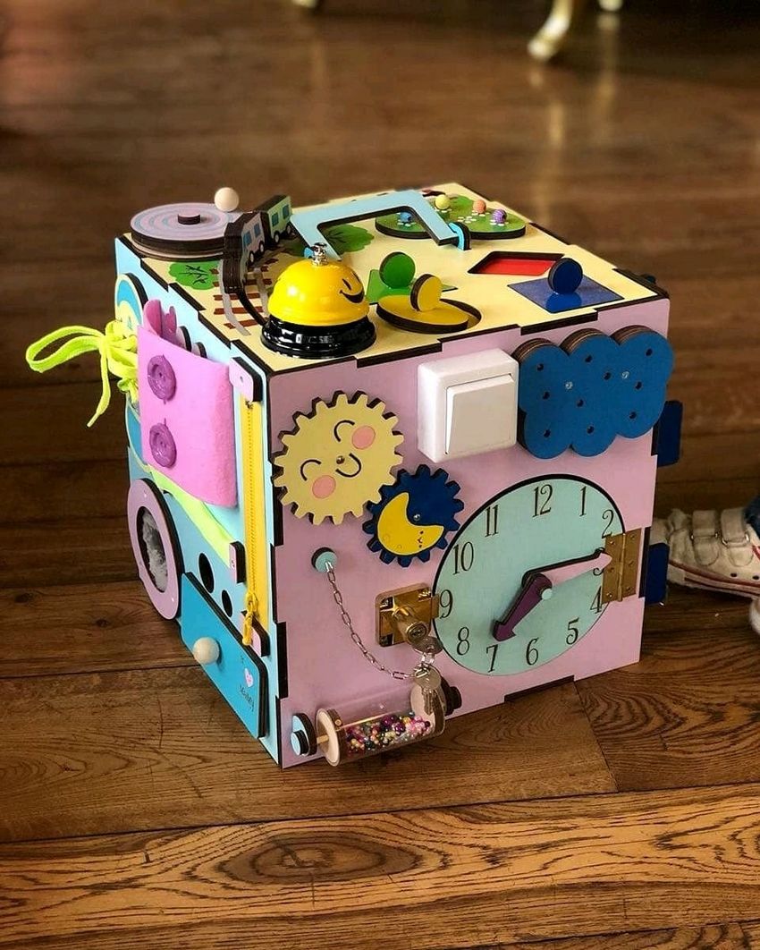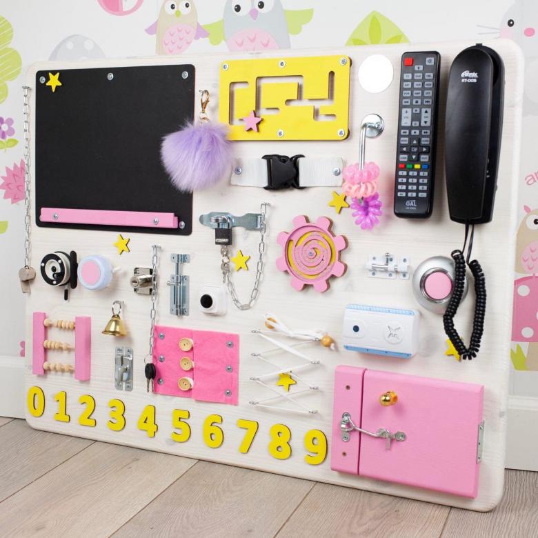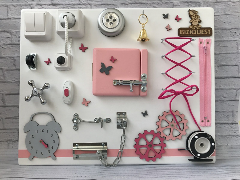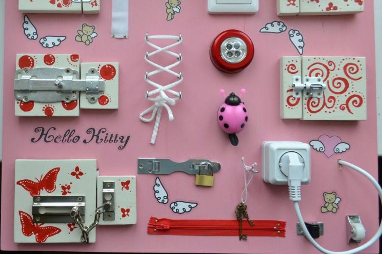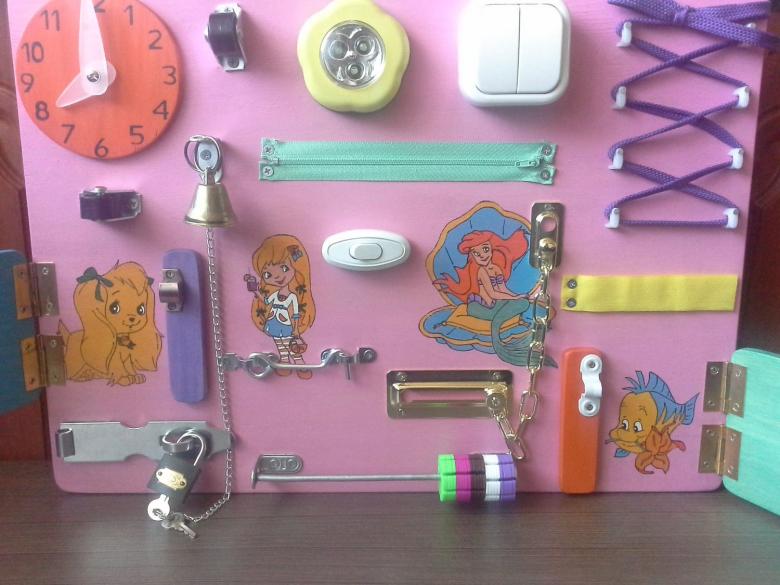 Les filles adorent jouer avec toutes sortes d'éléments et nous ne voulons pas les priver du plaisir de fermer des serrures, de conduire des voitures ou de diriger un navire. Vous pouvez fixer des interrupteurs et des tubes pour le mouvement des boules, des compteurs et des cadres d'horloge sans verre, avec des aiguilles en plastique, des fenêtres recouvertes de tissu et coudre des boutons de différentes tailles sur le biciboard.