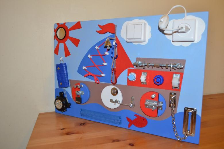 Pour les enfants qui ont une imagination débordante, vous pouvez utiliser le thème maritime et fabriquer un biboard en forme de pont de bateau. Un volant souple et un lacet attaché, une ancre sur une corde avec fixation magnétique, des compteurs et une radio jouet pour les négociations, un aquarium et des luminaires pour chats aident à faire participer l'enfant.