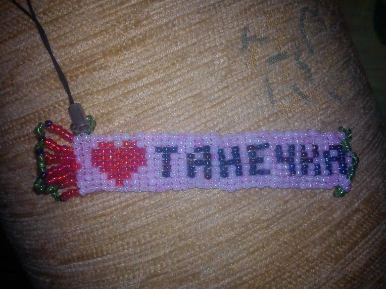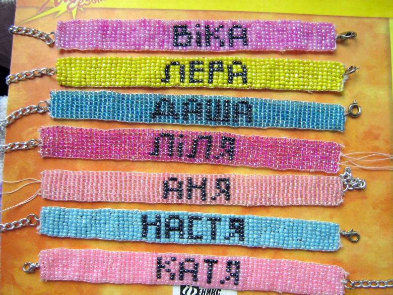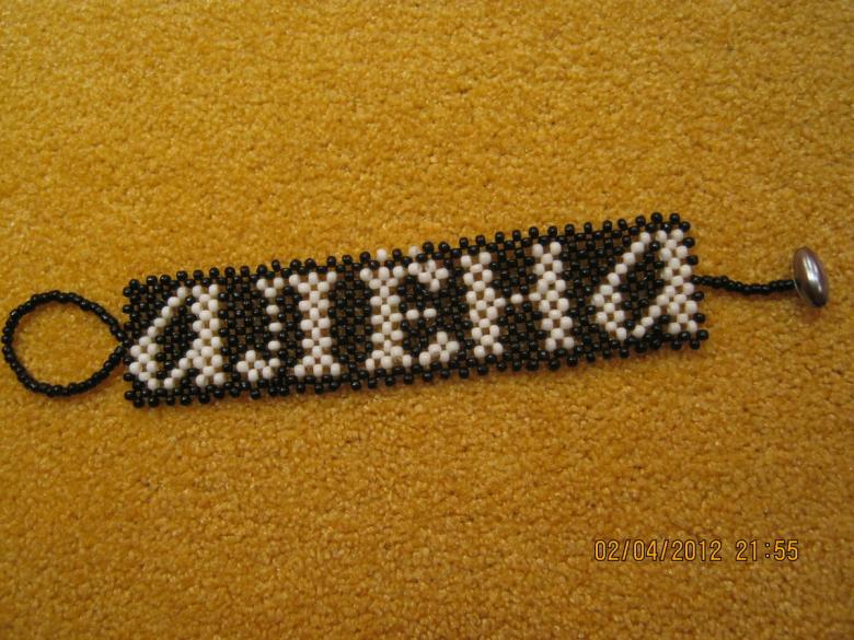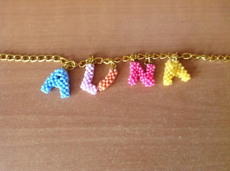 - Nom. Des perles sont tissées pour former les lettres du nom. Ce produit demande un peu plus de travail car il nécessite une grande longueur de fil de pêche.