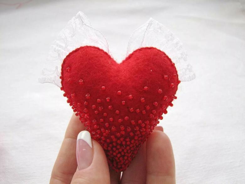 Les cœurs sont découpés dans les chutes à l'aide de pochoirs ou par vous-même avec une paire de ciseaux. Les parties qui seront la partie avant sont décorées avec des perles, des perles ou des strass. La garniture peut être cousue ou collée à l'aide d'une colle spéciale.