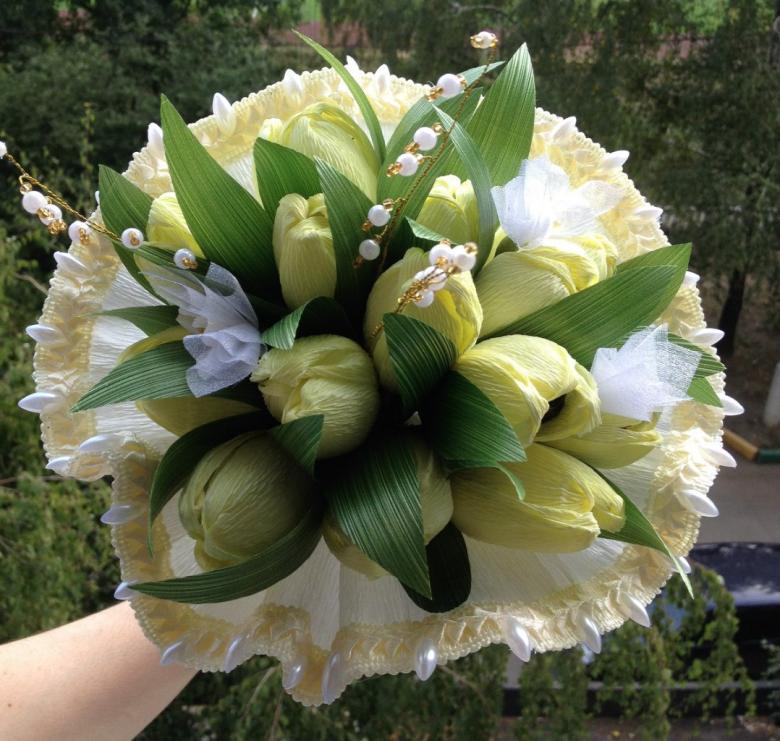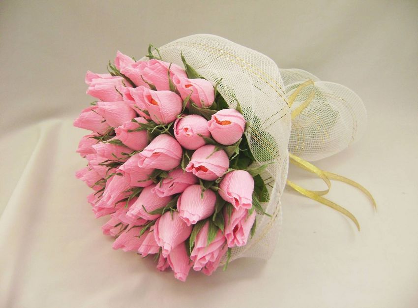 Si vous le souhaitez, vous pouvez réaliser un bouquet sans papier. Dans ce cas, le matériau décoratif est l'organza ou un autre tissu léger qui conserve assez bien sa forme.