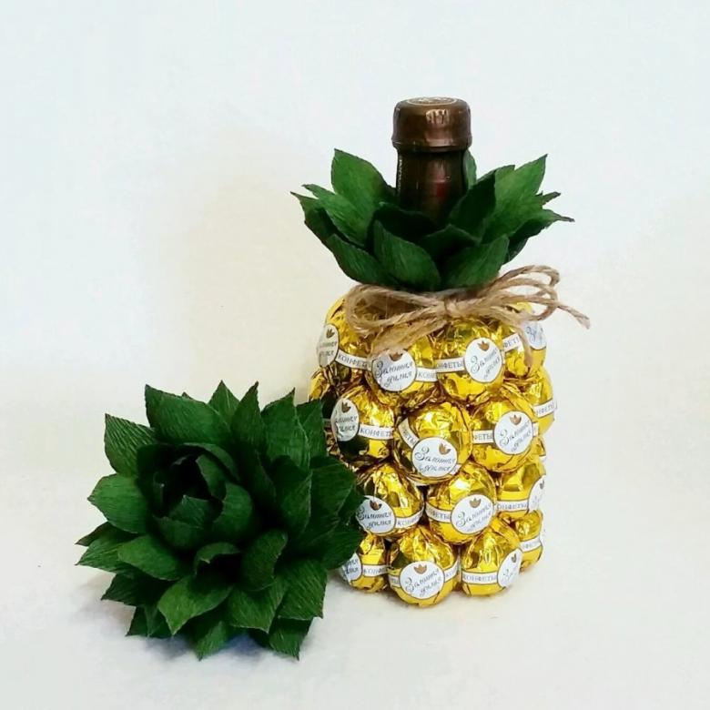 - Pour éviter que les bonbons ne tombent accidentellement, couvrez l'ananas du bas dans du cellophane transparent et attachez le tout en haut avec un ruban. Il doit arriver exactement à l'endroit où le cou commence après la partie large. Les feuilles doivent rester au-dessus de la cellophane.