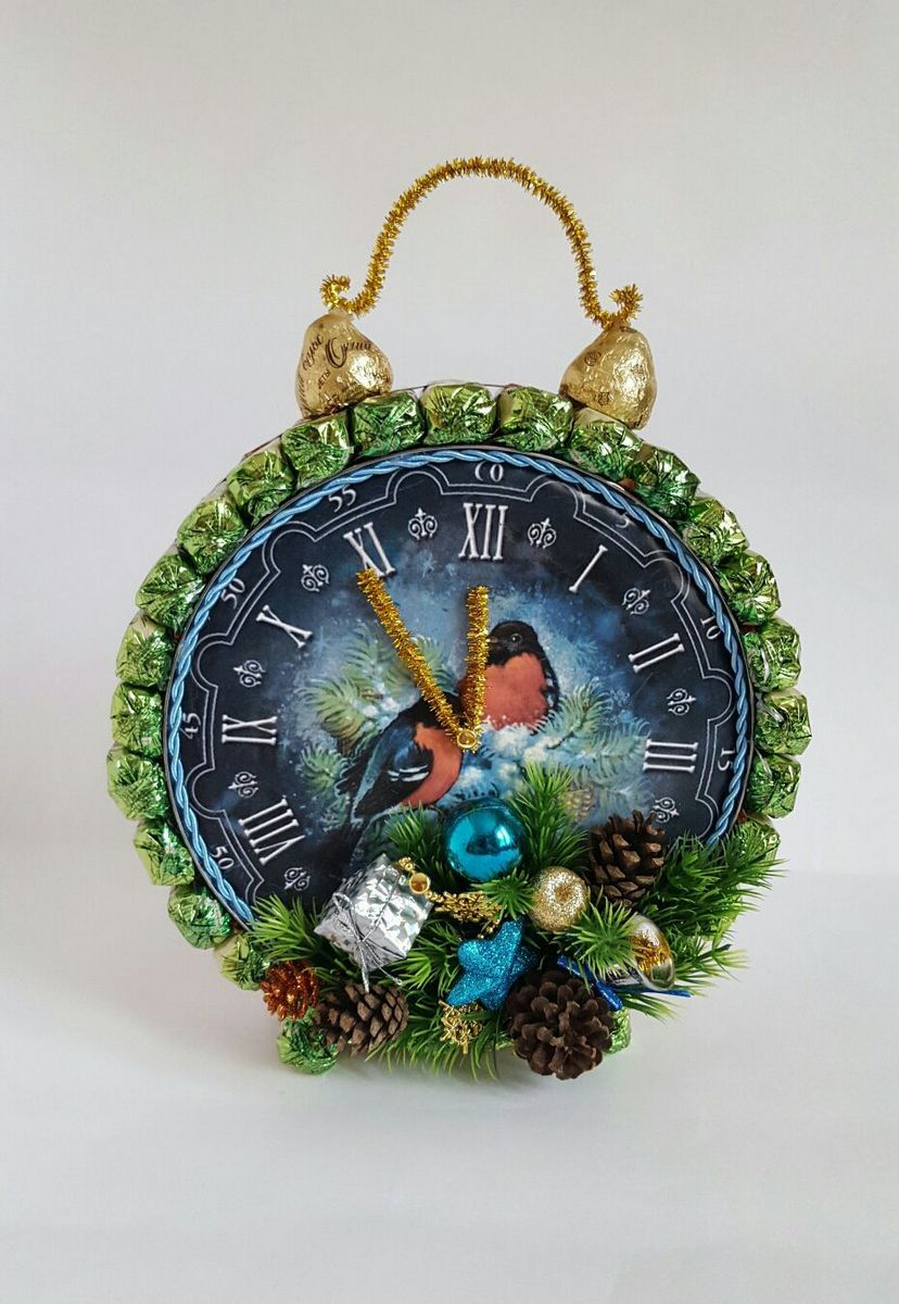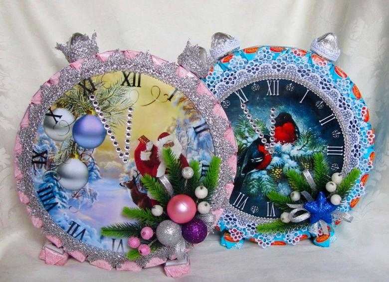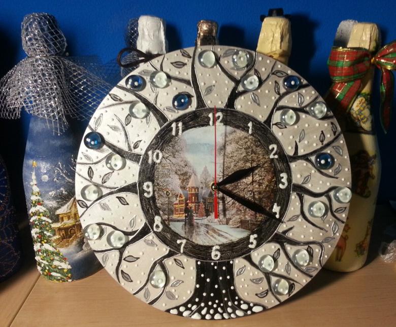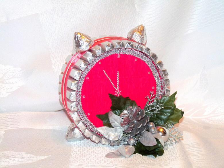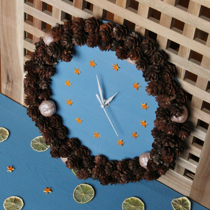 Il n'y a pas de limite à la forme de cette horloge. Vous pouvez fabriquer aussi bien un produit de bureau au design laconique qu'un objet volumineux conçu pour être placé au mur. Vous pouvez utiliser des décorations de Noël telles que des guirlandes, des brindilles d'épicéa, des cônes, des flocons de neige, des bonhommes de neige et des décorations de Noël pour créer l'ambiance.