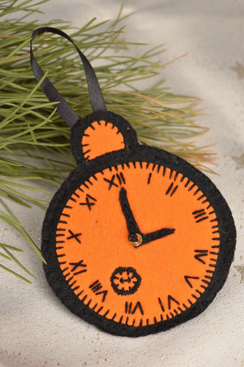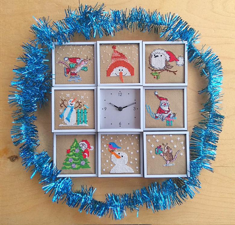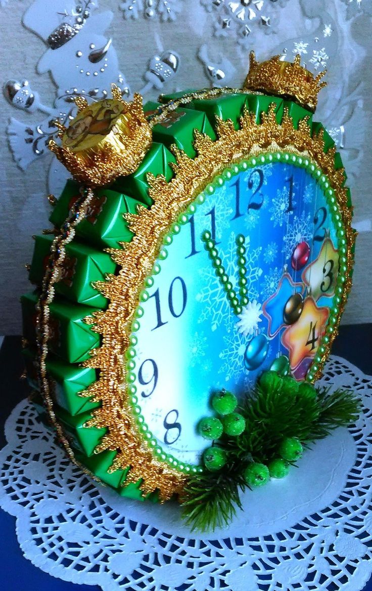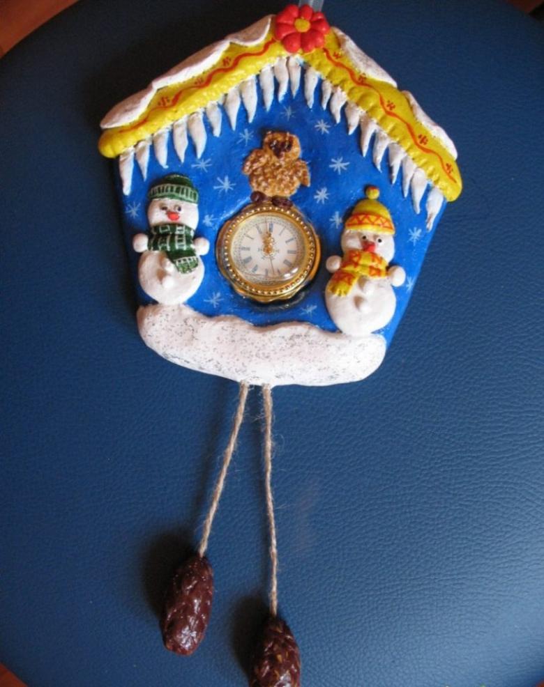 Il n'y a pas de limite à la forme de cette horloge. Vous pouvez fabriquer aussi bien un produit de bureau au design laconique qu'un objet volumineux conçu pour être placé au mur. Vous pouvez utiliser des décorations de Noël telles que des guirlandes, des brindilles d'épicéa, des cônes, des flocons de neige, des bonhommes de neige et des décorations de Noël pour créer l'ambiance.