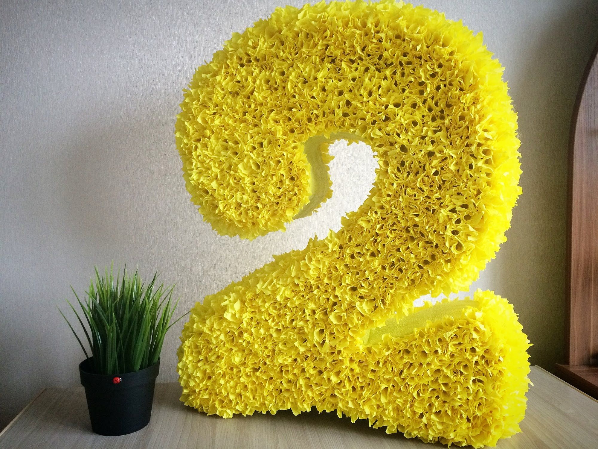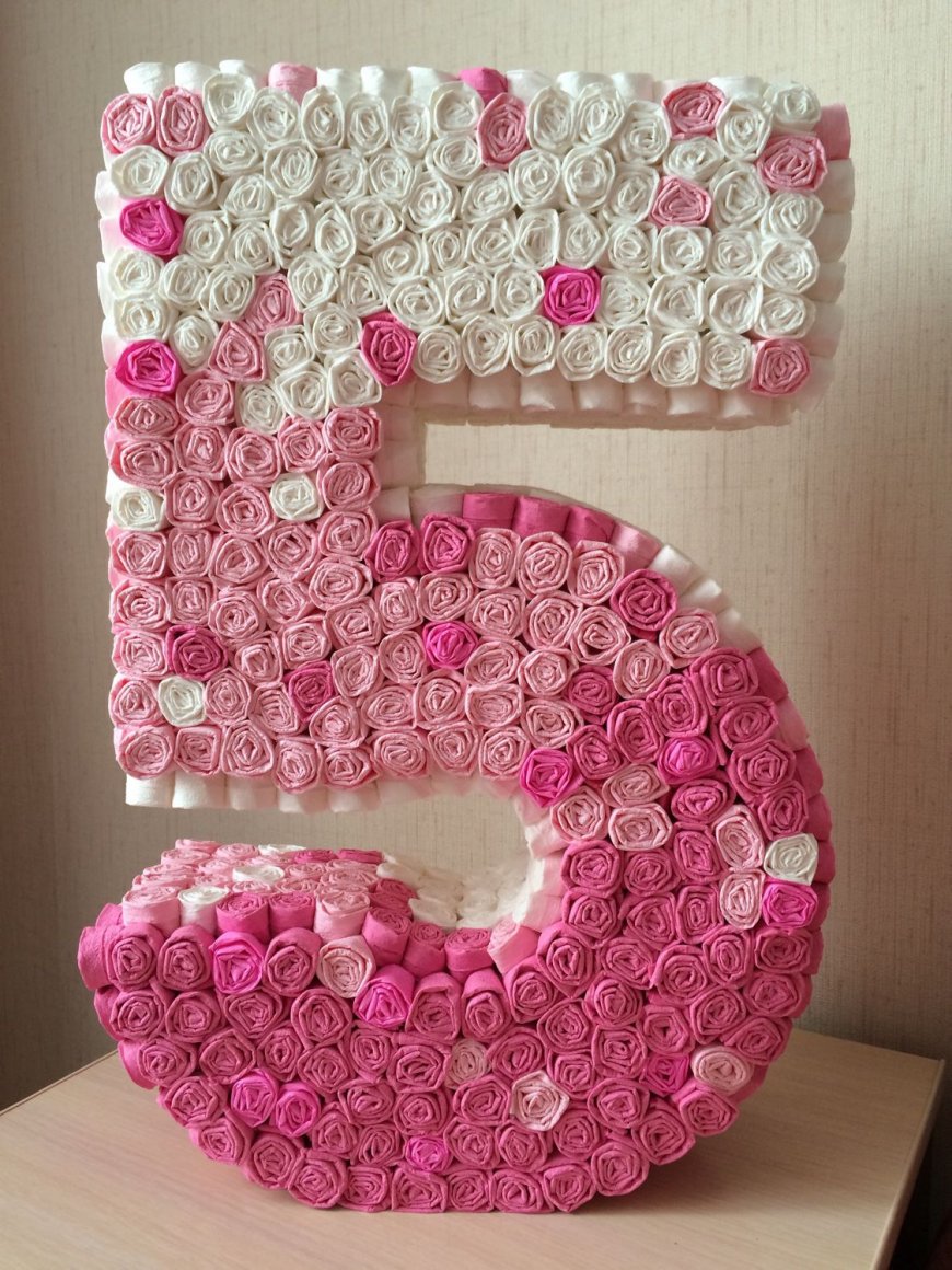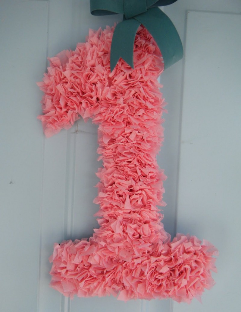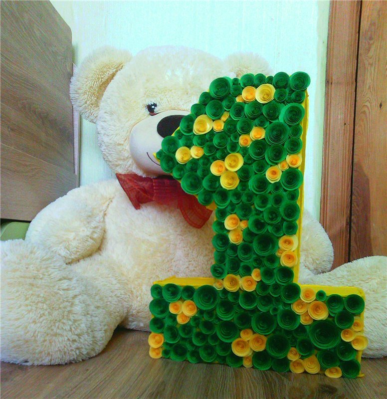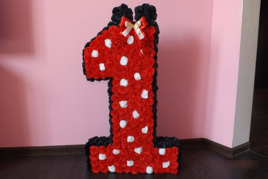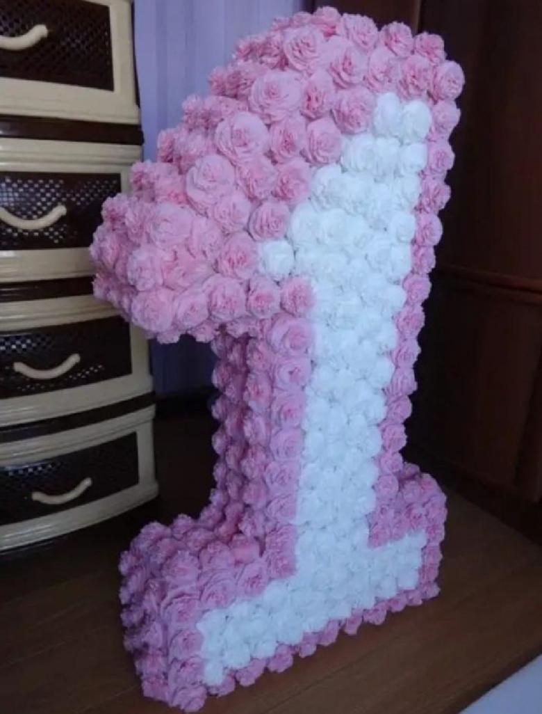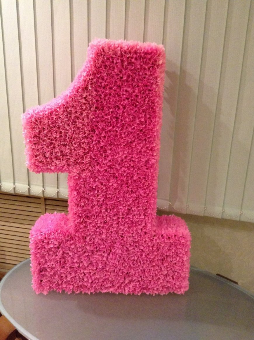 Voici une autre idée simple de comment faire un numéro 1 pour un anniversaire avec vos propres mains à mettre en œuvre qui nécessitera du papier ondulé. Le papier est utilisé pour réaliser plusieurs dizaines de fleurs en papier, formant des boules volumineuses aux pétales bien visibles.