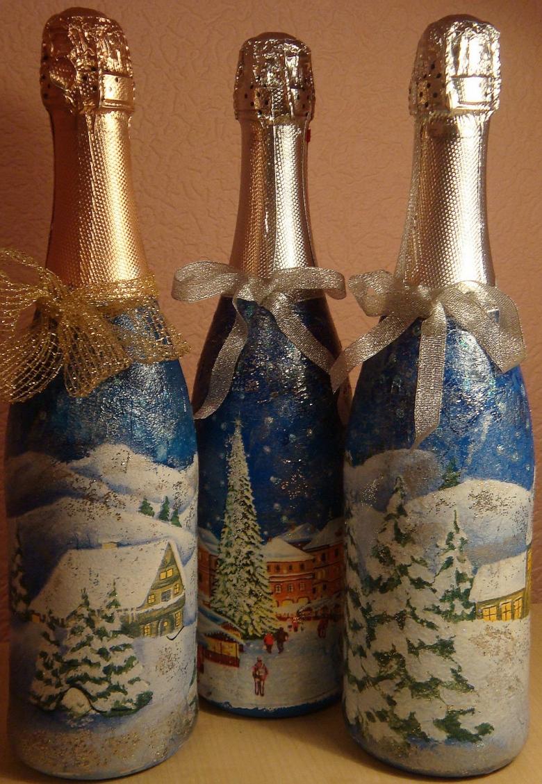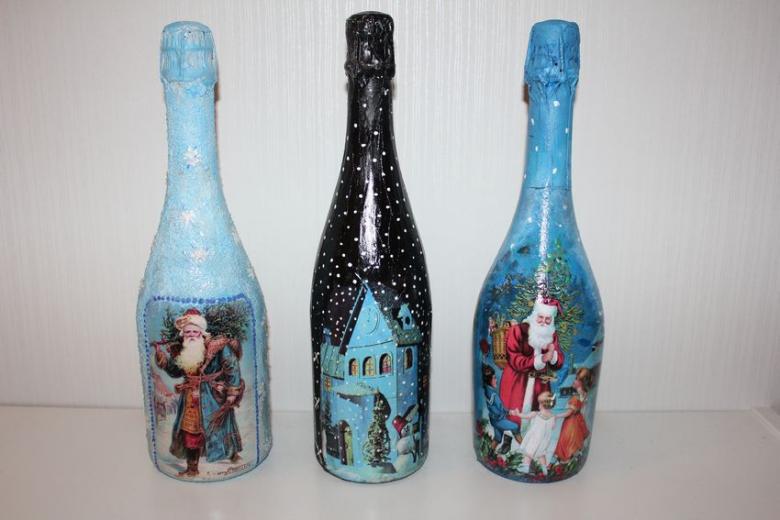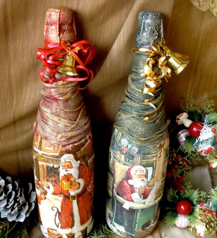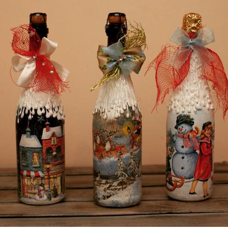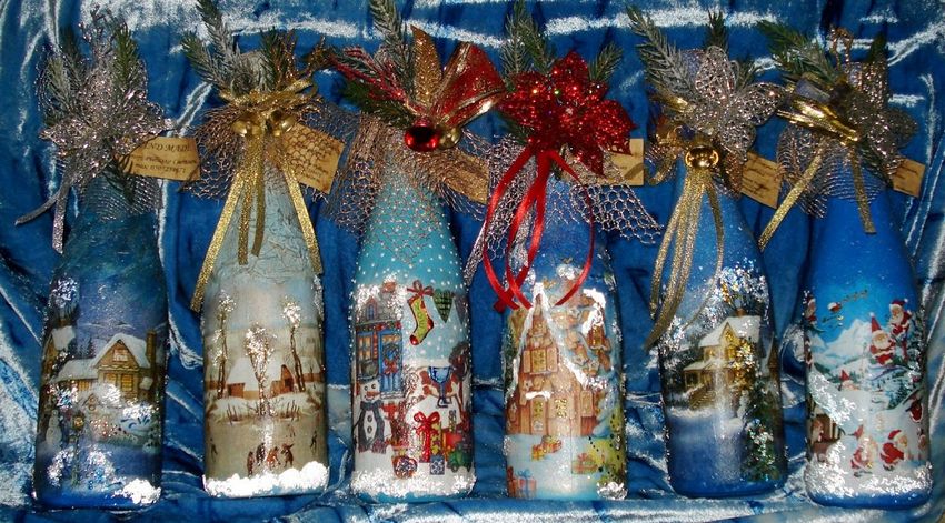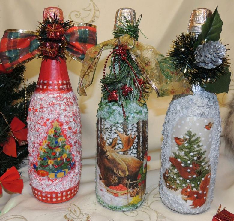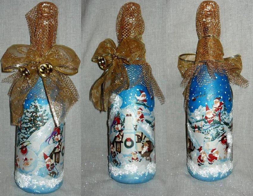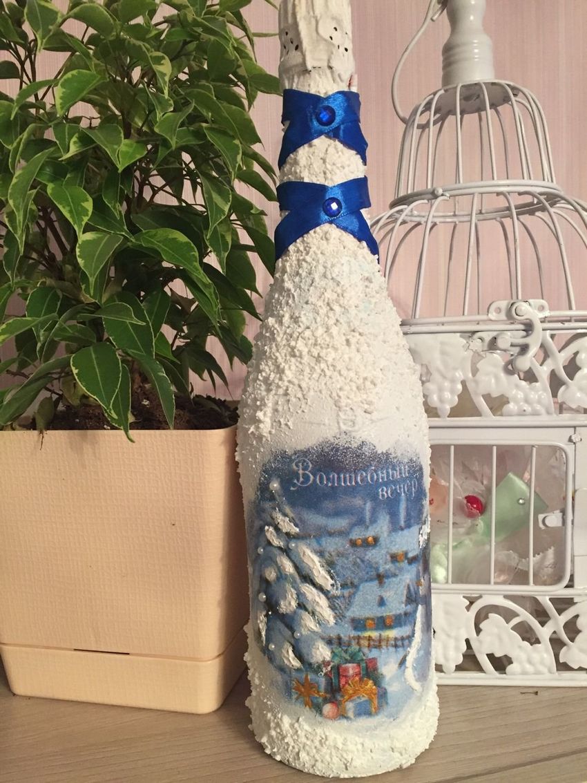 Les bouteilles décorées uniquement avec des serviettes de table auront l'air plates et sans volume. Pour créer du volume, vous pouvez saupoudrer du sel ou du sucre sur la peinture humide pour créer un effet de neige. Sur Internet, vous trouverez de nombreuses idées sur la manière de découper une bouteille de champagne et sur la façon de décorer le résultat. Par exemple, vous pouvez décorer le cou avec des rubans en satin ou en papier, dans ce dernier cas, il est préférable de friser les rubans avec des ciseaux.