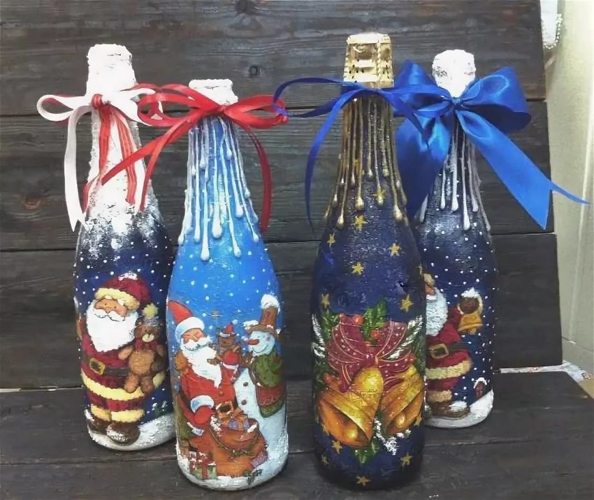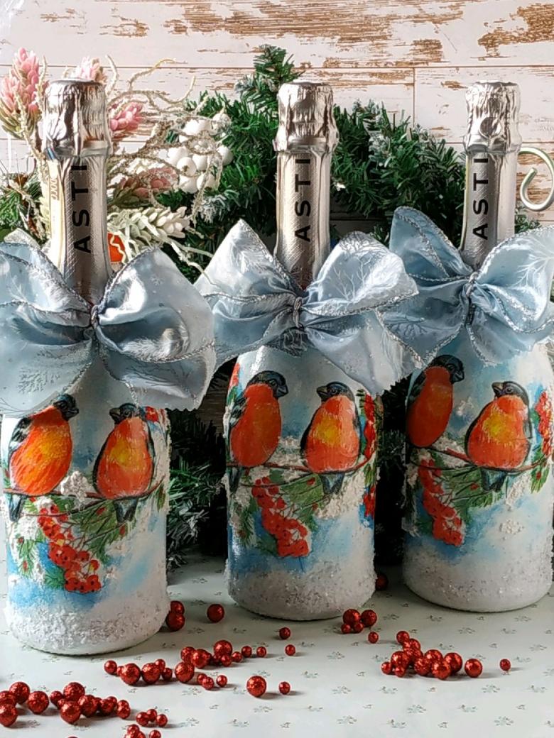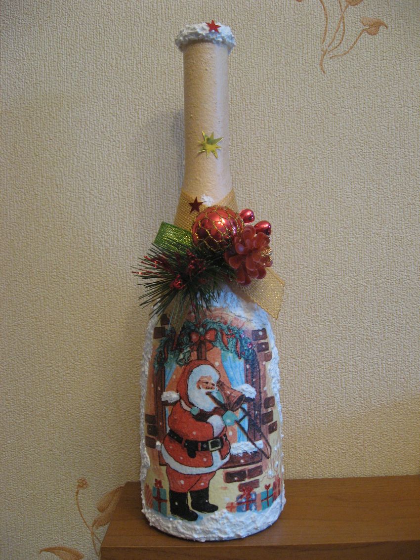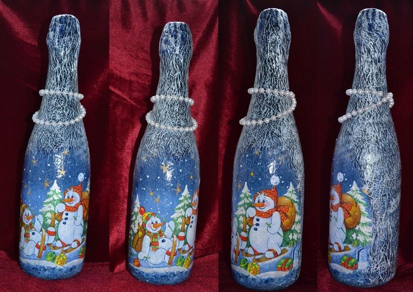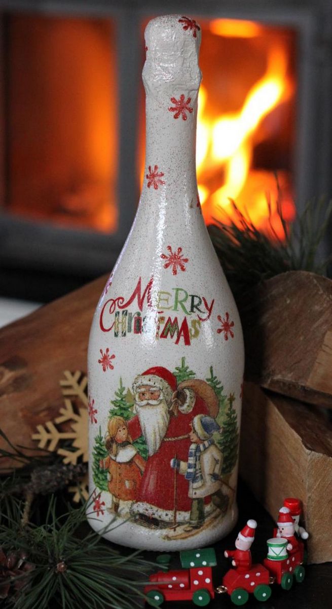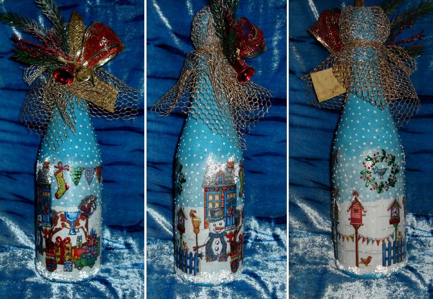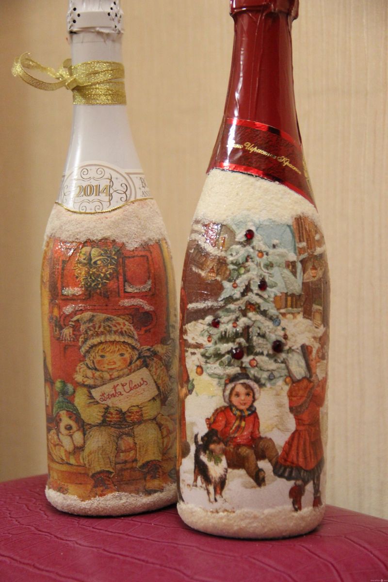 Les bouteilles décorées uniquement avec des serviettes de table auront l'air plates et sans volume. Pour créer du volume, vous pouvez saupoudrer du sel ou du sucre sur la peinture humide pour créer un effet de neige. Sur Internet, vous trouverez de nombreuses idées sur la manière de découper une bouteille de champagne et sur la façon de décorer le résultat. Par exemple, vous pouvez décorer le cou avec des rubans en satin ou en papier, dans ce dernier cas, il est préférable de friser les rubans avec des ciseaux.