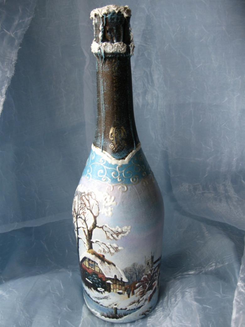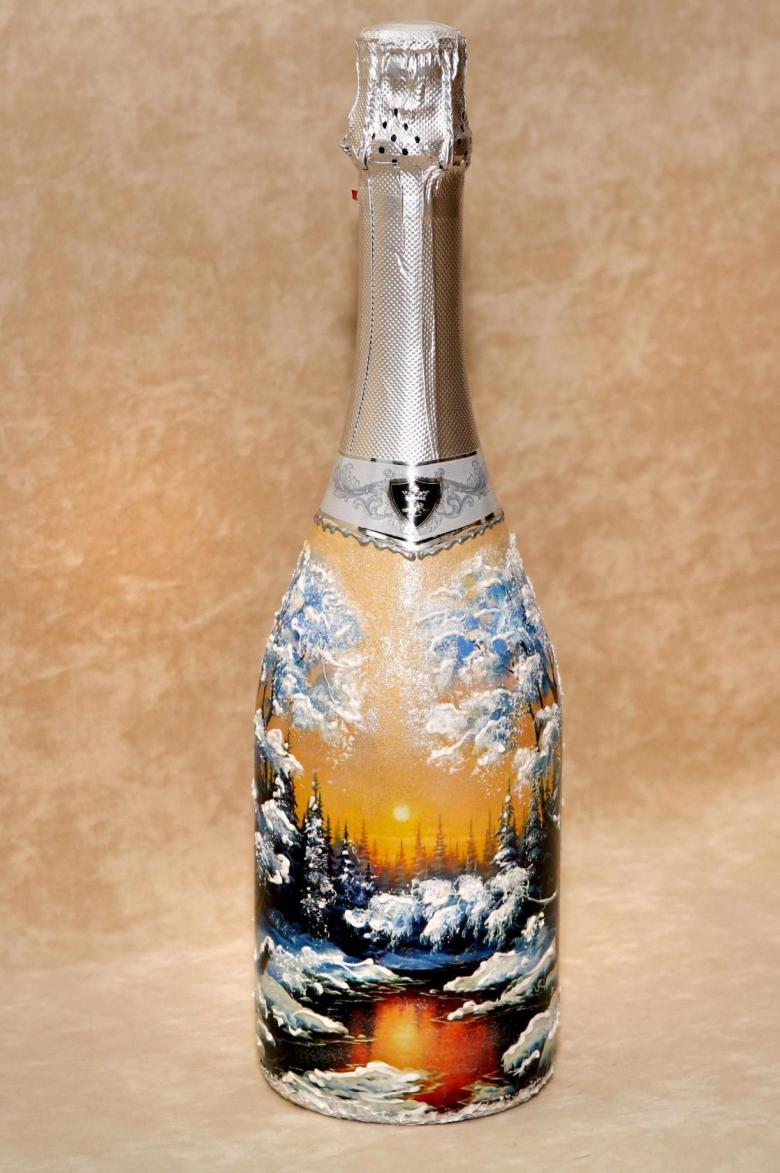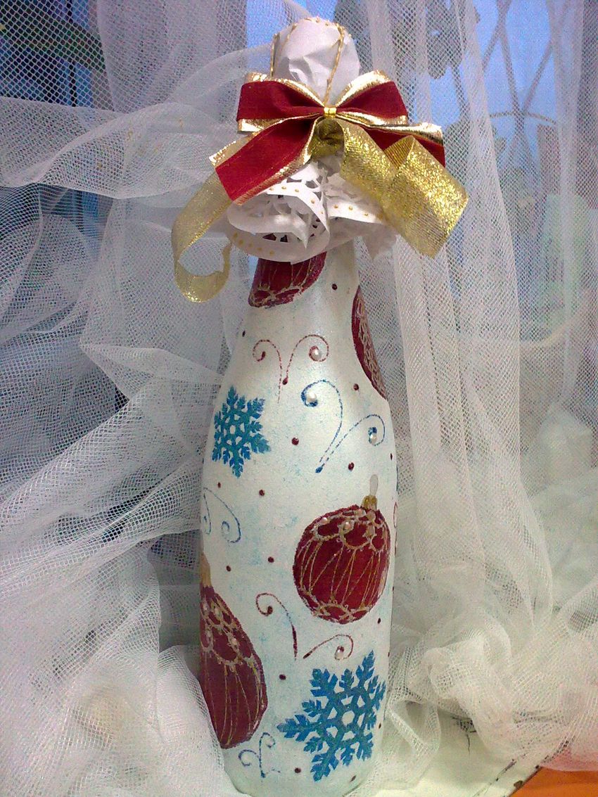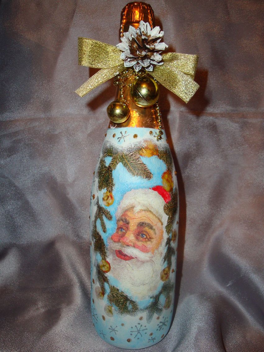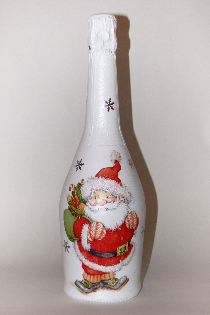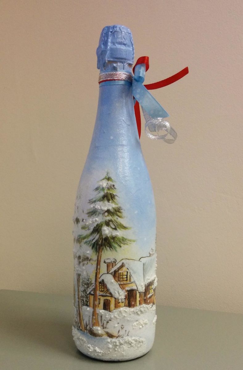 Les bouteilles décorées uniquement avec des serviettes de table auront l'air plates et sans volume. Pour créer du volume, vous pouvez saupoudrer du sel ou du sucre sur la peinture humide pour créer un effet de neige. Sur Internet, vous trouverez de nombreuses idées sur la manière de découper une bouteille de champagne et sur la façon de décorer le résultat. Par exemple, vous pouvez décorer le cou avec des rubans en satin ou en papier, dans ce dernier cas, il est préférable de friser les rubans avec des ciseaux.