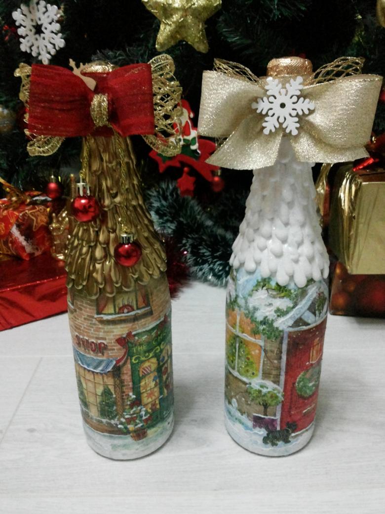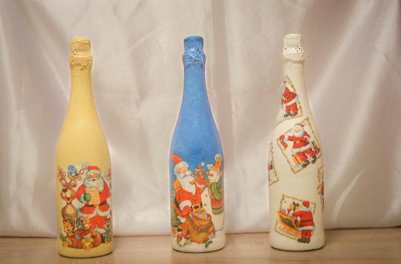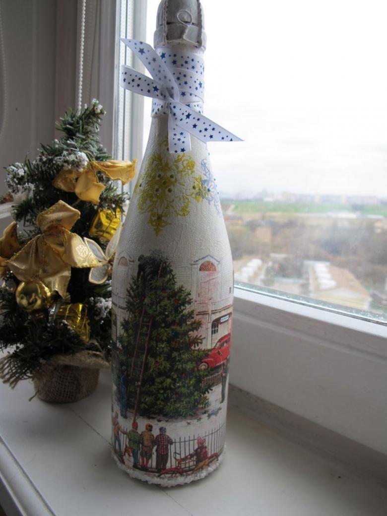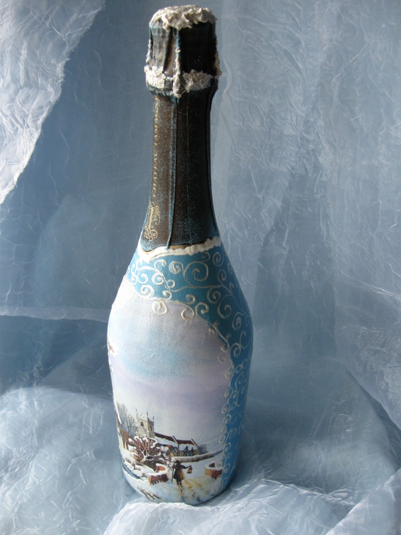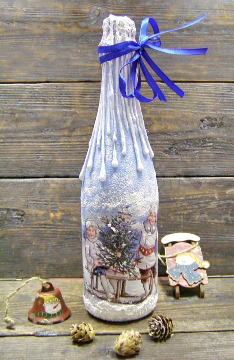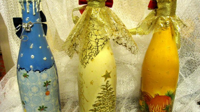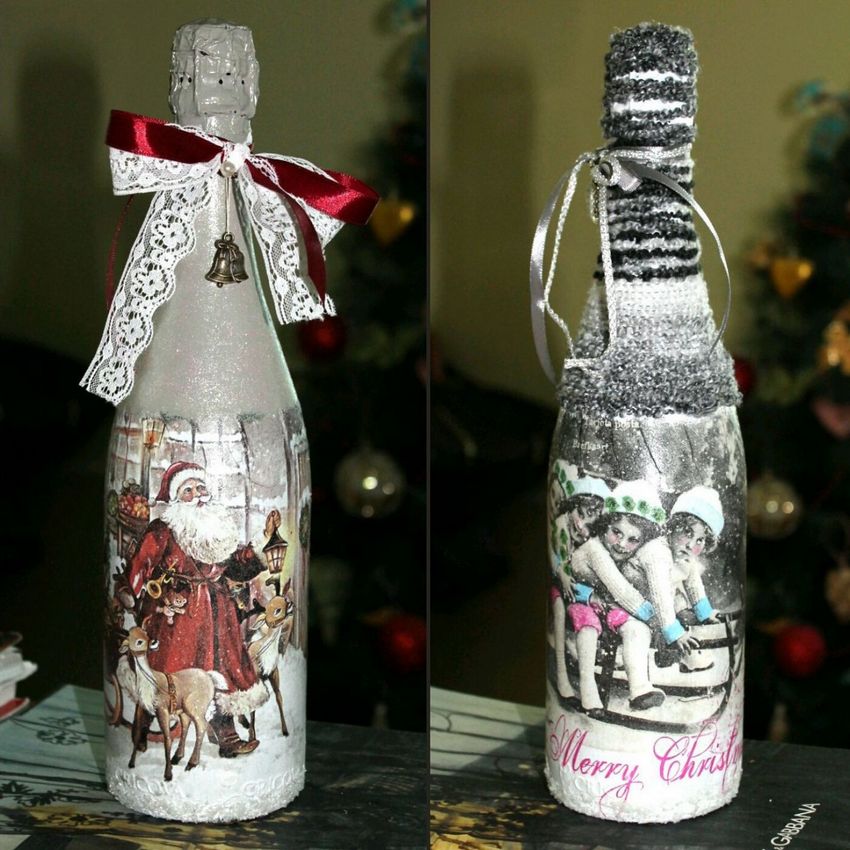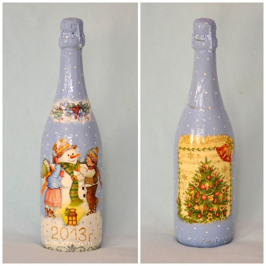 Les bouteilles décorées uniquement avec des serviettes de table auront l'air plates et sans volume. Pour créer du volume, vous pouvez saupoudrer du sel ou du sucre sur la peinture humide pour créer un effet de neige. Sur Internet, vous trouverez de nombreuses idées sur la manière de découper une bouteille de champagne et sur la façon de décorer le résultat. Par exemple, vous pouvez décorer le cou avec des rubans en satin ou en papier, dans ce dernier cas, il est préférable de friser les rubans avec des ciseaux.