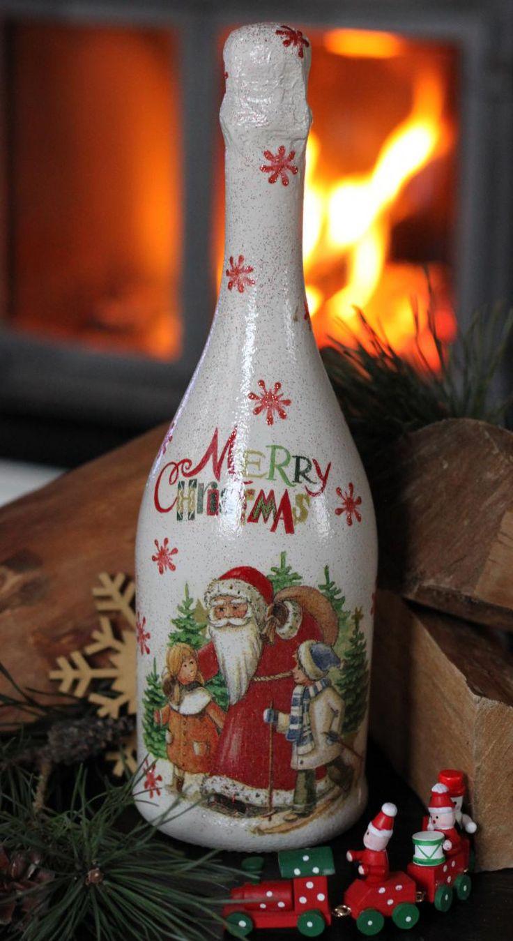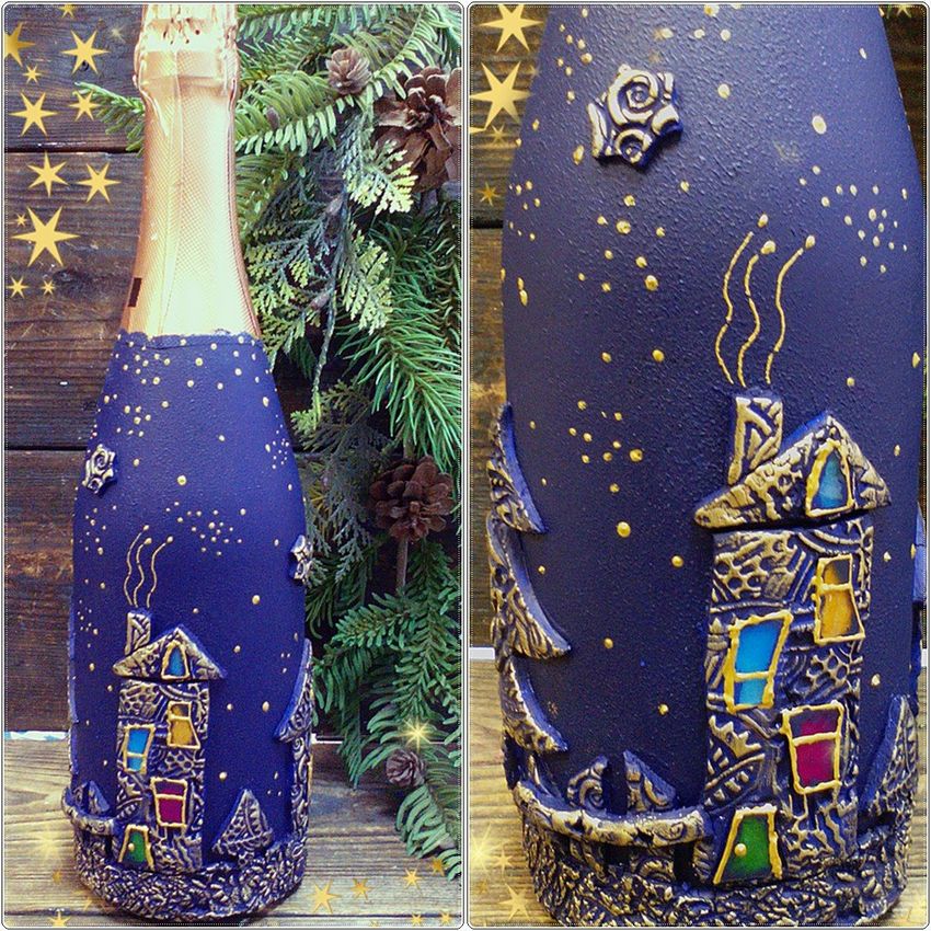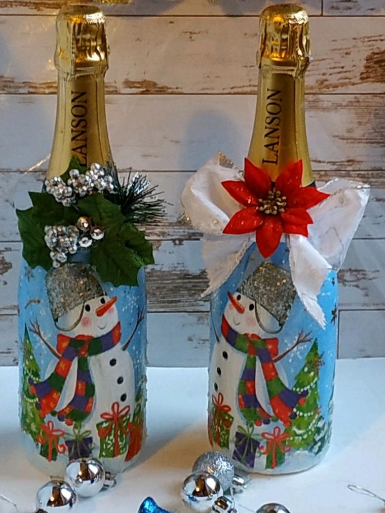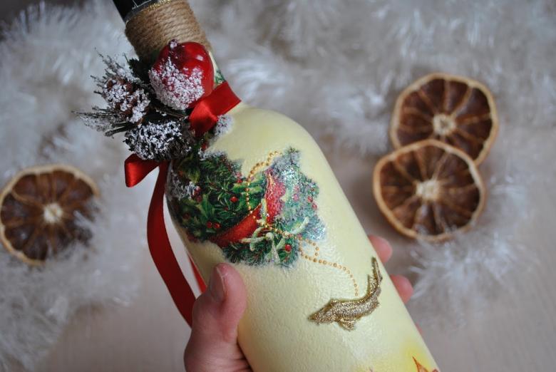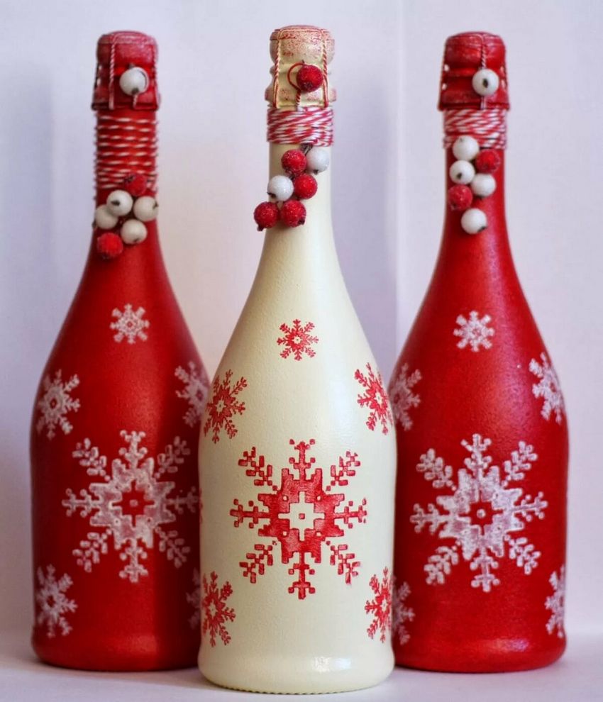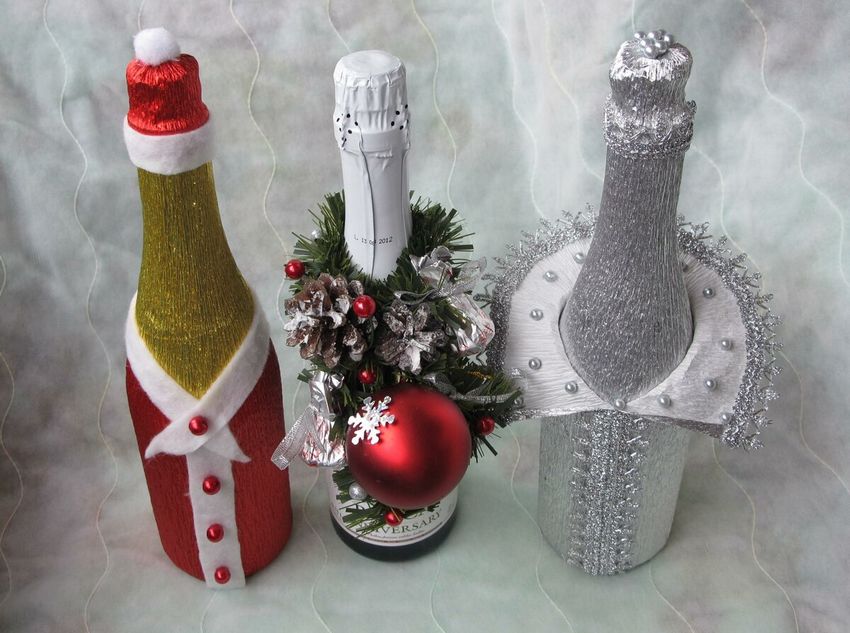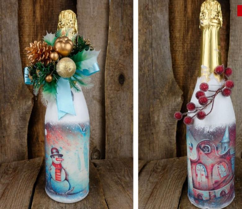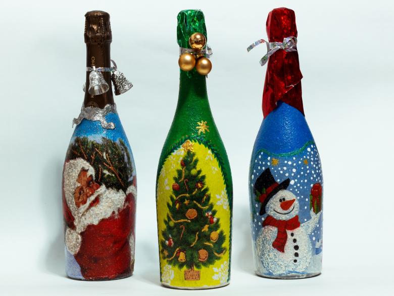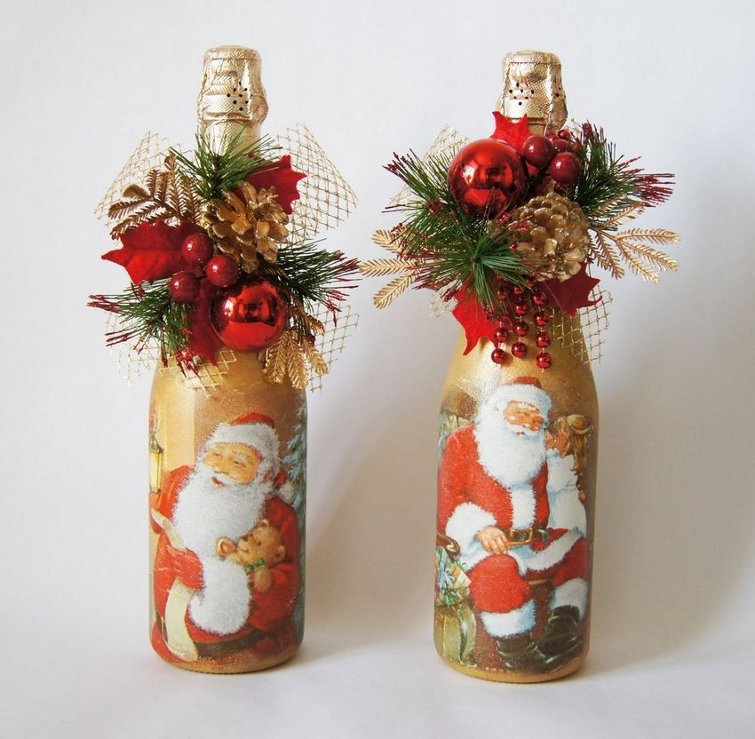 Cette option demande un peu plus d'inspiration et de dépenses, mais le résultat est une belle œuvre qui sera appréciée non seulement le soir du réveillon, mais aussi après, car la bouteille vide peut être placée comme décoration ou comme vase.