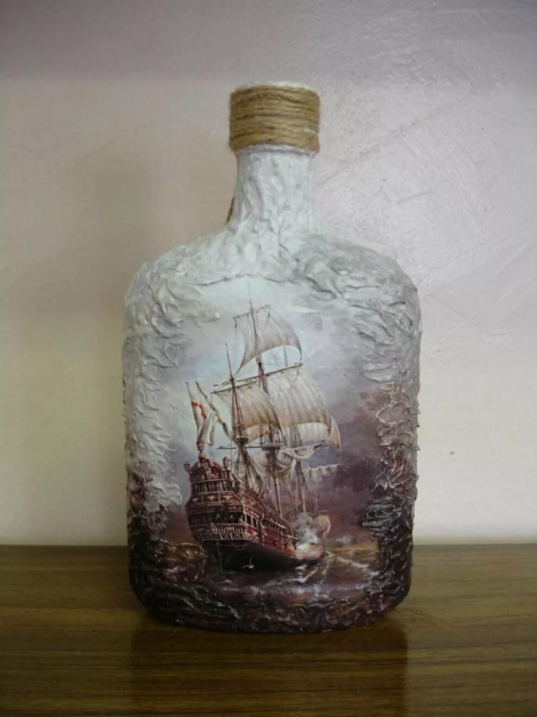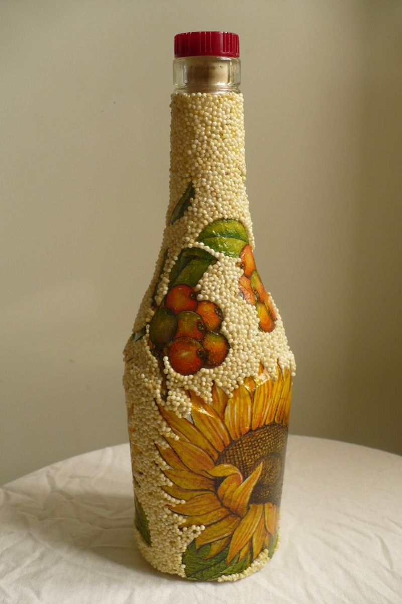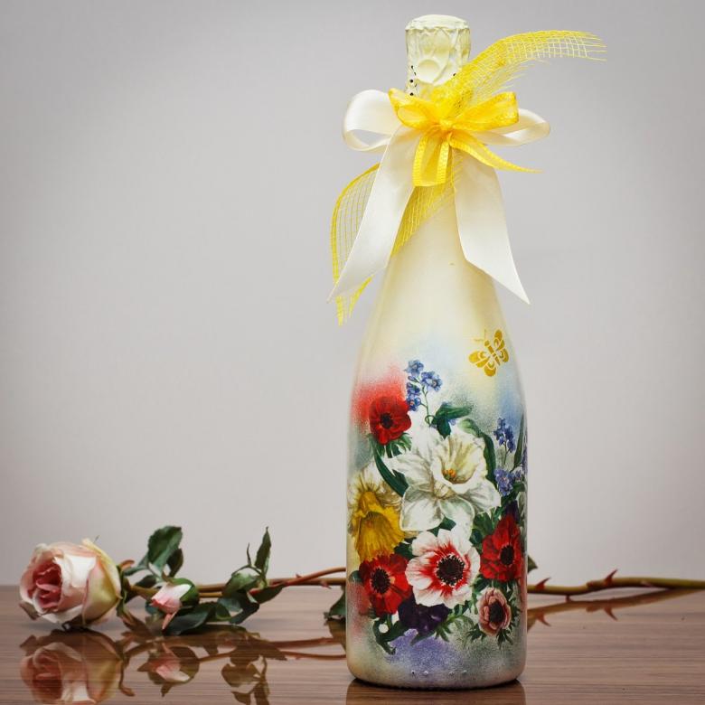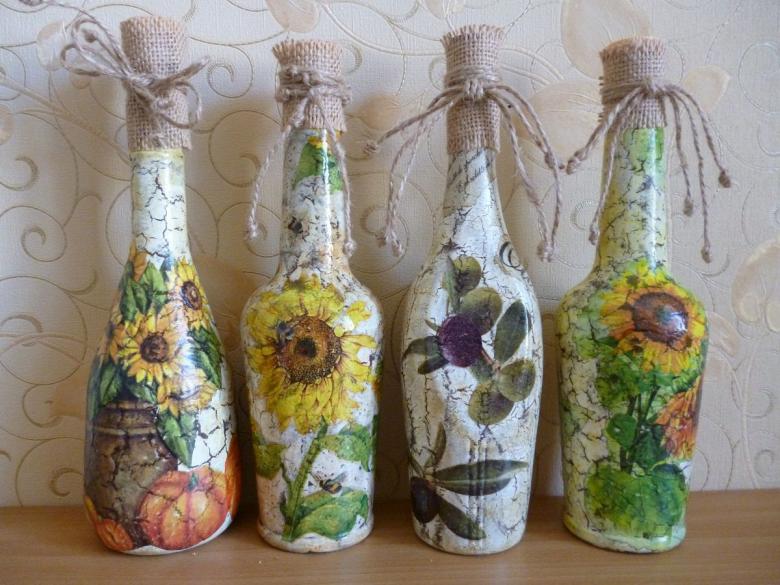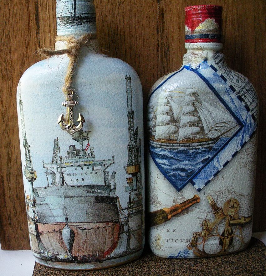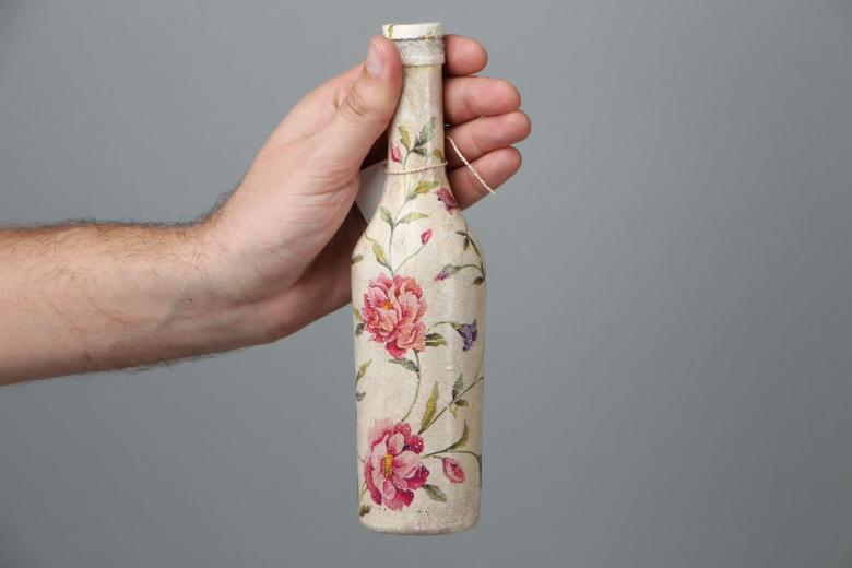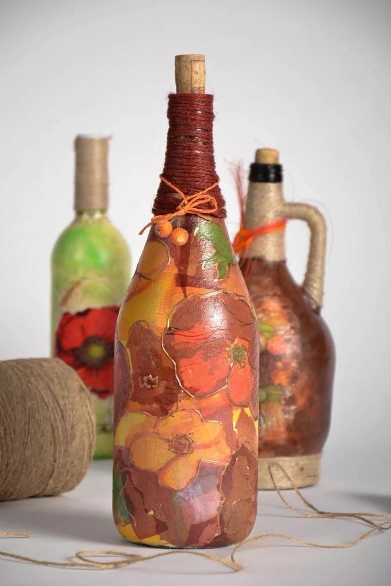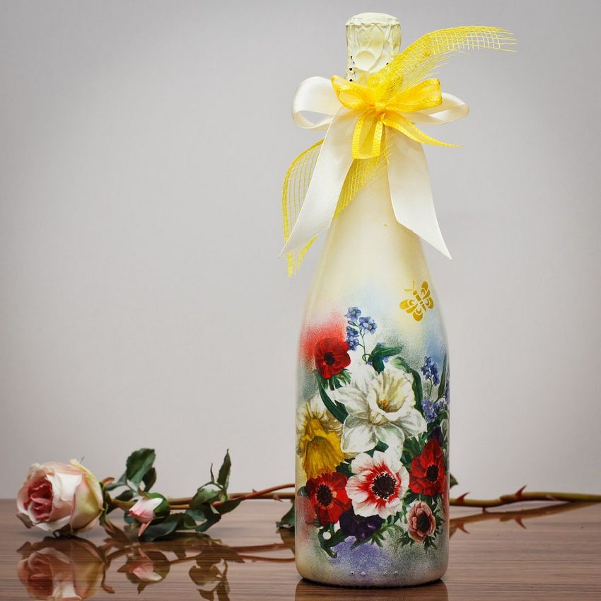 La décoration de l'objet est choisie en fonction de la composition générale de l'intérieur ou de la destination du futur objet. On réalise plus souvent des découpages de bouteilles avec des serviettes, pour lesquels on choisit des produits multicouches avec des dessins ou des images originales.