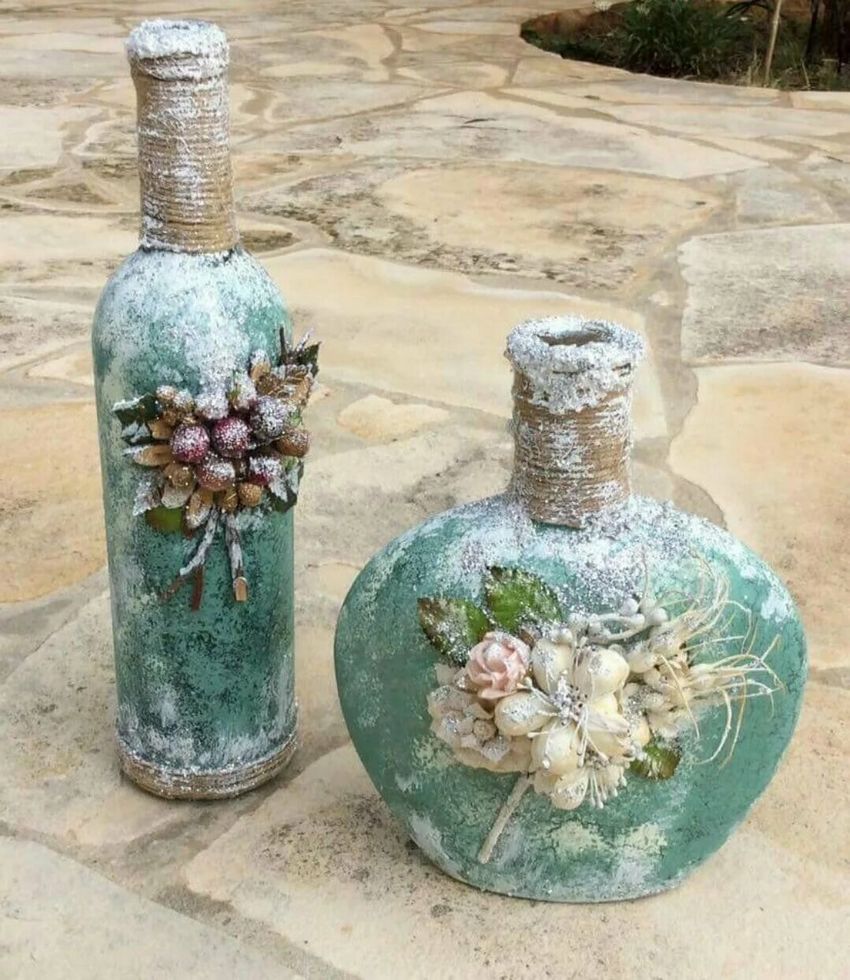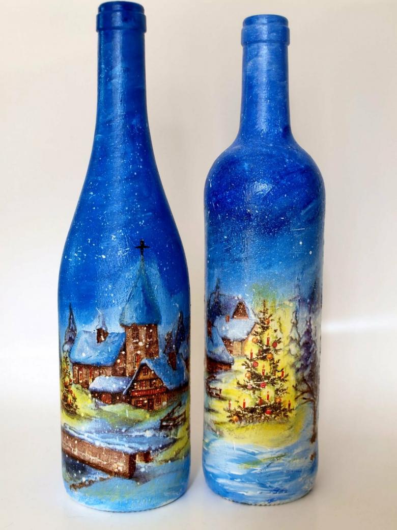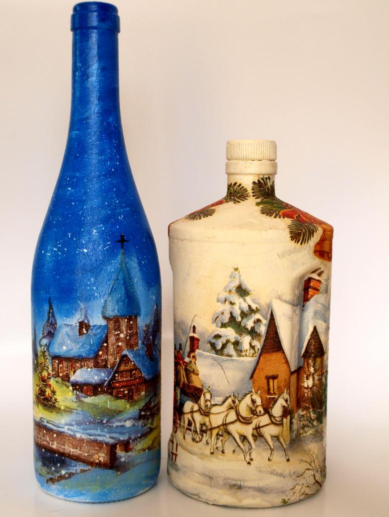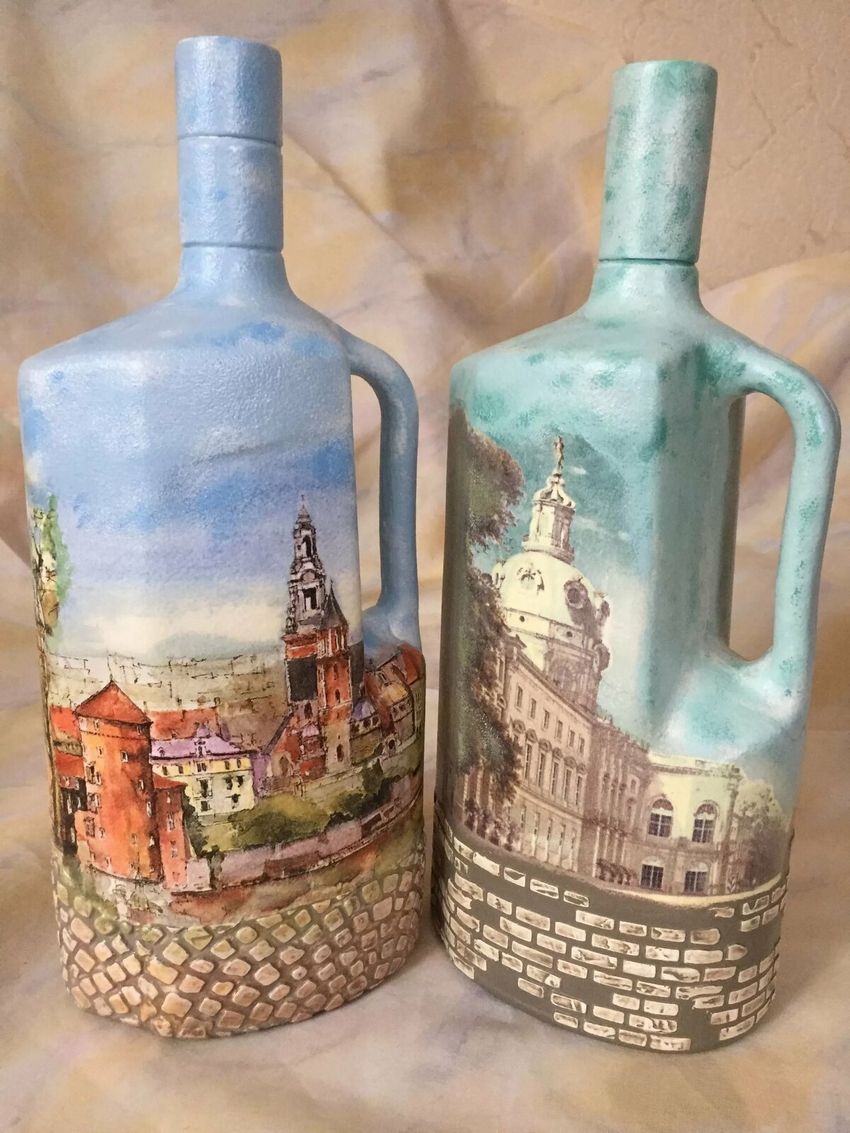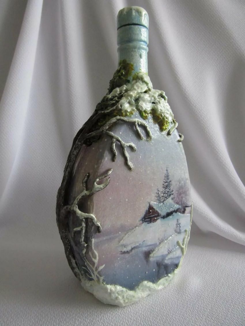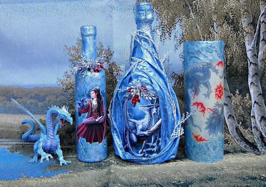 Les bouteilles en verre coloré joliment décorées de motifs ou entièrement recouvertes d'images thématiques sont des ajouts originaux à une composition intérieure. Ils peuvent non seulement servir de décorations, mais aussi être utilisés pour fabriquer des vases intéressants et inhabituels pour les fleurs ou être offerts comme cadeau de fête exclusif.