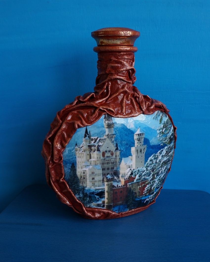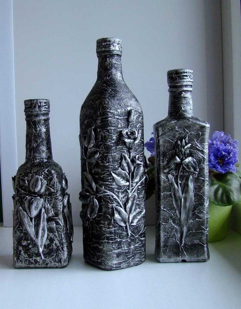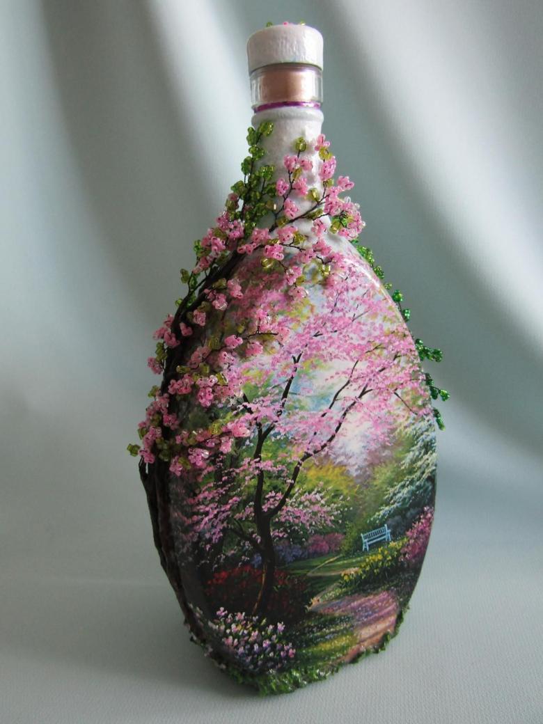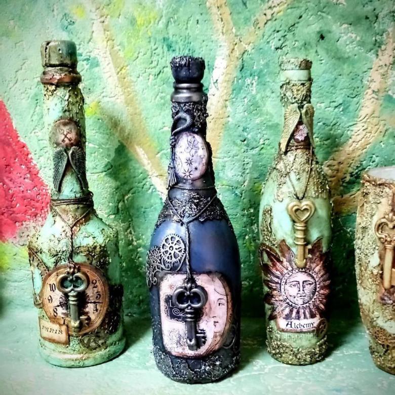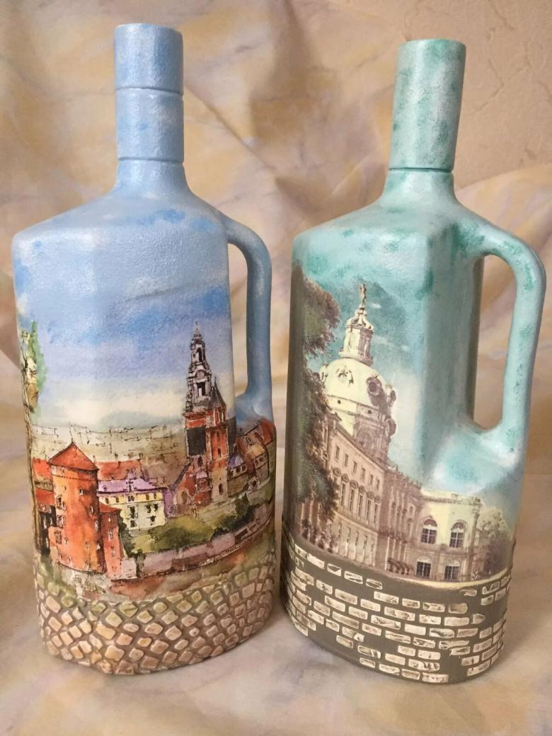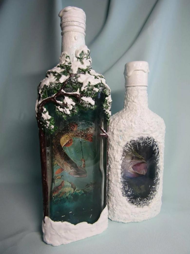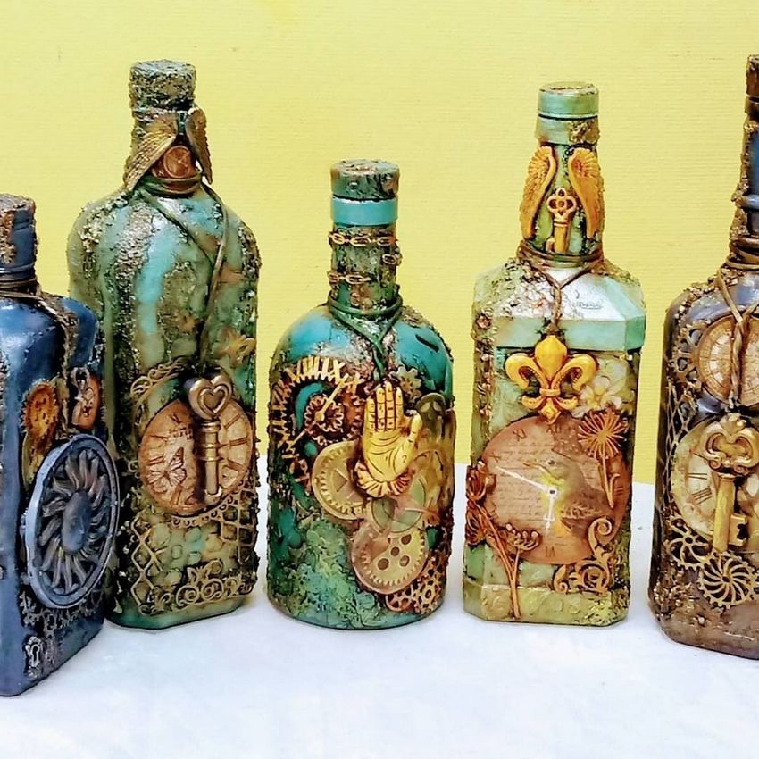 Les bouteilles en verre coloré joliment décorées de motifs ou entièrement recouvertes d'images thématiques sont des ajouts originaux à une composition intérieure. Ils peuvent non seulement servir de décorations, mais aussi être utilisés pour fabriquer des vases intéressants et inhabituels pour les fleurs ou être offerts comme cadeau de fête exclusif.