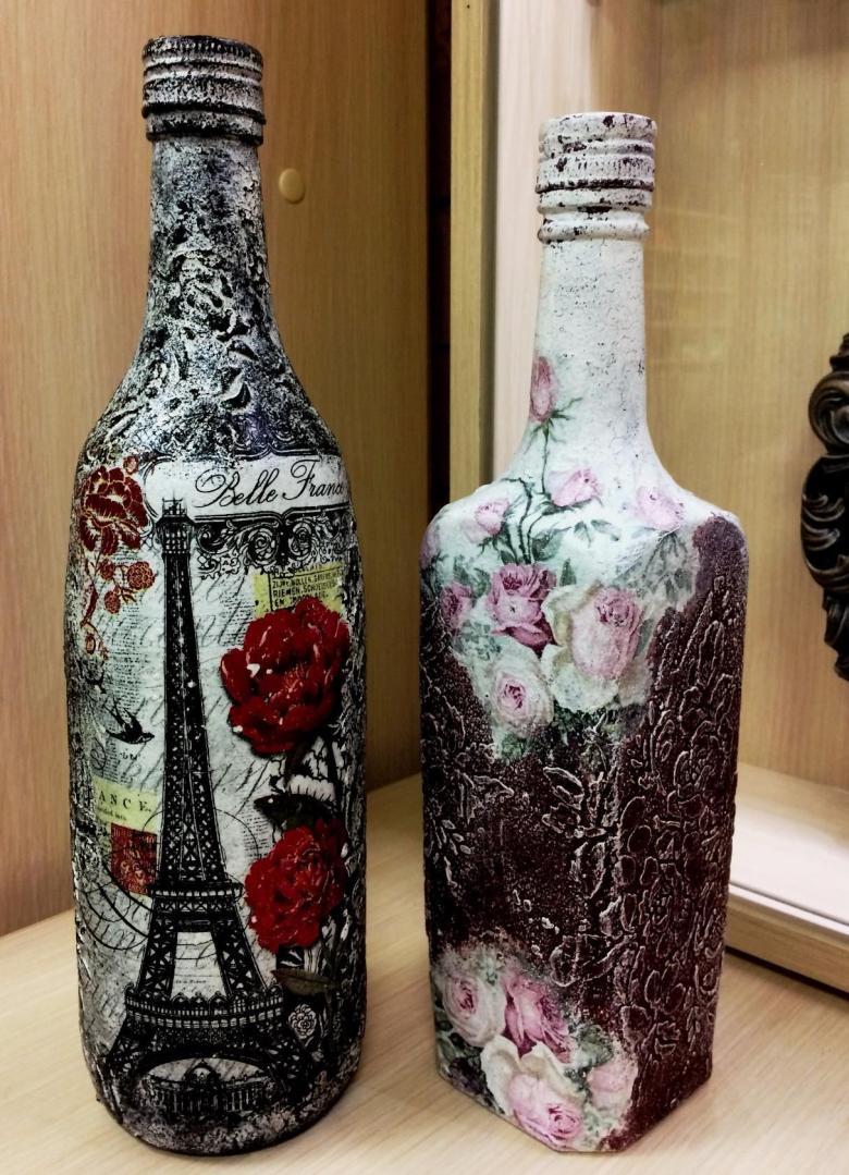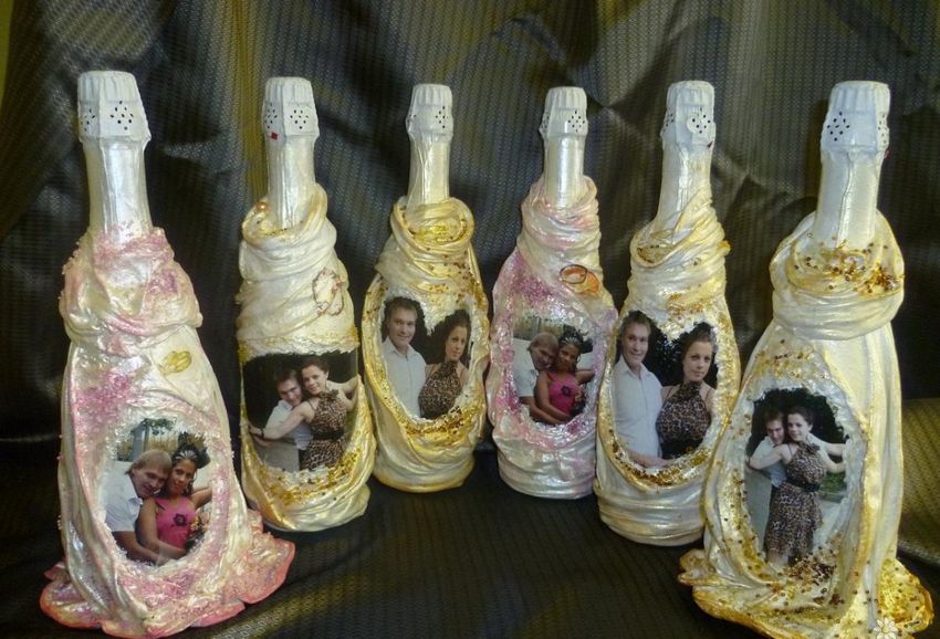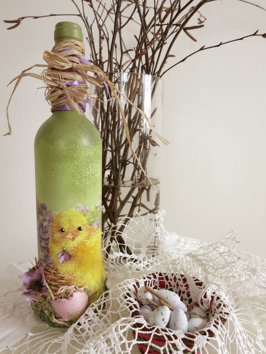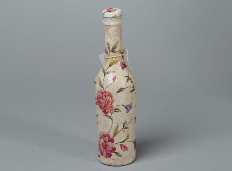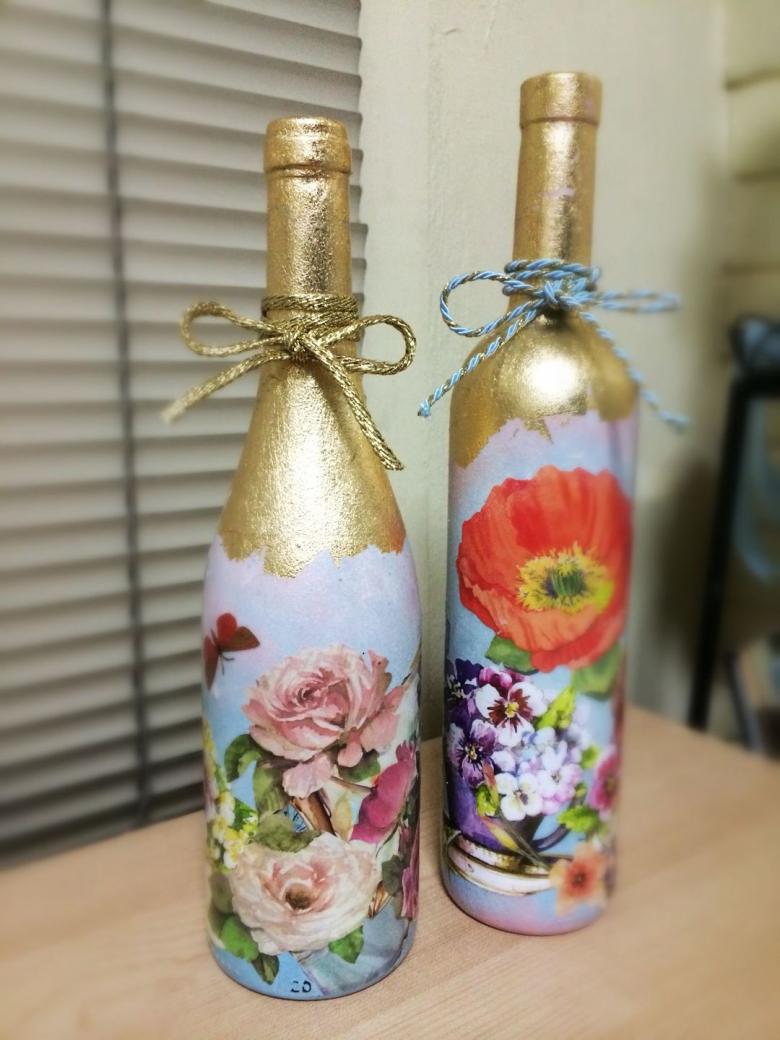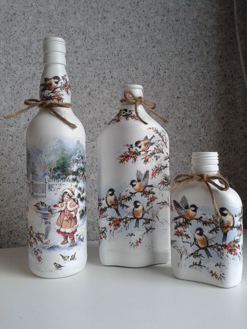 Outre les mouchoirs en papier et les cartes spéciales, le découpage de bouteilles est réalisé avec du papier toilette, un cours de maître comportant les mêmes étapes. Grâce à la technique de l'applique, des décorations supplémentaires, telles que des rubans et de la dentelle, des perles et même des coquilles d'œuf, peuvent donner au produit fini un aspect très original.