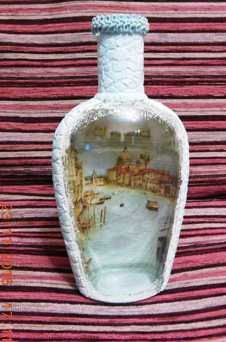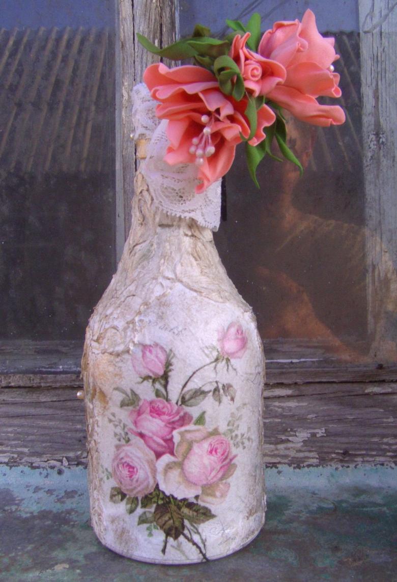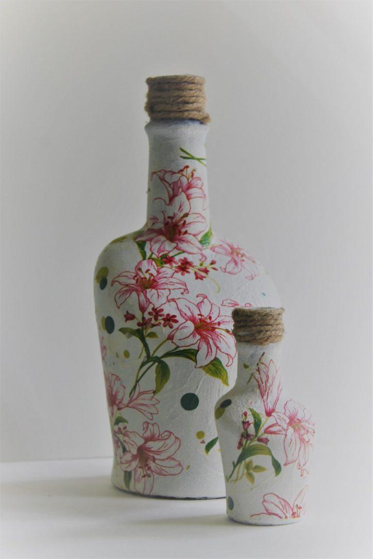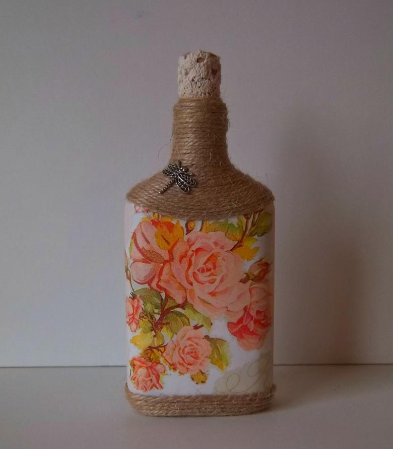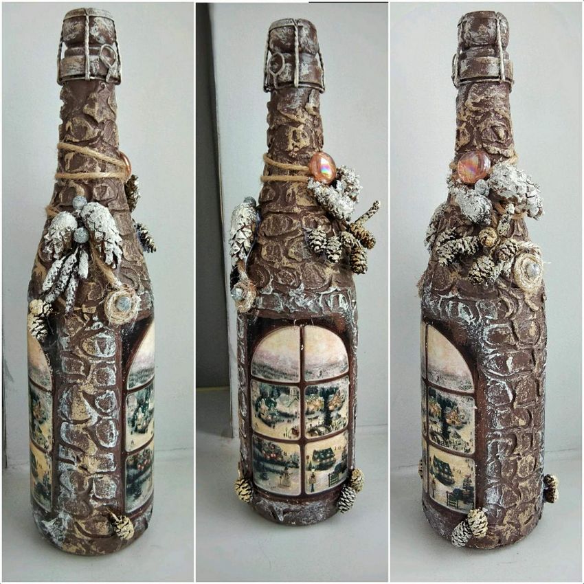 Outre les mouchoirs en papier et les cartes spéciales, le découpage de bouteilles est réalisé avec du papier toilette, un cours de maître comportant les mêmes étapes. Grâce à la technique de l'applique, des décorations supplémentaires, telles que des rubans et de la dentelle, des perles et même des coquilles d'œuf, peuvent donner au produit fini un aspect très original.