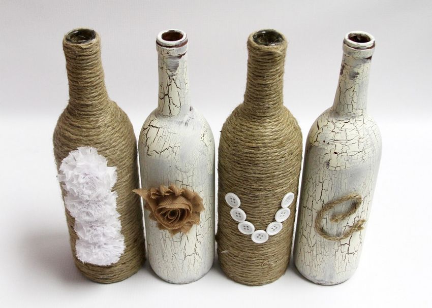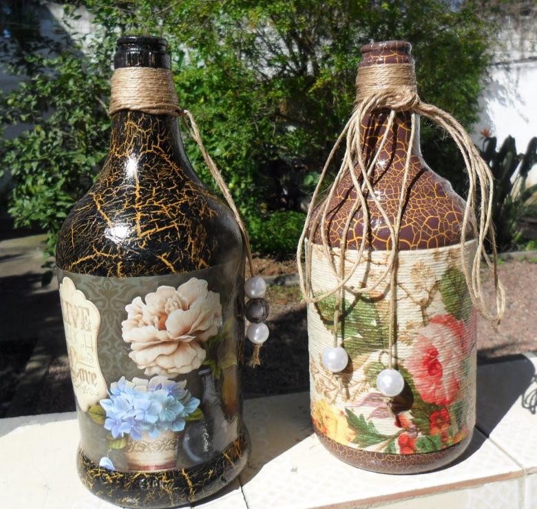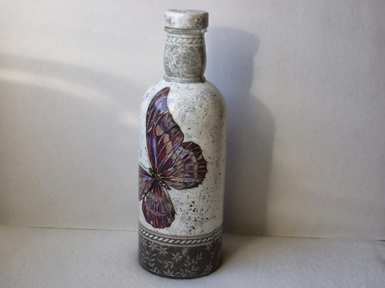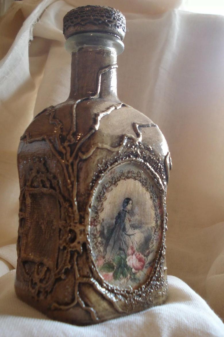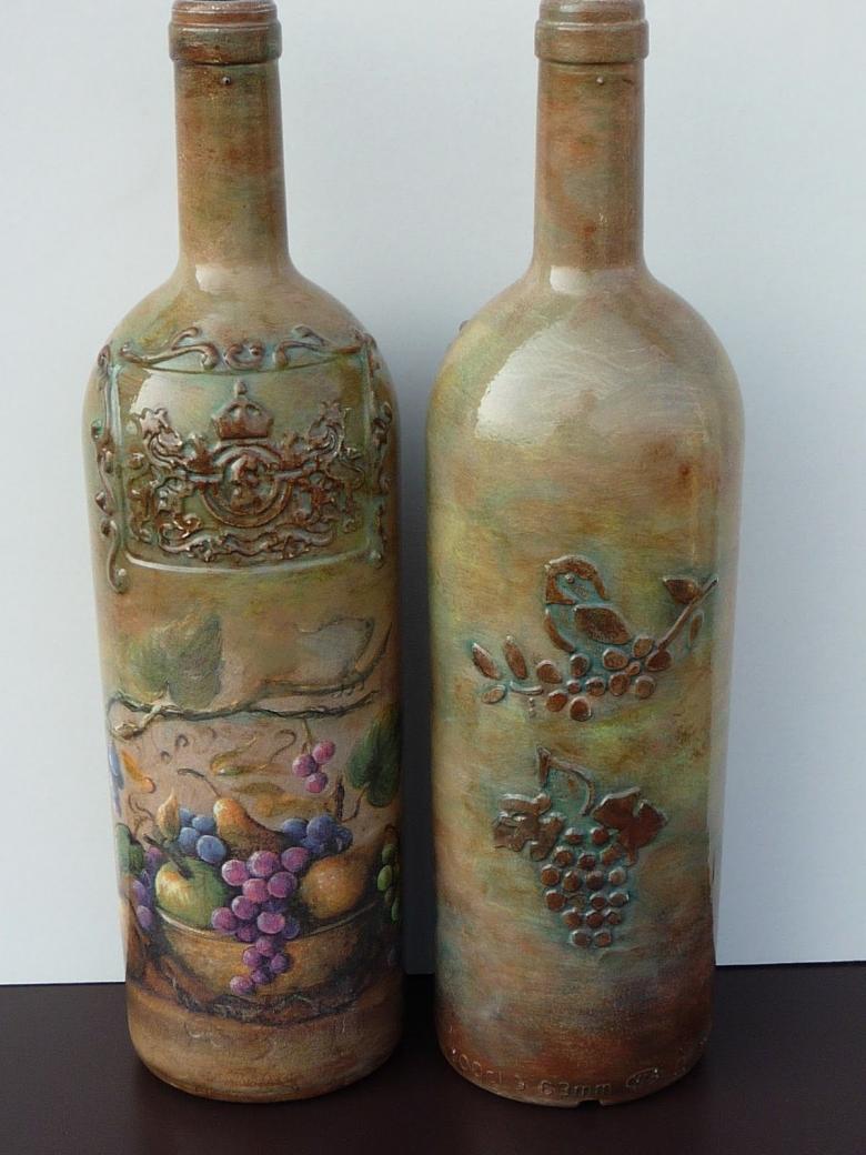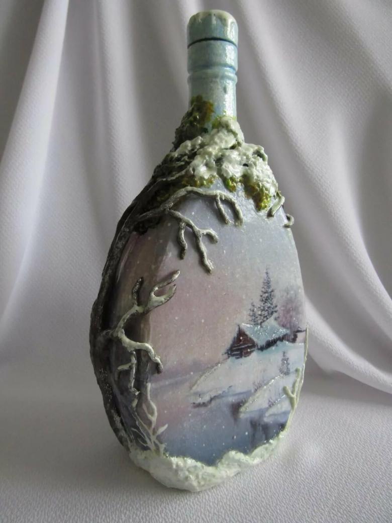 Outre les mouchoirs en papier et les cartes spéciales, le découpage de bouteilles est réalisé avec du papier toilette, un cours de maître comportant les mêmes étapes. Grâce à la technique de l'applique, des décorations supplémentaires, telles que des rubans et de la dentelle, des perles et même des coquilles d'œuf, peuvent donner au produit fini un aspect très original.