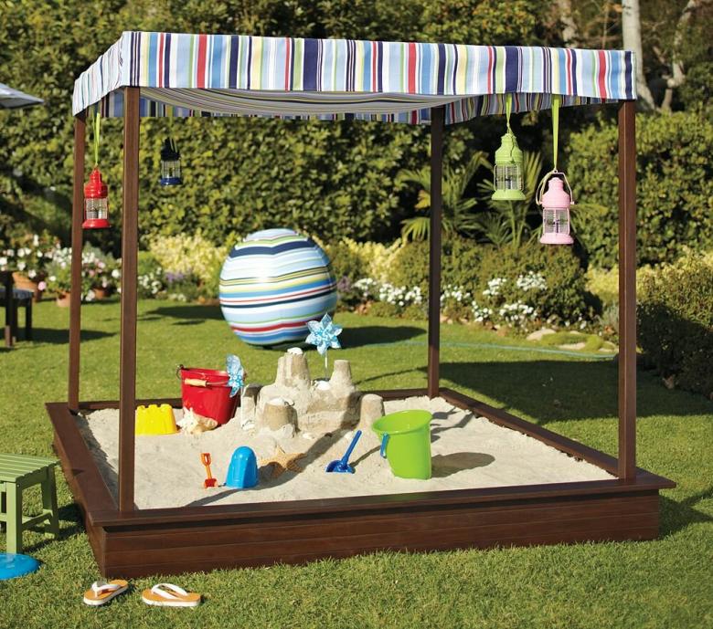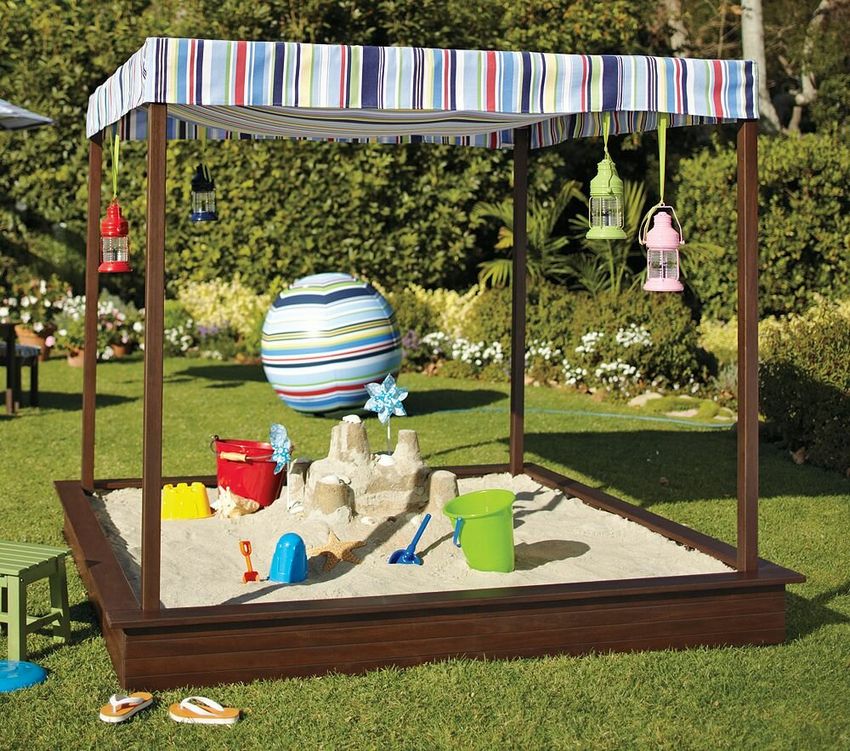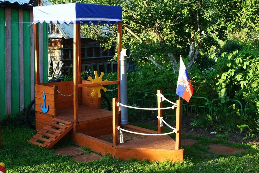 Le bac à sable peut être traditionnellement carré, ou vous pouvez faire un triangle d'un navire avec une voile centrale ou un rectangle d'une voiture avec un volant et des roues.