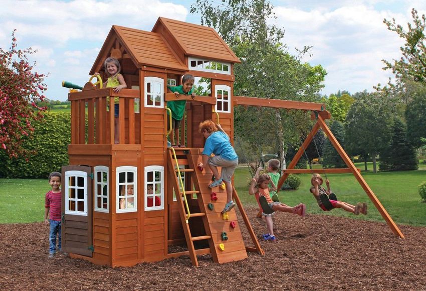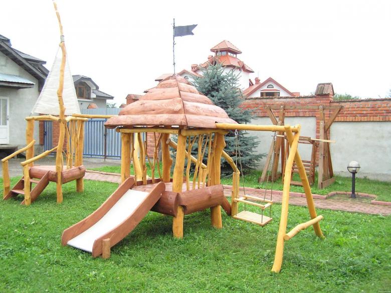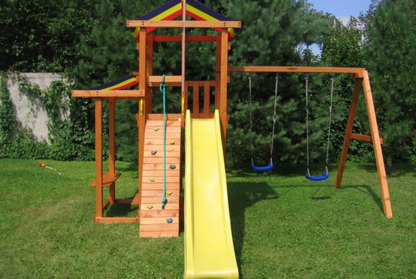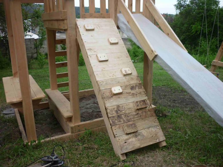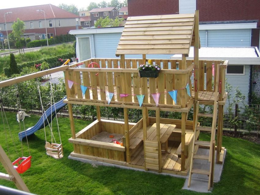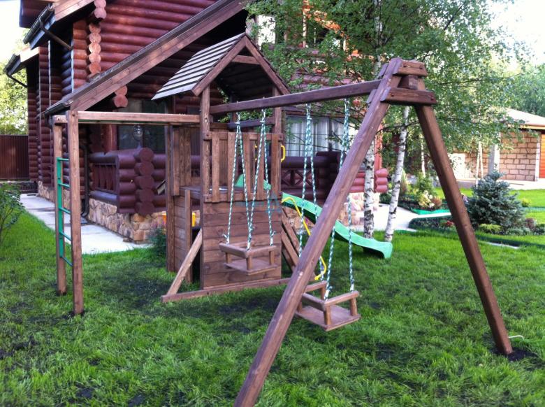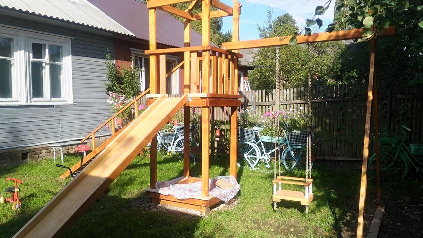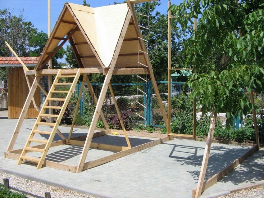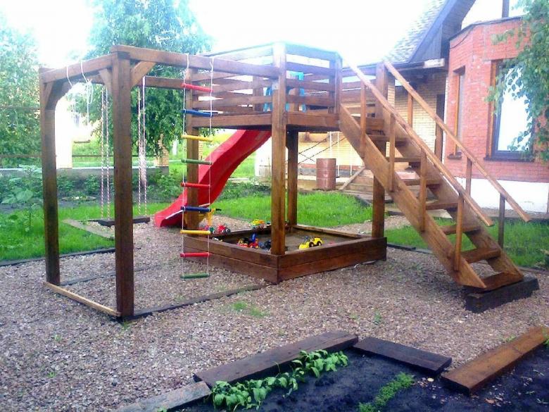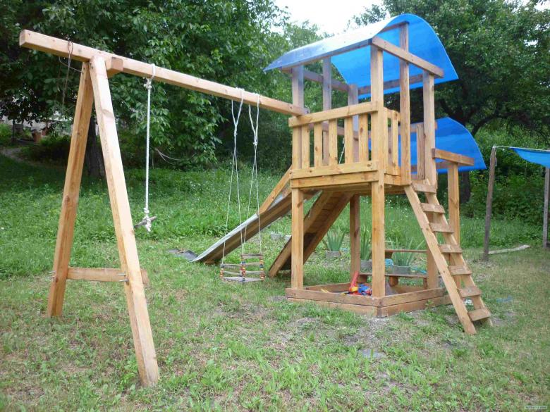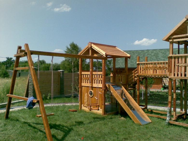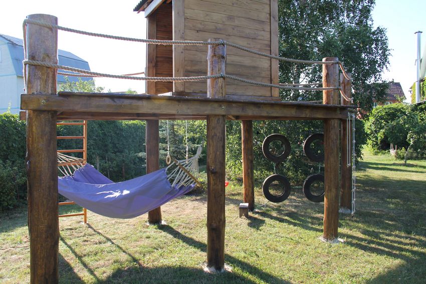 Le plus souvent créé terrain de jeu en bois fabriqué de leurs propres mains. Les éléments supplémentaires peuvent être de vieux pneus de voiture ou des cordes tendues.
