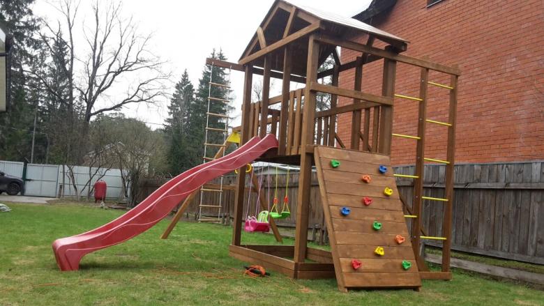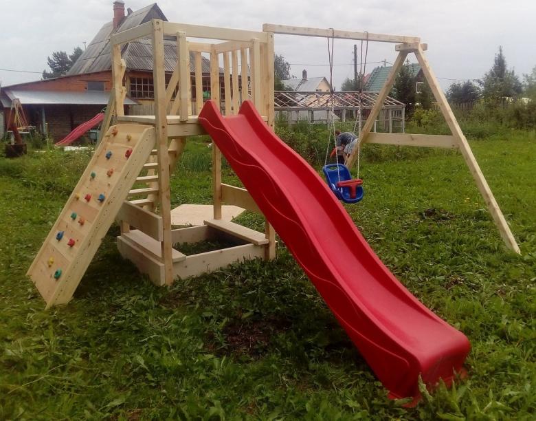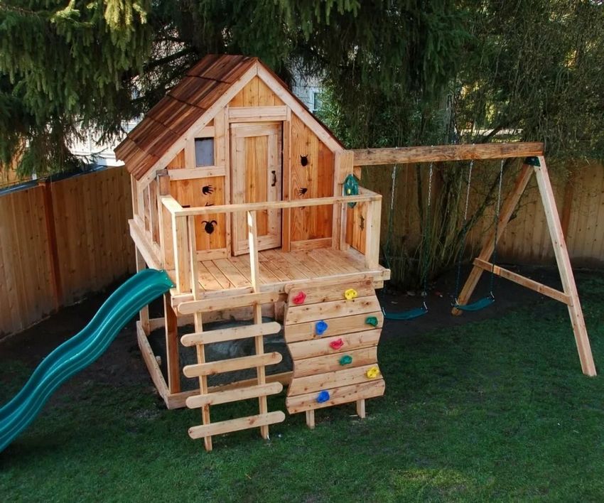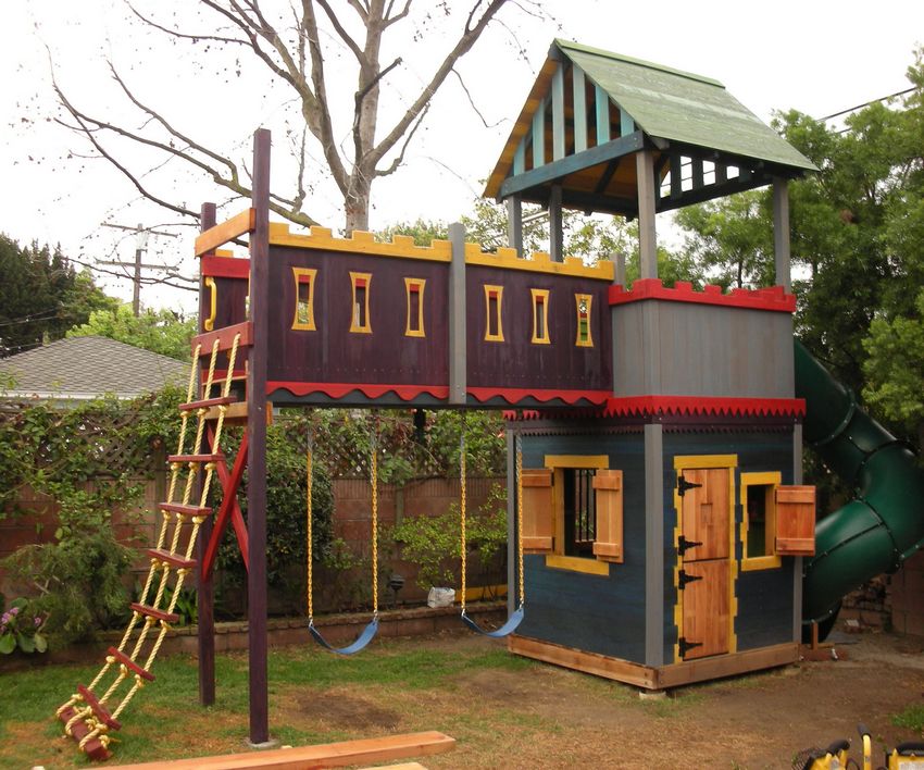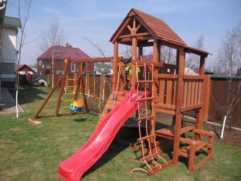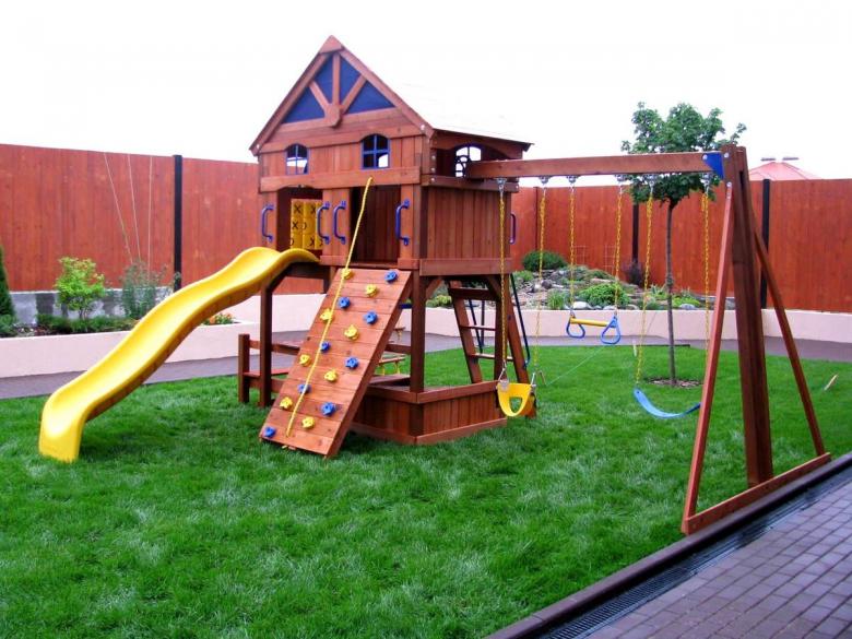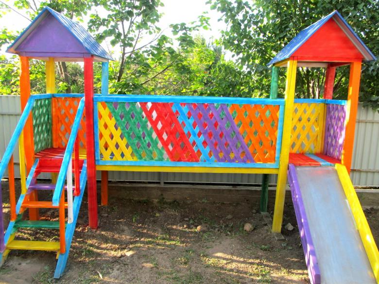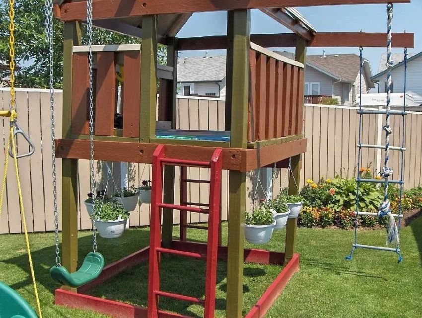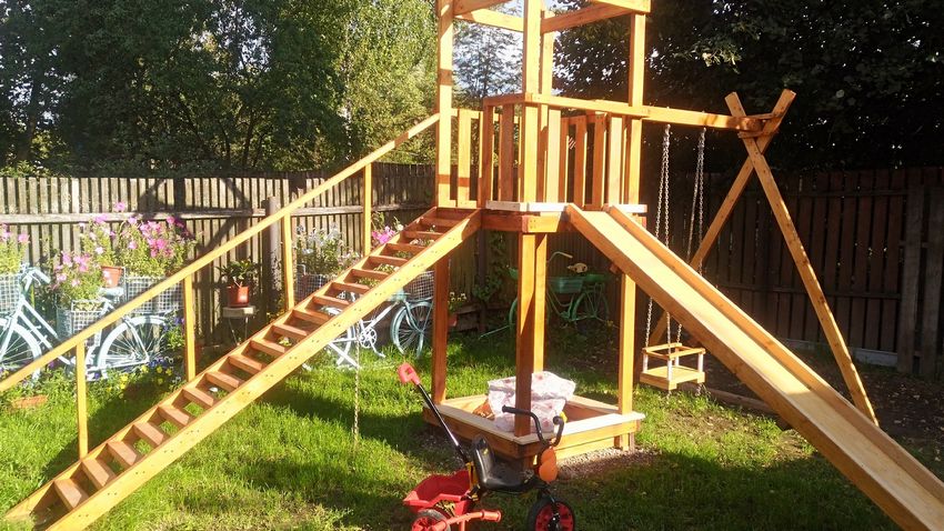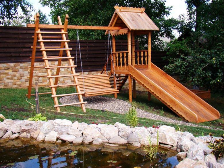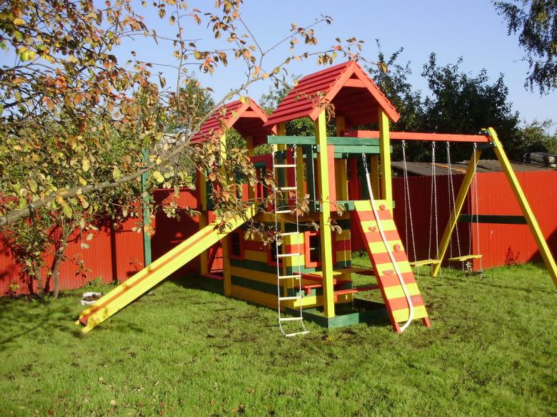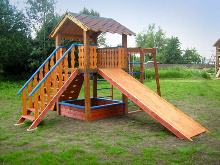 Le plus souvent créé terrain de jeu en bois fabriqué de leurs propres mains. Les éléments supplémentaires peuvent être de vieux pneus de voiture ou des cordes tendues.